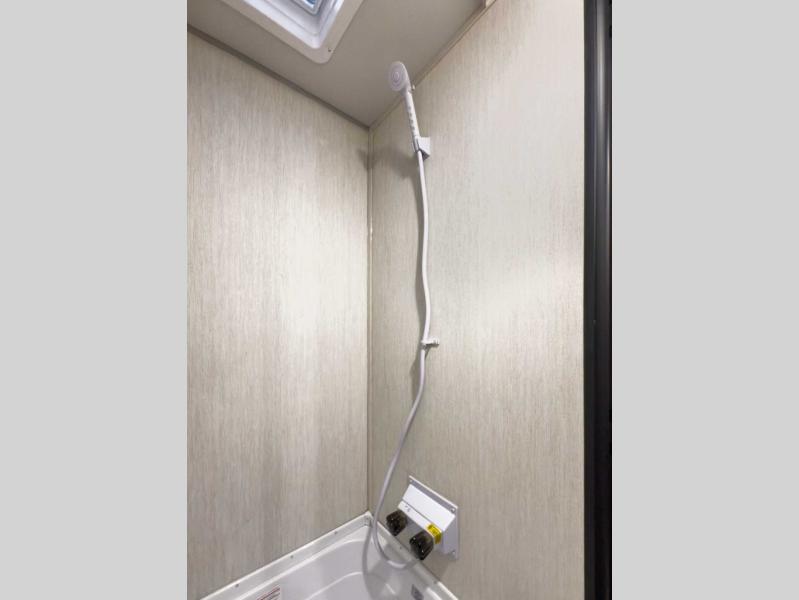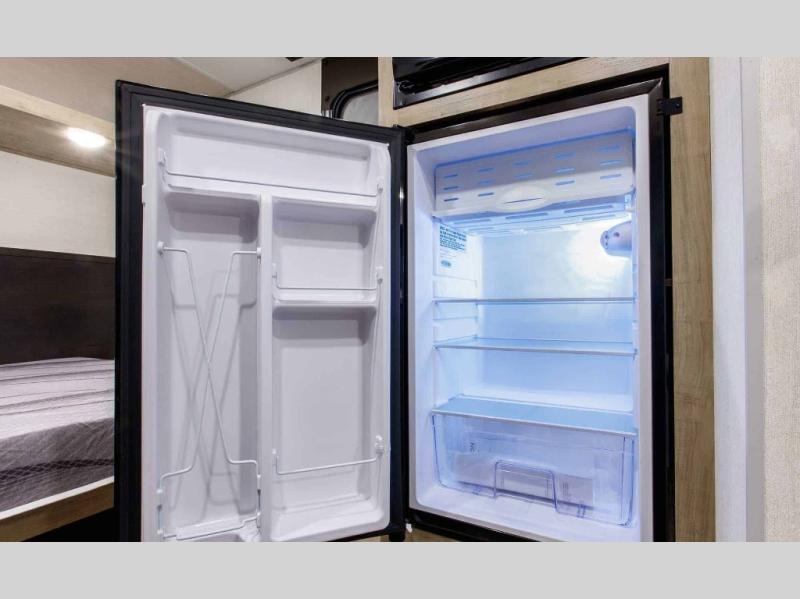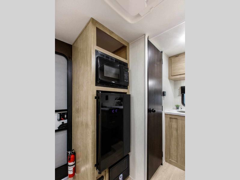 You will be enchanted by this travel trailer! The bathroom is equipped with everything you need for a comfortable stay. The kitchen is equipped with a refrigerator for keeping drinks and perishables fresh, a microwave for quick reheating, and a cooktop for preparing meals. The sofa provides a comfortable seating area for relaxation and an extra sleeping area. Overhead cabinets and a shelf provide additional storage for essentials, cookware, and dishes. The queen-sized bed allows a comfortable sleeping space, perfect for unwinding after a long day.