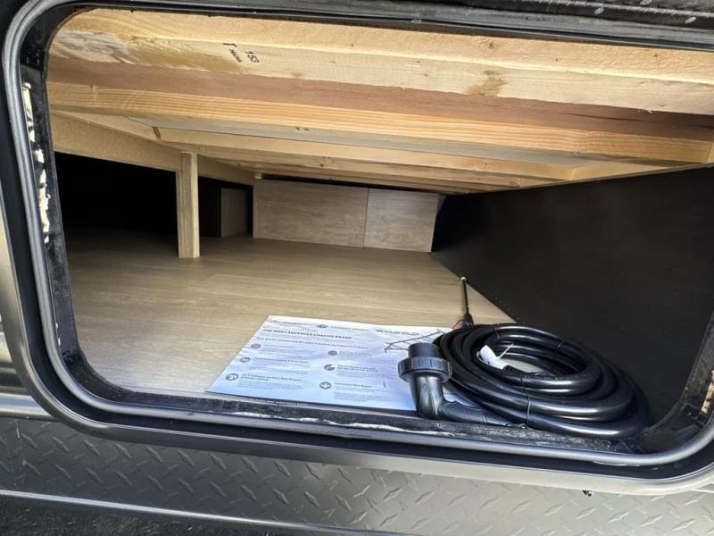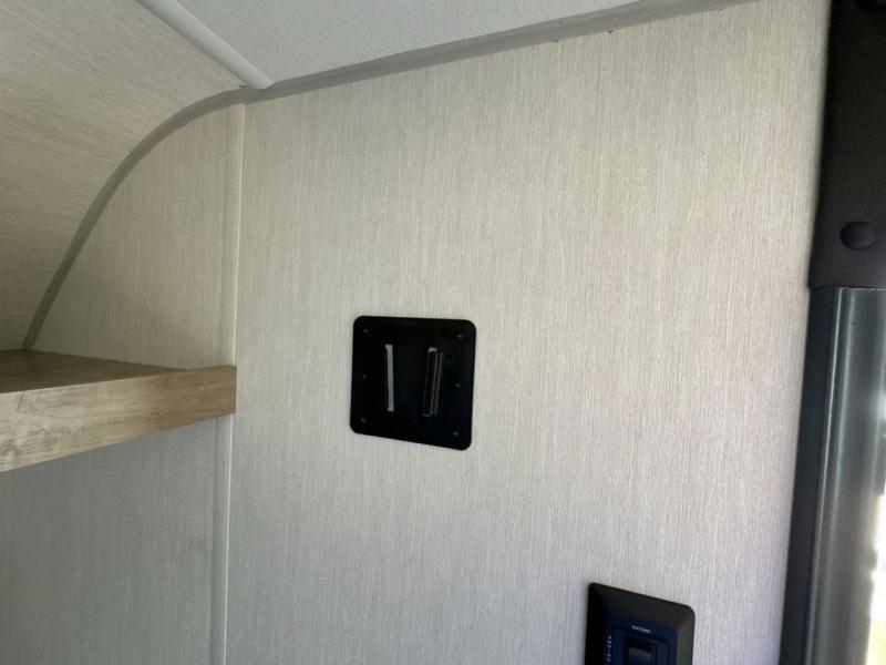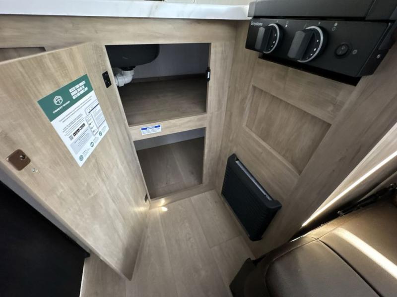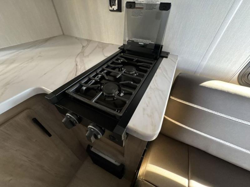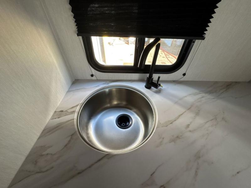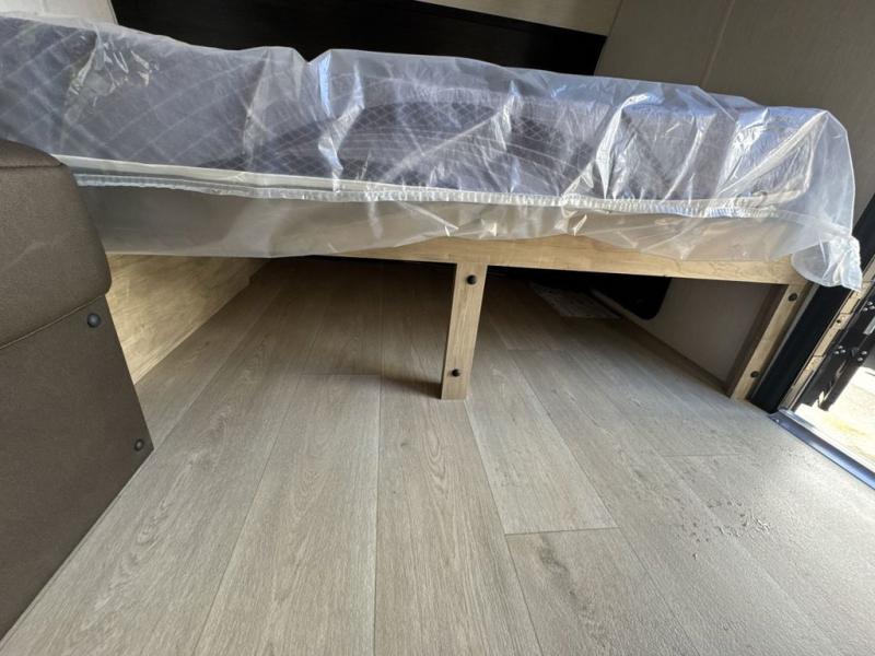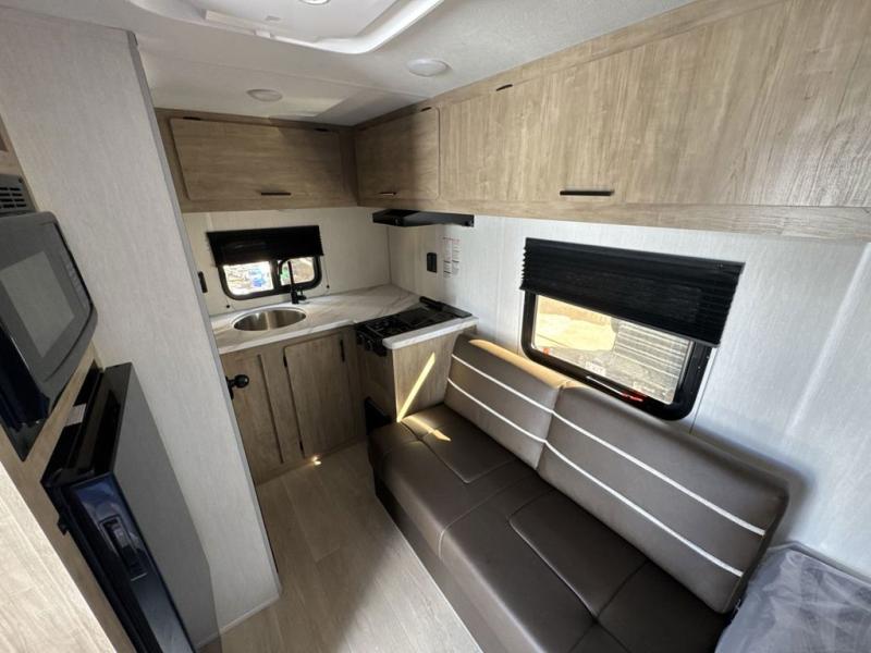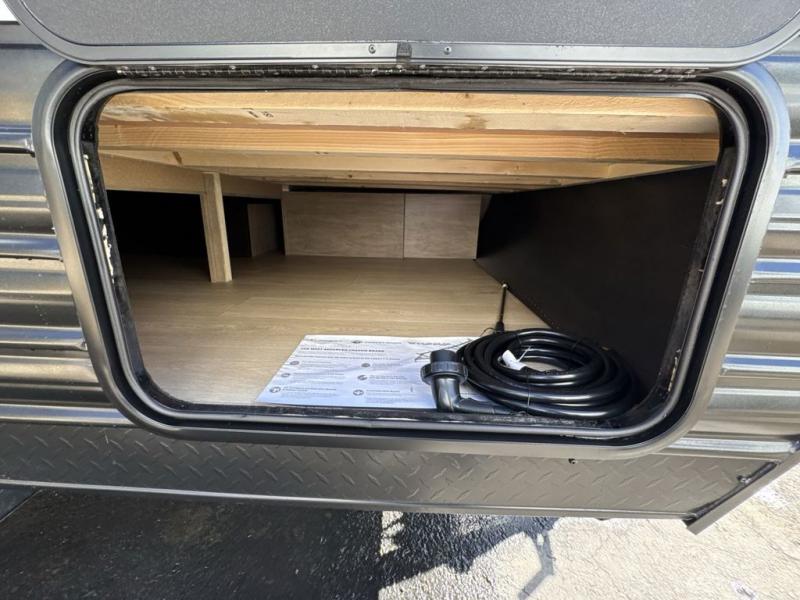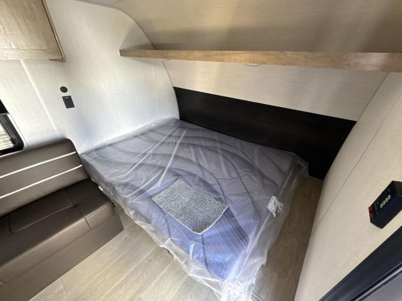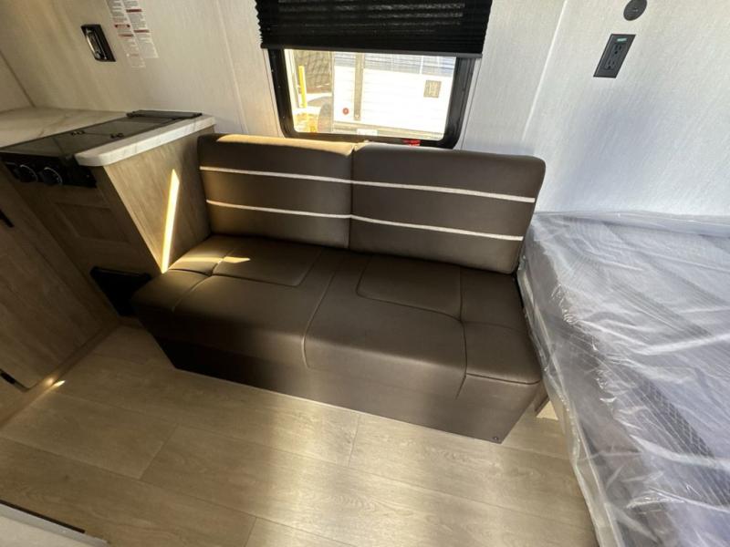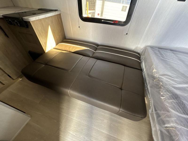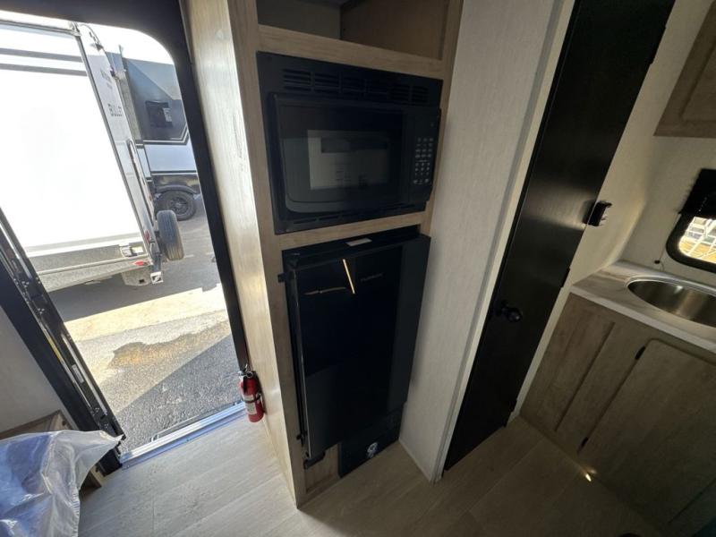 You will be enchanted by this travel trailer! The bathroom is equipped with everything you need for a comfortable stay. The kitchen is equipped with a refrigerator for keeping drinks and perishables fresh, a microwave for quick reheating, and a cooktop for preparing meals. The sofa provides a comfortable seating area for relaxation and an extra sleeping area. Overhead cabinets and a shelf provide additional storage for essentials, cookware, and dishes. The queen-sized bed allows a comfortable sleeping space, perfect for unwinding after a long day.