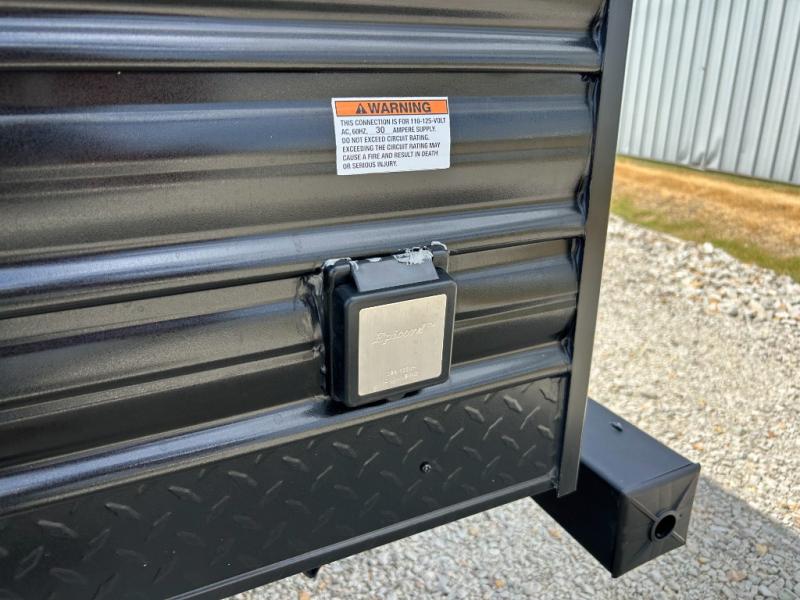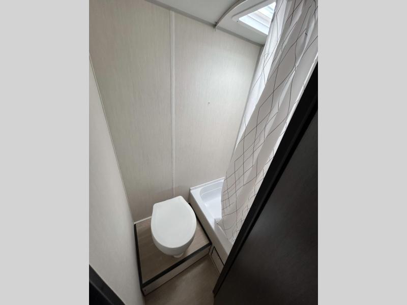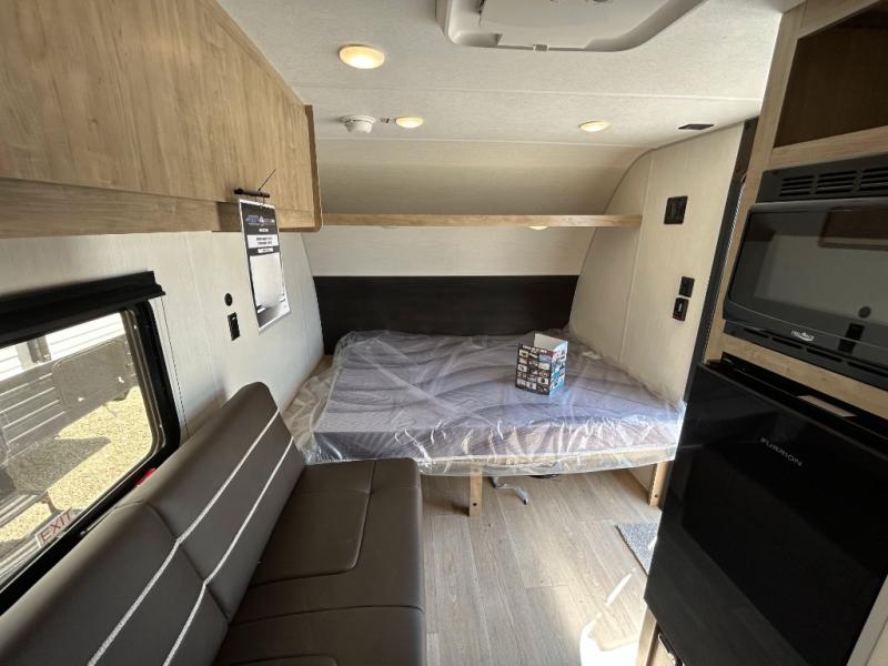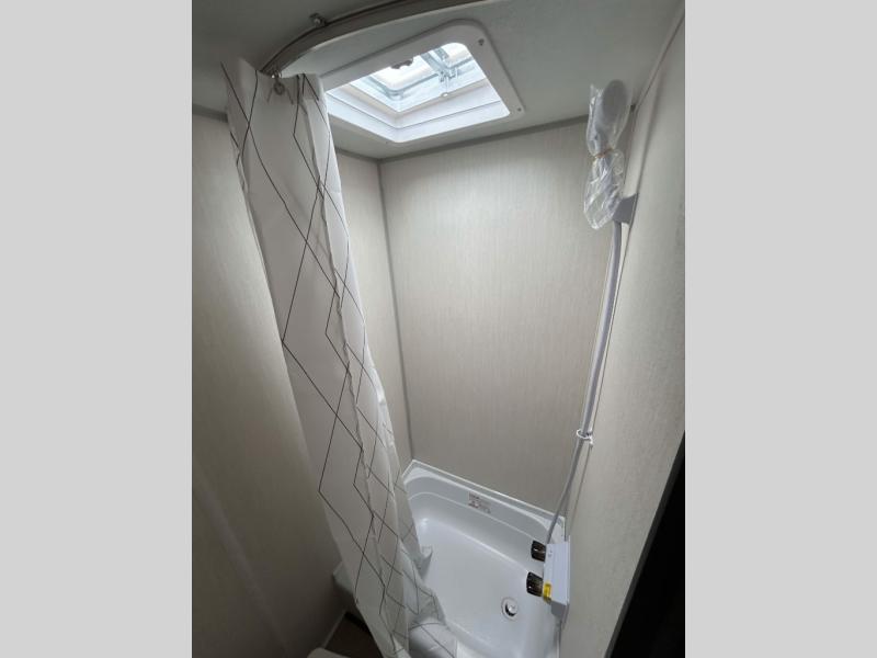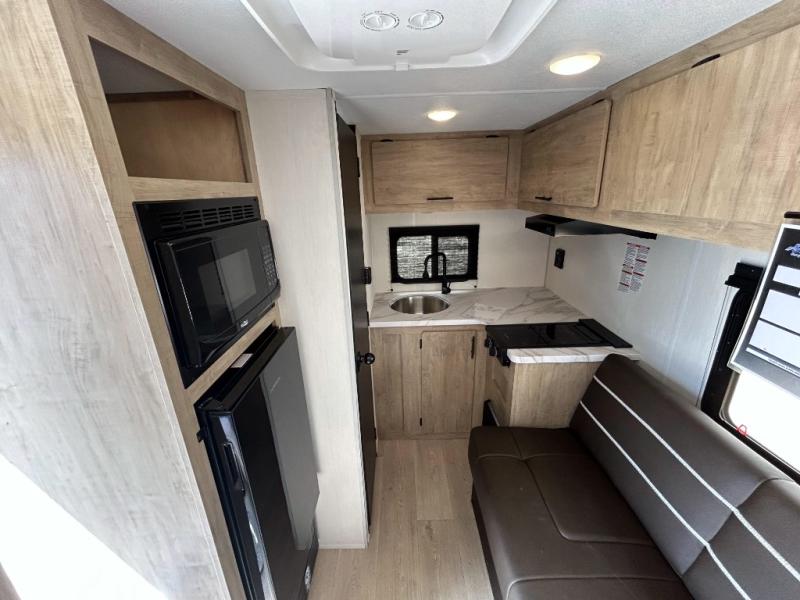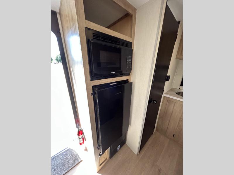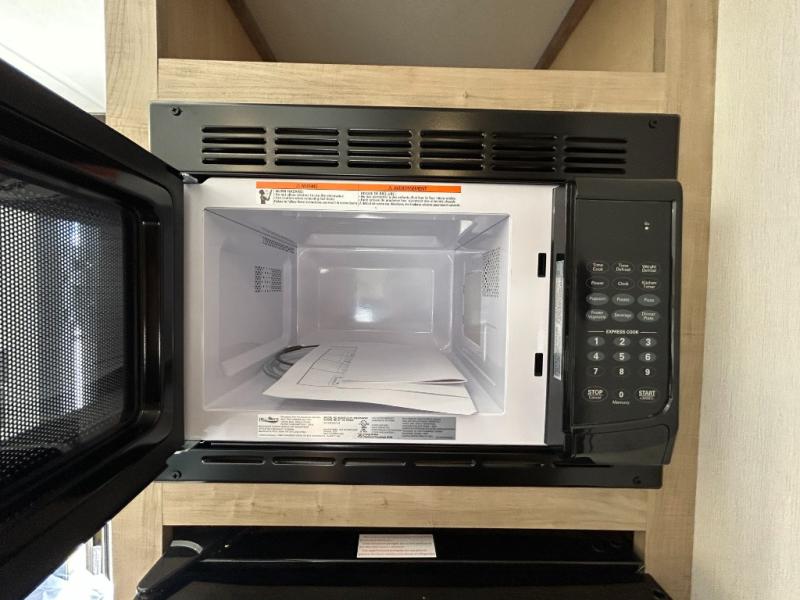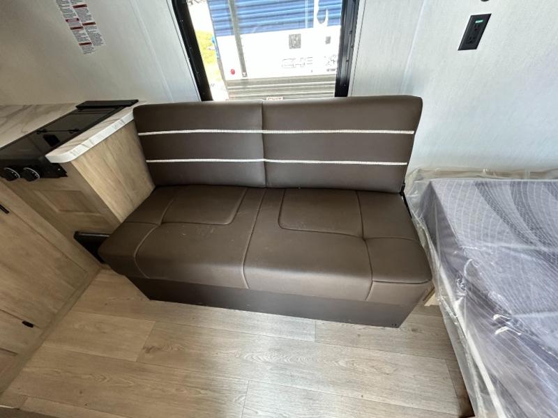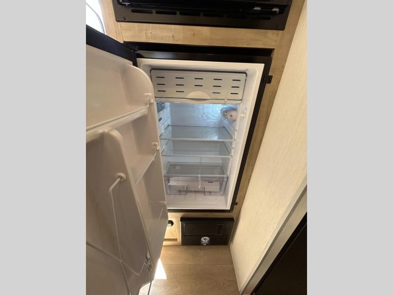 You and your partner will be enchanted by this travel trailer! The bathroom is equipped with everything you need for a comfortable stay. The kitchen is equipped with a refrigerator for keeping drinks and perishables fresh, a microwave for quick reheating, and a cooktop for preparing meals. The sofa provides a comfortable seating area for relaxation and an extra sleeping area. Overhead cabinets and a shelf provide additional storage for essentials, cookware, and dishes. The queen-sized bed allows a comfortable sleeping space, perfect for unwinding after a long day.