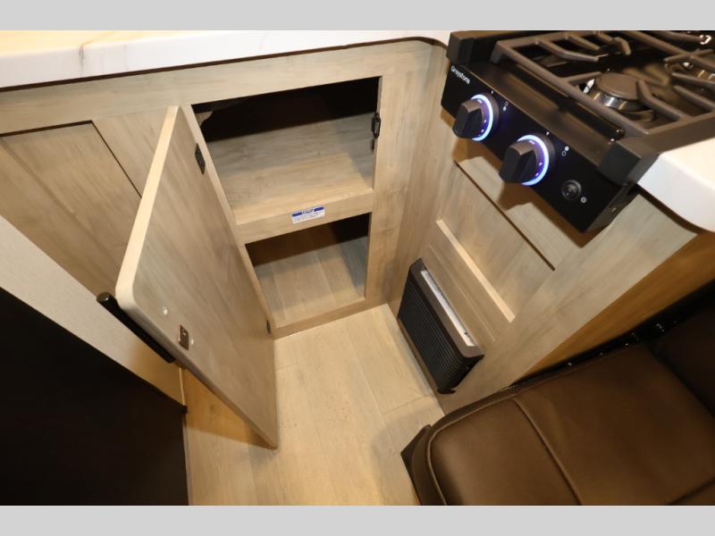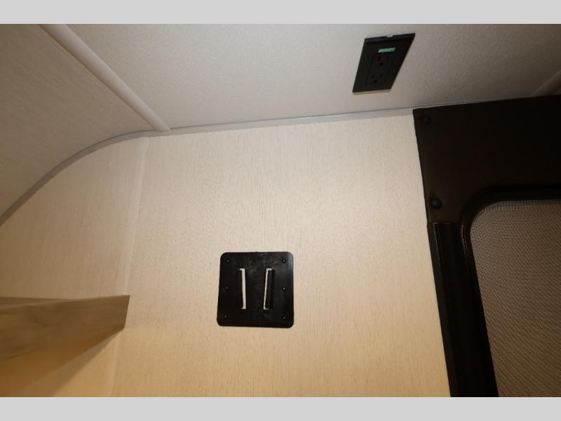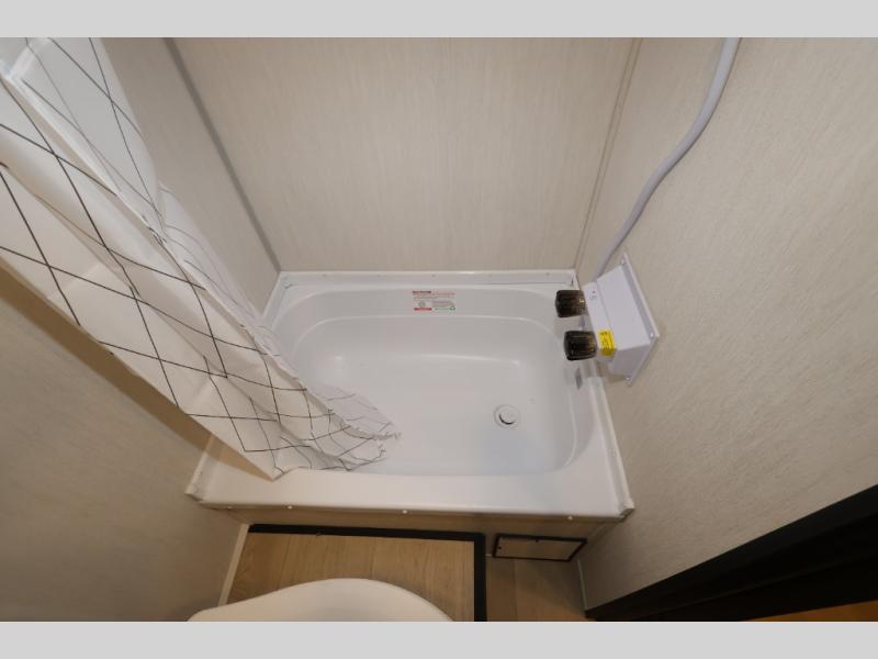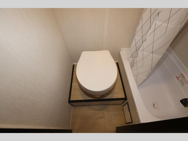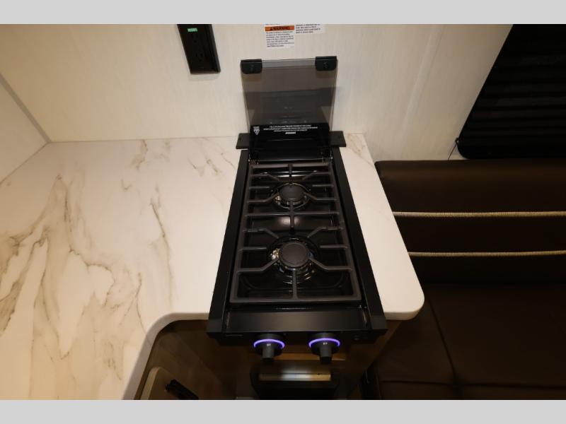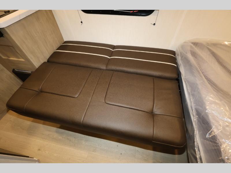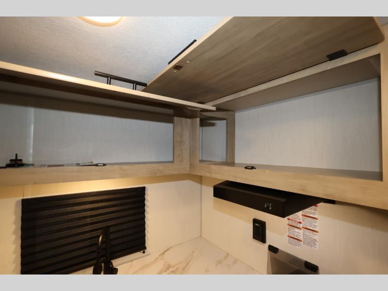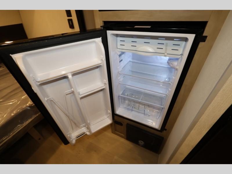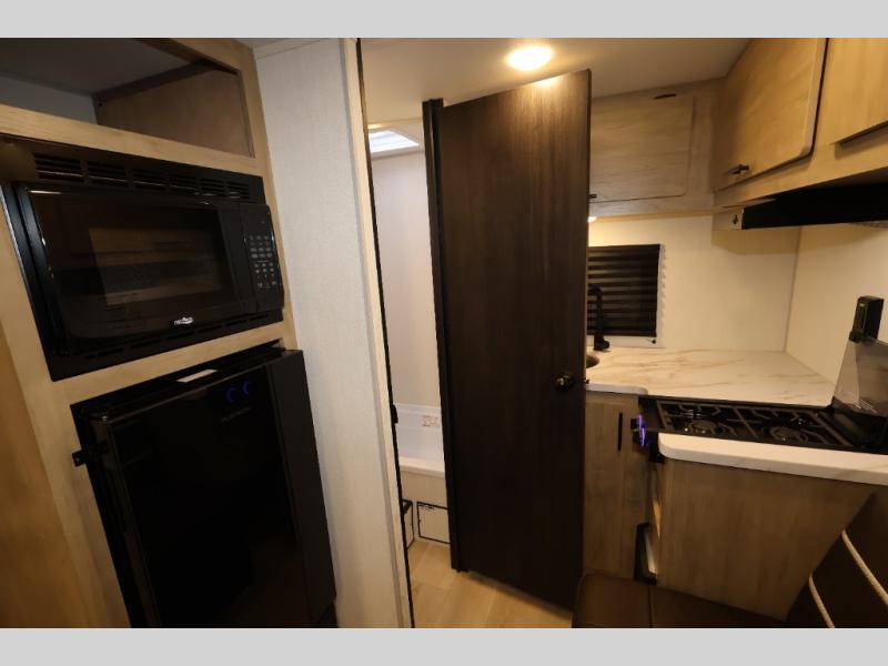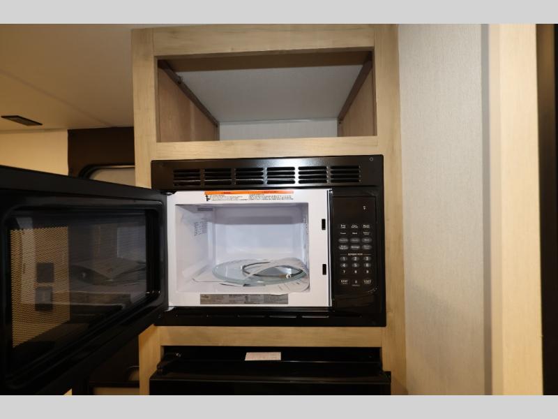 You and your partner will be enchanted by this travel trailer! The bathroom is equipped with everything you need for a comfortable stay. The kitchen is equipped with a refrigerator for keeping drinks and perishables fresh, a microwave for quick reheating, and a cooktop for preparing meals. The sofa provides a comfortable seating area for relaxation and an extra sleeping area. Overhead cabinets and a shelf provide additional storage for essentials, cookware, and dishes. The queen-sized bed allows a comfortable sleeping space, perfect for unwinding after a long day.