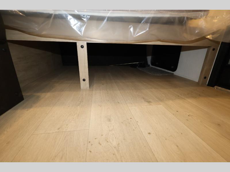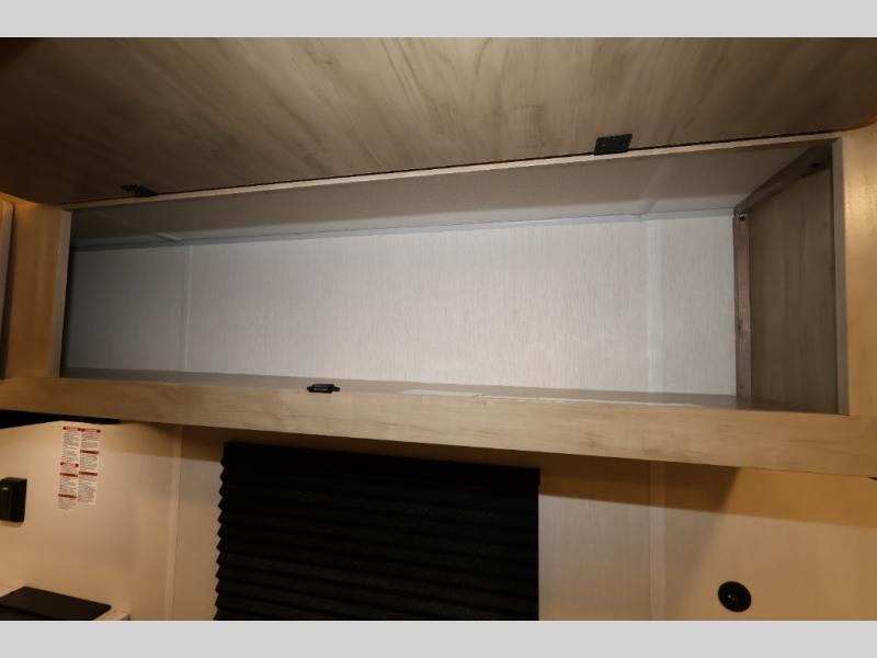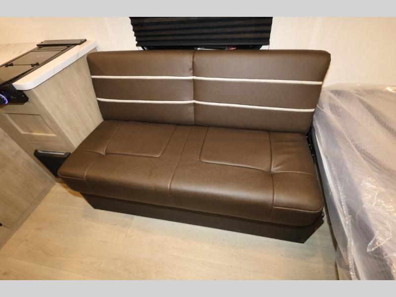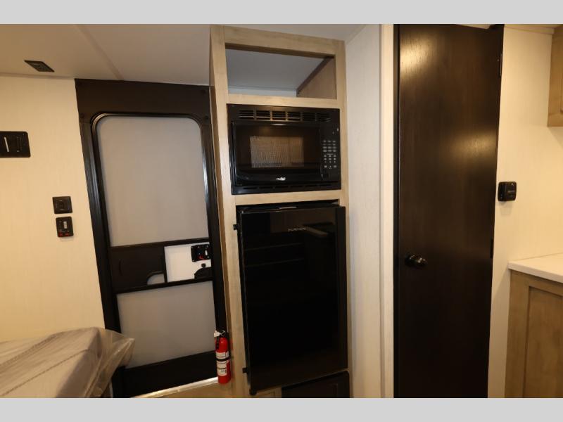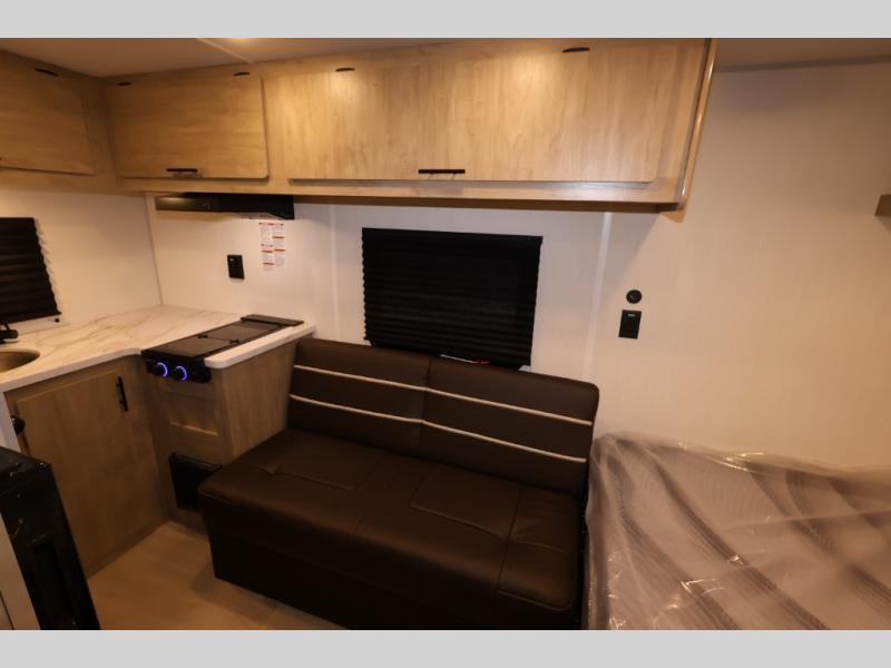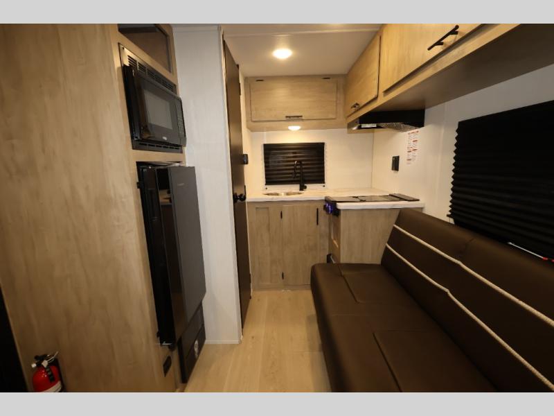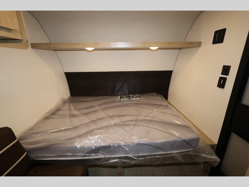 You and your partner will be enchanted by this travel trailer! The bathroom is equipped with everything you need for a comfortable stay. The kitchen is equipped with a refrigerator for keeping drinks and perishables fresh, a microwave for quick reheating, and a cooktop for preparing meals. The sofa provides a comfortable seating area for relaxation and an extra sleeping area. Overhead cabinets and a shelf provide additional storage for essentials, cookware, and dishes. The queen-sized bed allows a comfortable sleeping space, perfect for unwinding after a long day.