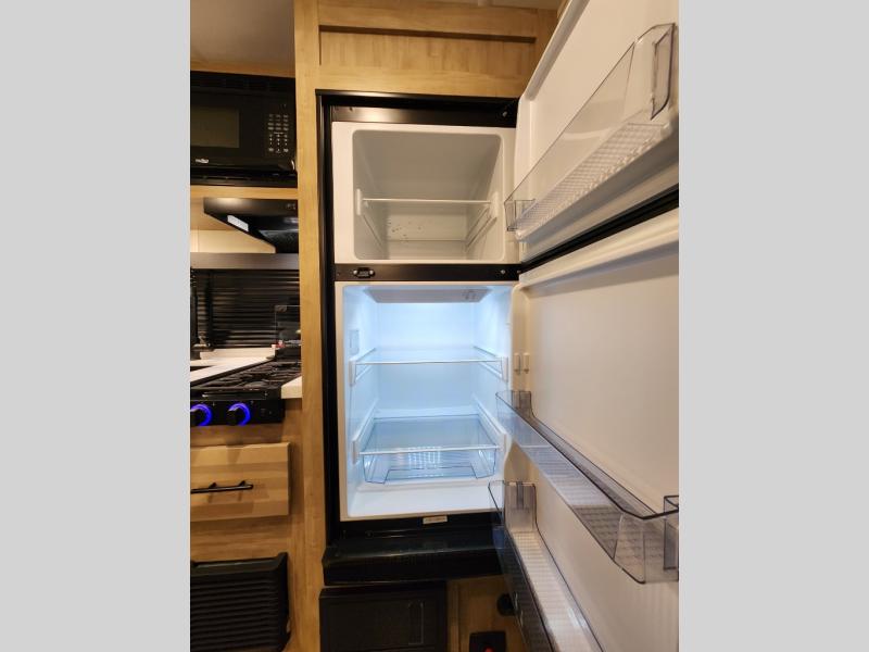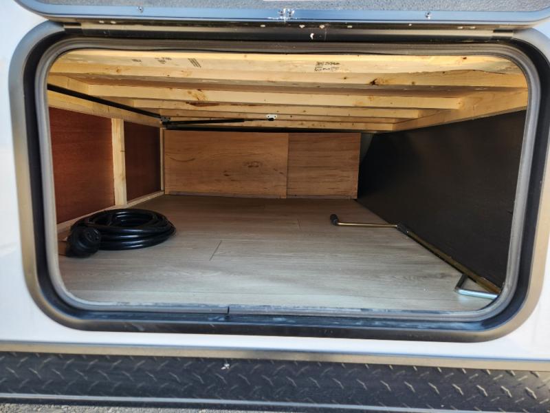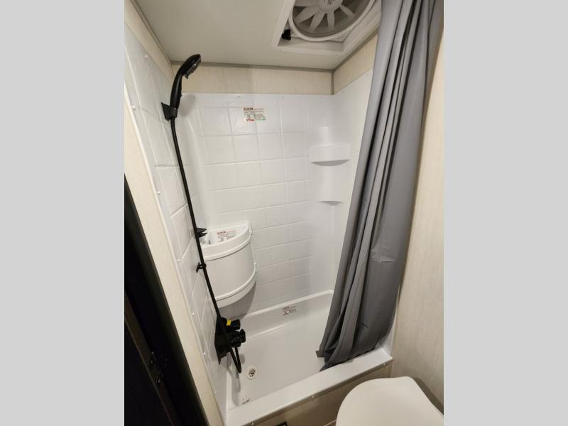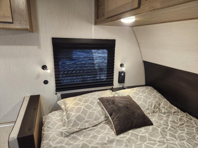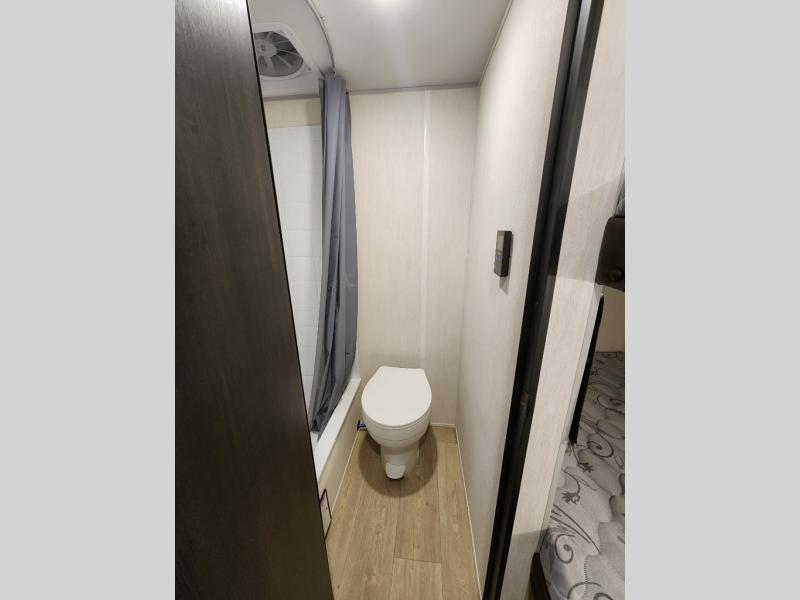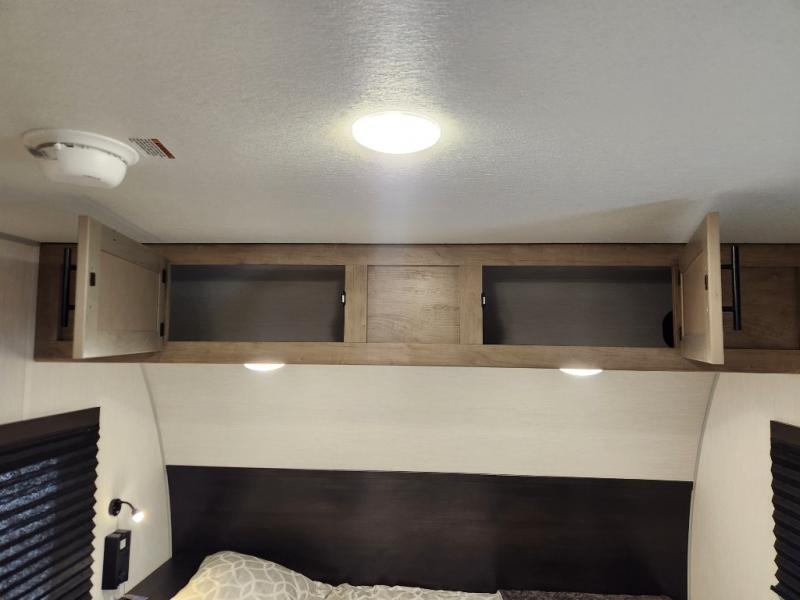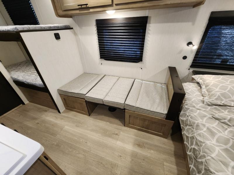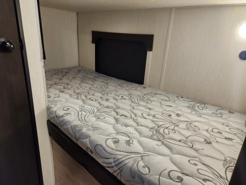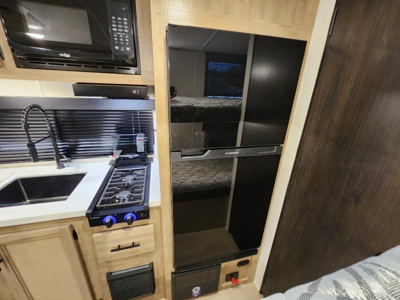 The whole family can sleep comfortably in this travel trailer! It has a set of bunk beds for the kids to sleep on, and you can sleep comfortably on the front queen bed with overhead cabinets and a shelf. There is even an exterior storage plus door that accesses the storage space under the bottom bunk. The chef will enjoy preparing their best home cooked meals either indoors with the high output cooktop or at the outside mini kitchen while staying protected by the 12' power awning!