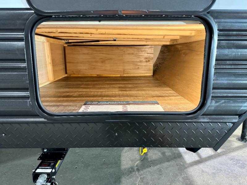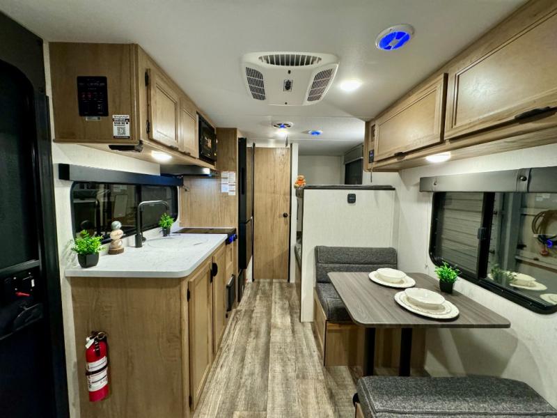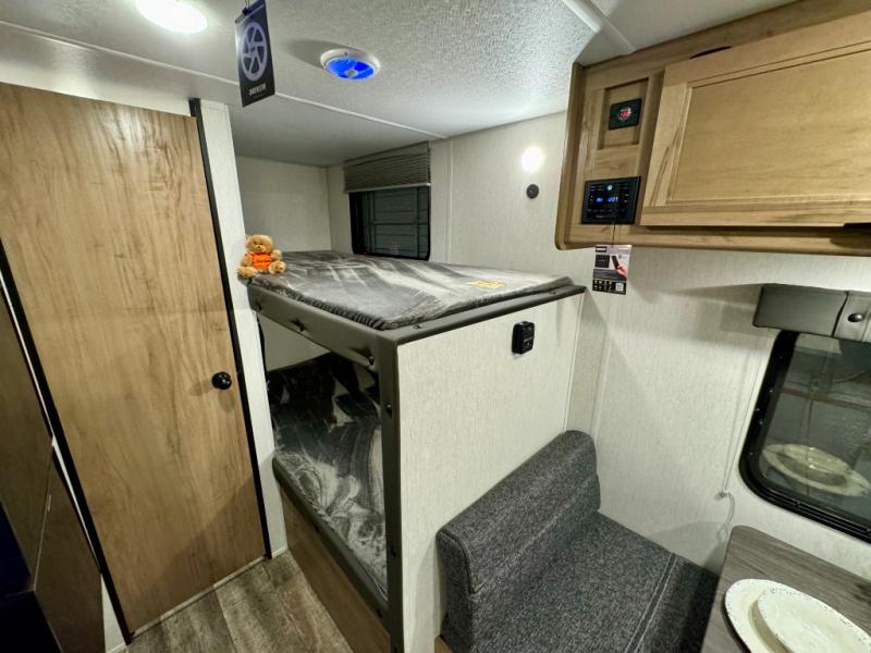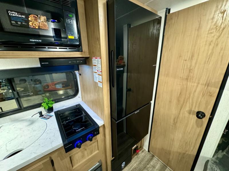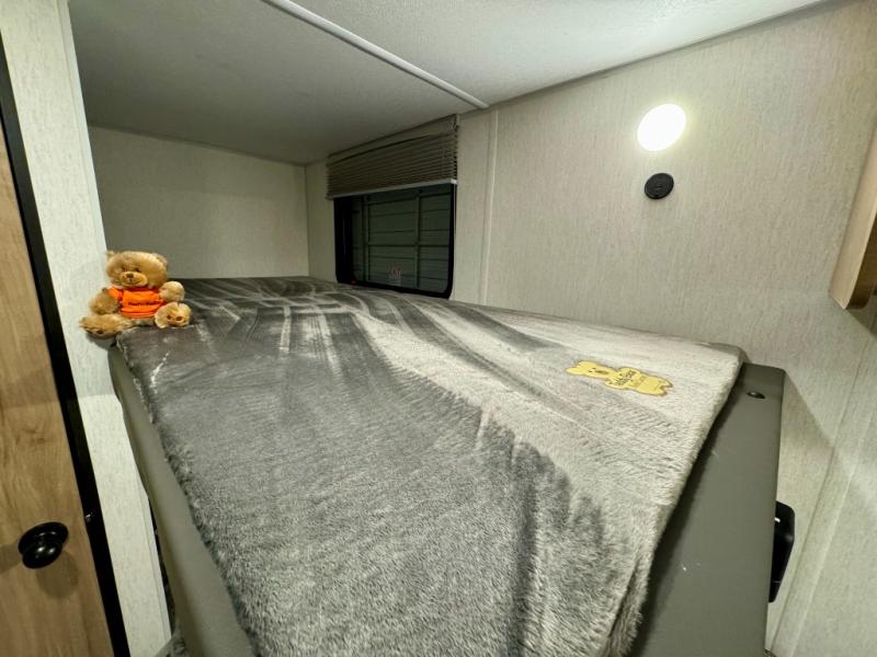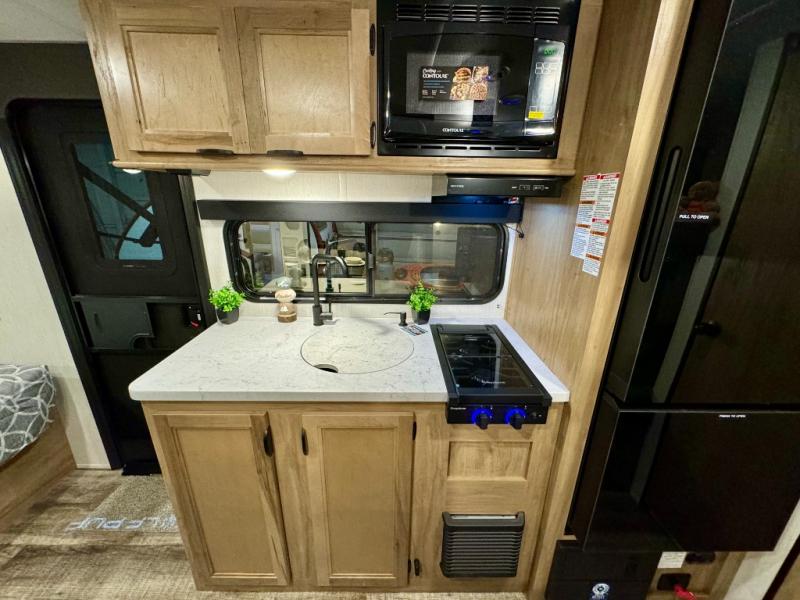 The whole family can sleep comfortably in this travel trailer! It has a set of bunk beds for the kids to sleep on, and you can sleep comfortably on the front queen bed with overhead cabinets and a shelf. There is even an exterior storage plus door that accesses the storage space under the bottom bunk. The chef will enjoy preparing their best home cooked meals either indoors with the high output cooktop or at the outside mini kitchen while staying protected by the 12' power awning!