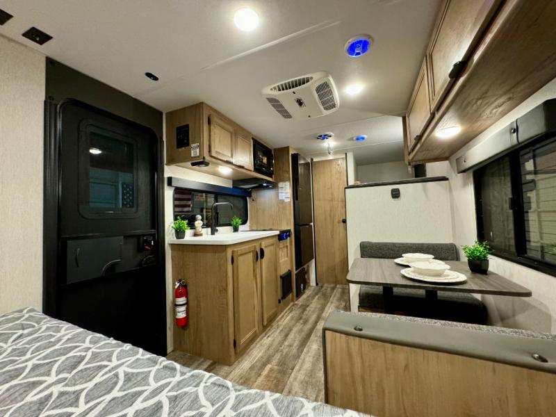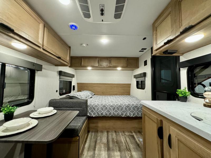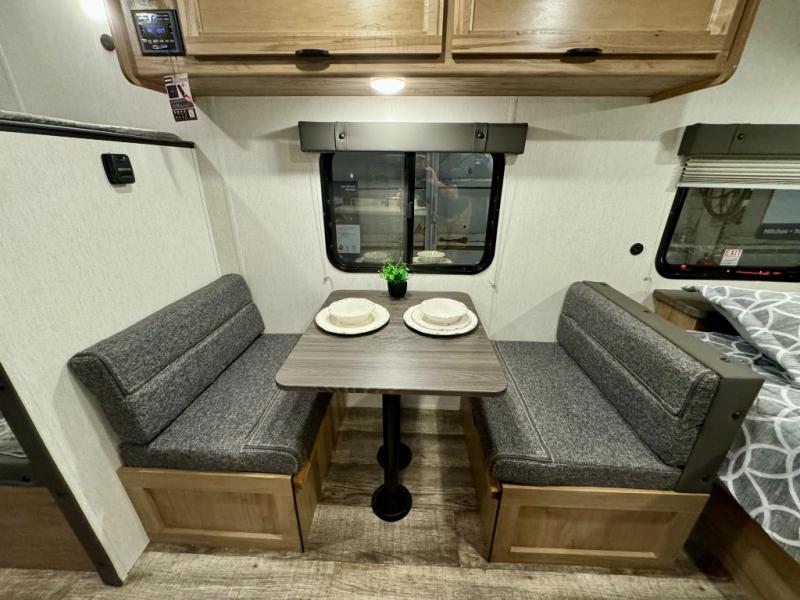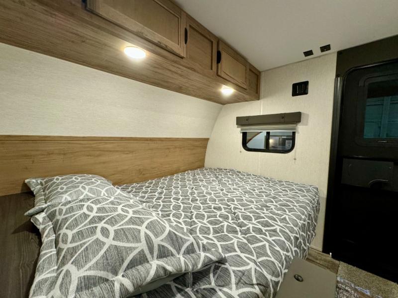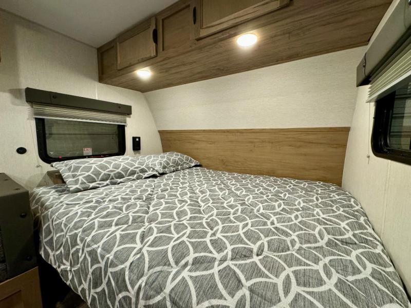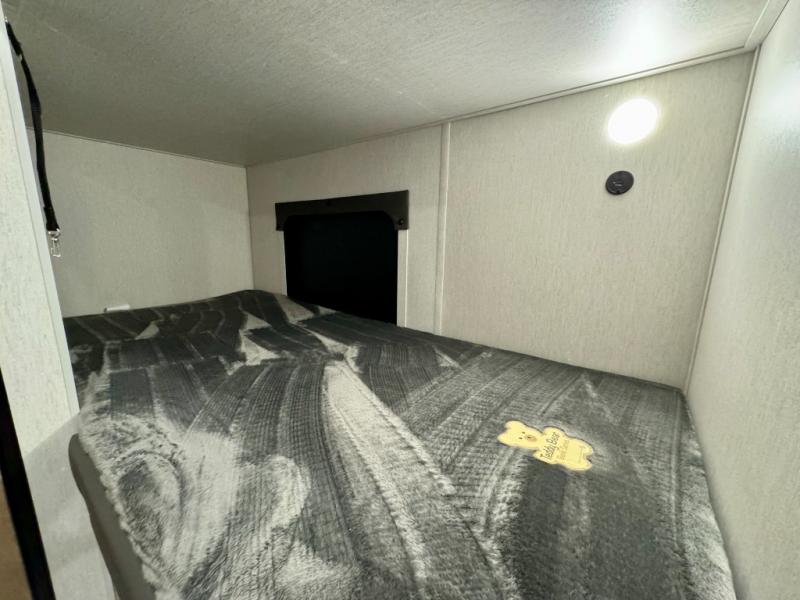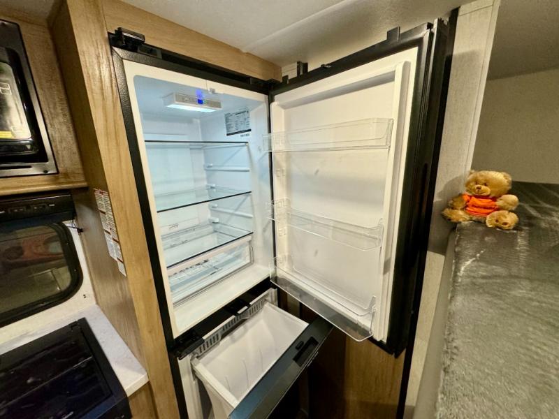 The whole family can sleep comfortably in this travel trailer! It has a set of bunk beds for the kids to sleep on, and you can sleep comfortably on the front queen bed with overhead cabinets and a shelf. There is even an exterior storage plus door that accesses the storage space under the bottom bunk. The chef will enjoy preparing their best home cooked meals either indoors with the high output cooktop or at the outside mini kitchen while staying protected by the 12' power awning!