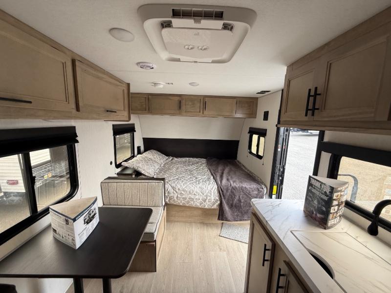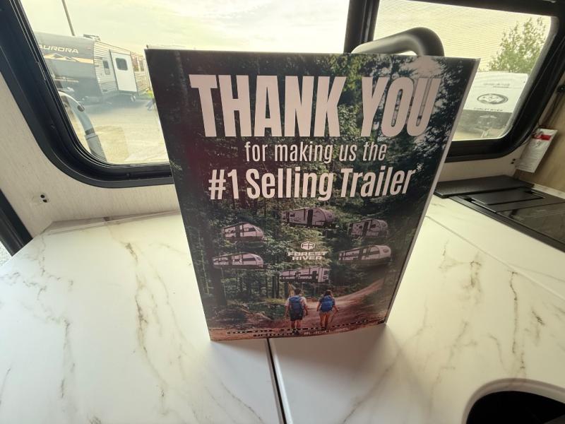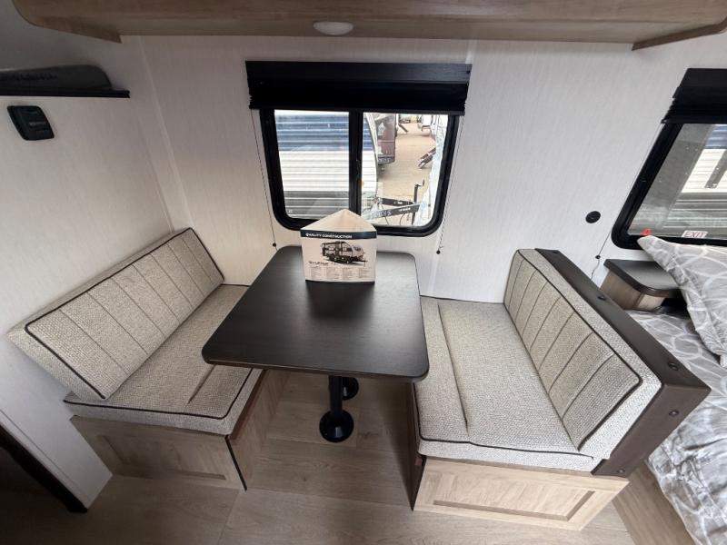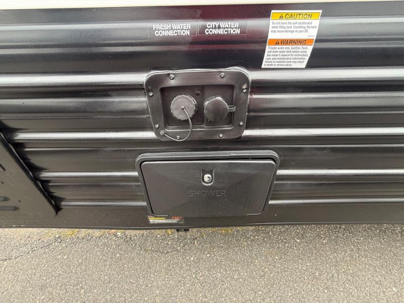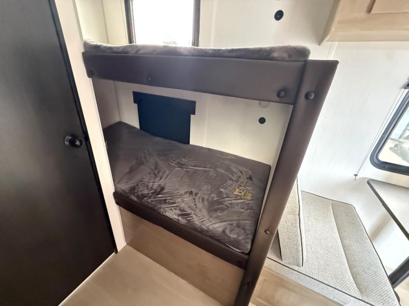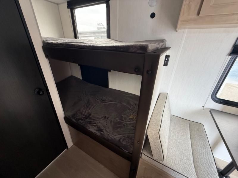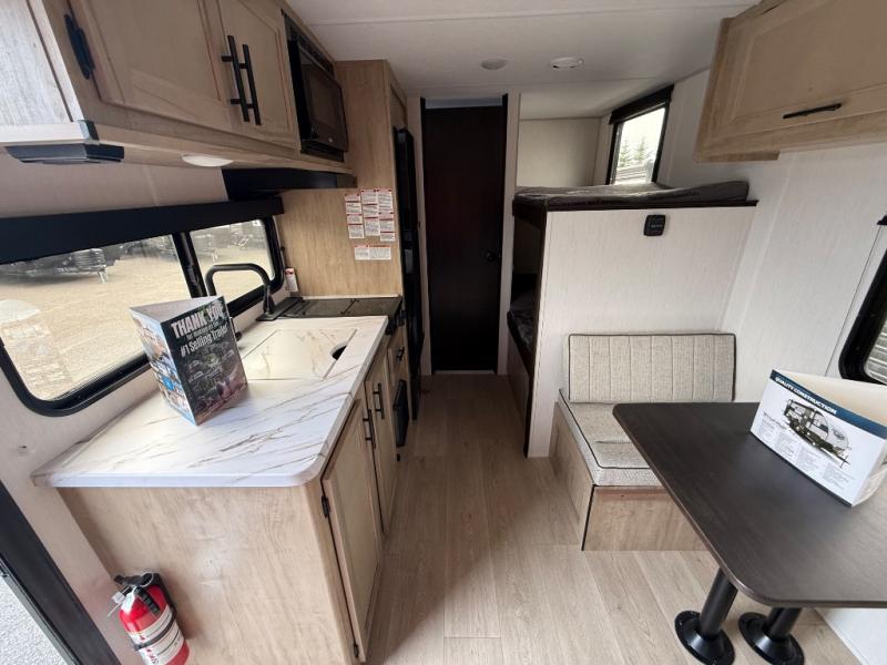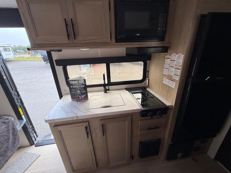 The whole family can sleep comfortably in this travel trailer! It has a set of bunk beds for the kids to sleep on, and you can sleep comfortably on the front queen bed with overhead cabinets and a shelf. There is even an exterior storage plus door that accesses the storage space under the bottom bunk. The chef will enjoy preparing their best home cooked meals either indoors with the high output cooktop or at the outside mini kitchen while staying protected by the 12' power awning!