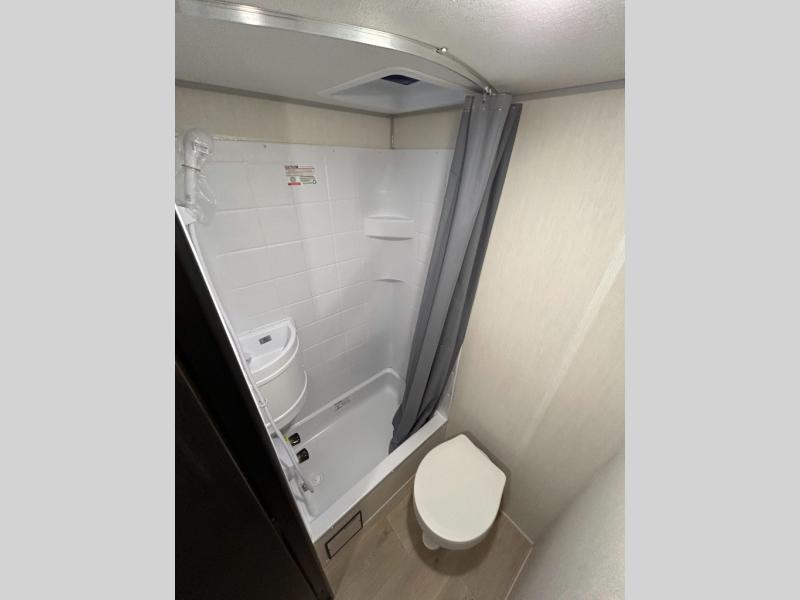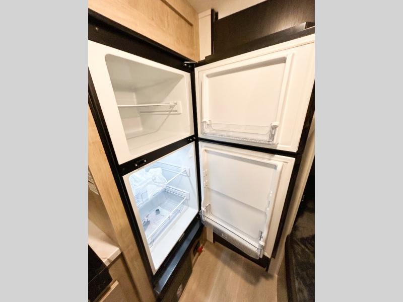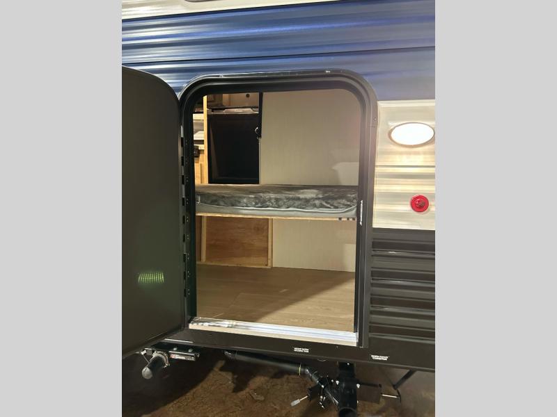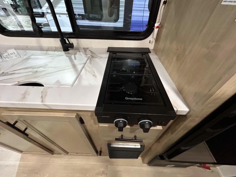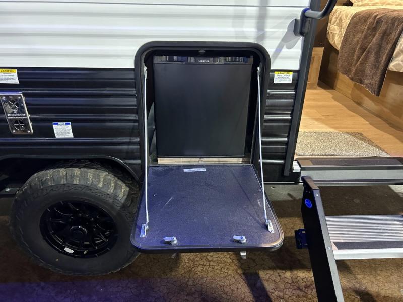The whole family can sleep comfortably in this travel trailer! It has a set of bunk beds for the kids to sleep on, and you can sleep comfortably on the front queen bed with overhead cabinets and a shelf. There is even an exterior storage plus door that accesses the storage space under the bottom bunk. The chef will enjoy preparing their best home cooked meals either indoors with the high output cooktop or at the outside mini kitchen while staying protected by the 12' power awning!