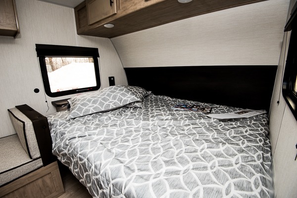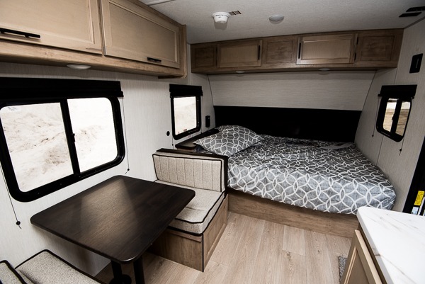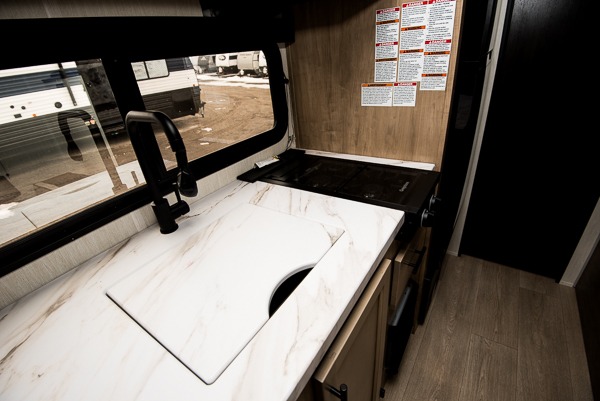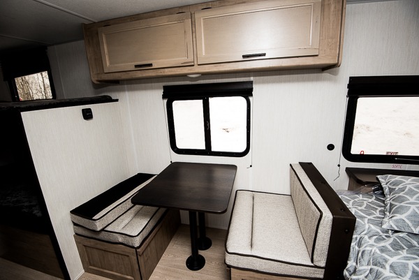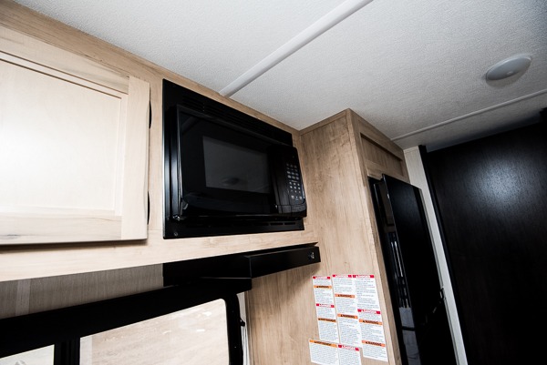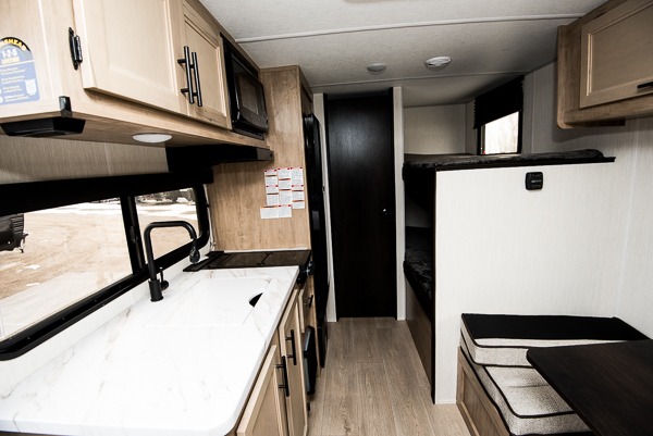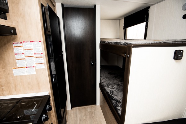 The whole family can sleep comfortably in this travel trailer! It has a set of bunk beds for the kids to sleep on, and you can sleep comfortably on the front queen bed with overhead cabinets and a shelf. There is even an exterior storage plus door that accesses the storage space under the bottom bunk. The chef will enjoy preparing their best home cooked meals either indoors with the high output cooktop or at the outside mini kitchen while staying protected by the 12' power awning!