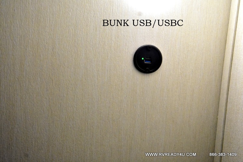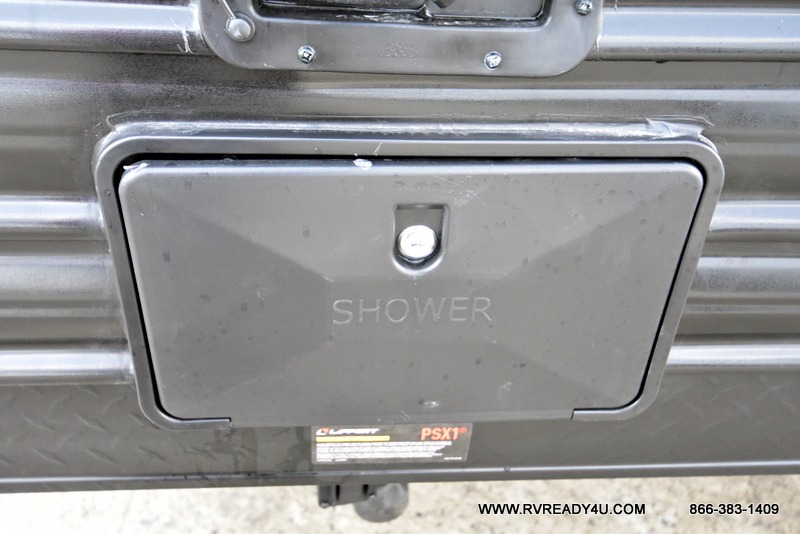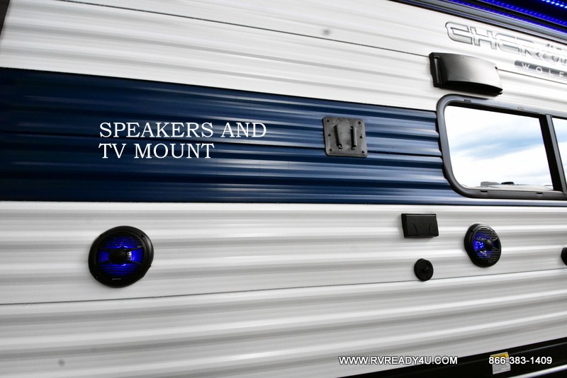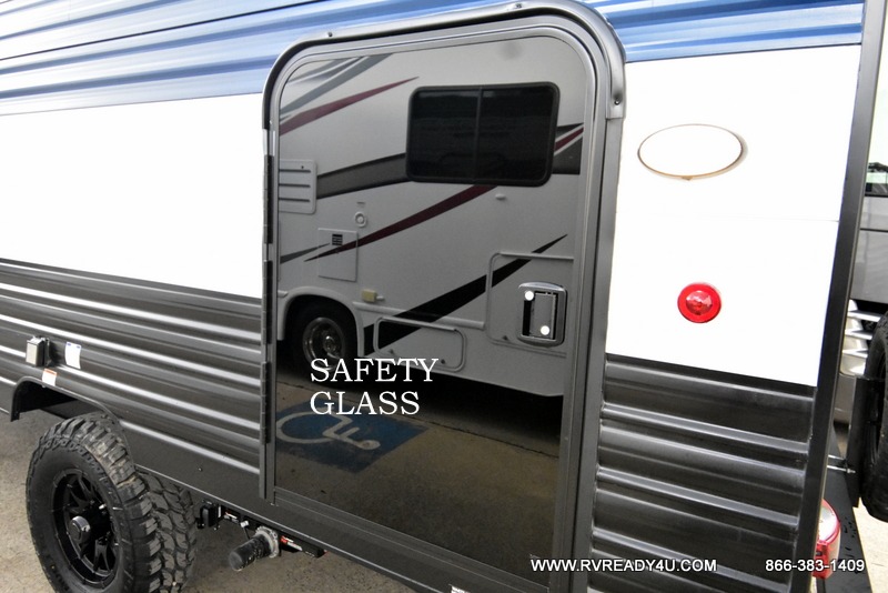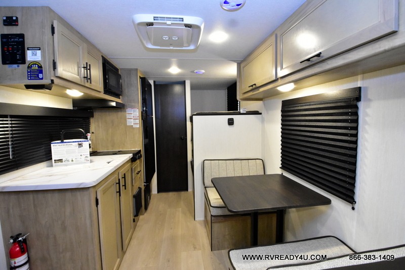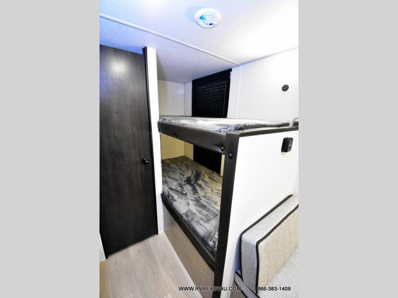 The whole family can sleep comfortably in this travel trailer! It has a set of bunk beds for the kids to sleep on, and you can sleep comfortably on the front queen bed with overhead cabinets and a shelf. There is even an exterior storage plus door that accesses the storage space under the bottom bunk. The chef will enjoy preparing their best home cooked meals either indoors with the high output cooktop or at the outside mini kitchen while staying protected by the 12' power awning!