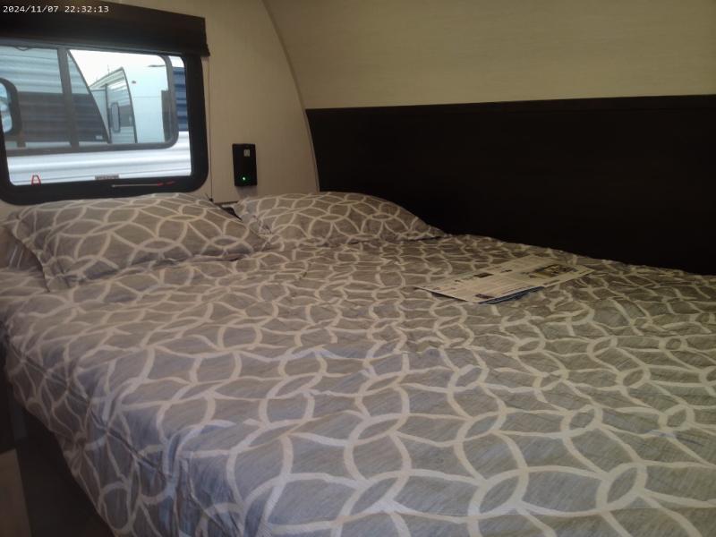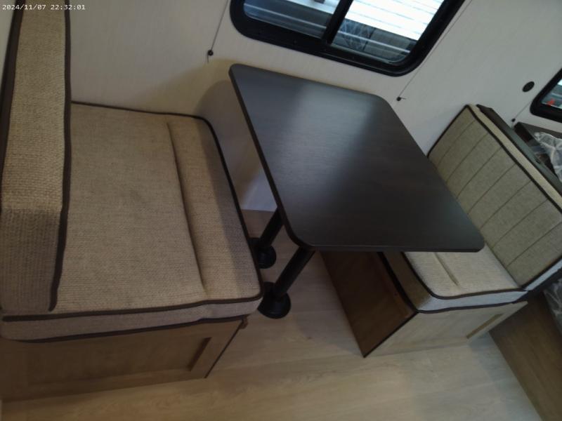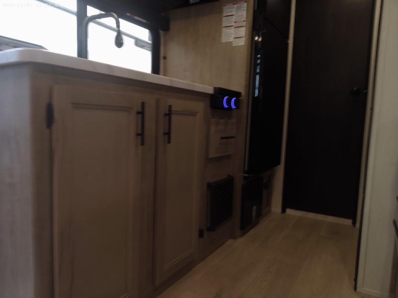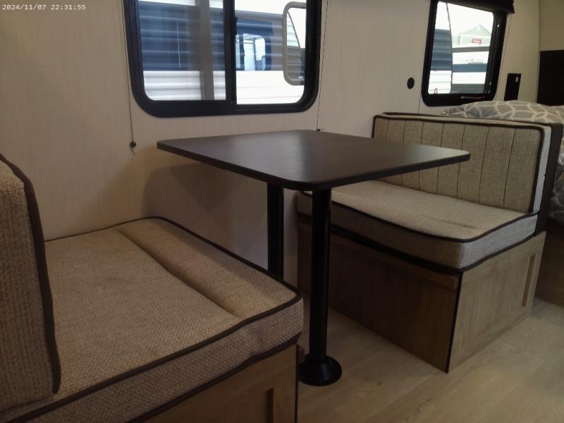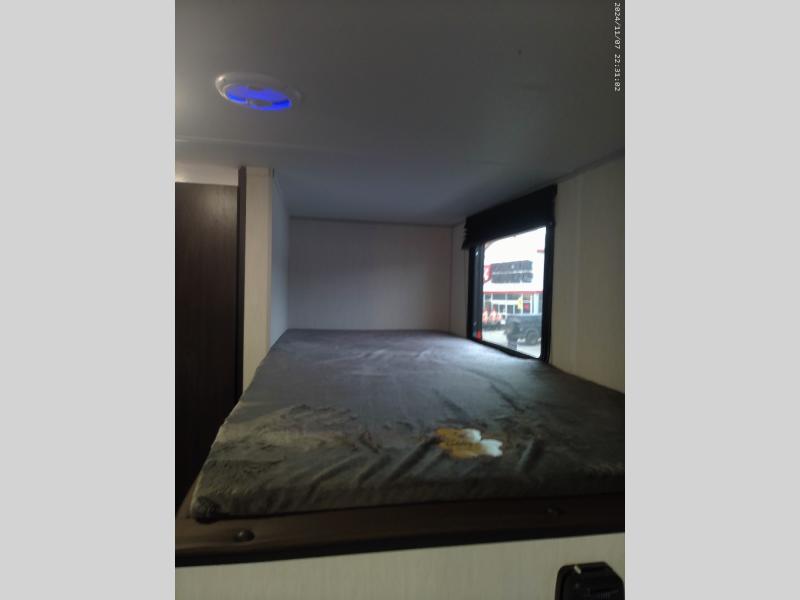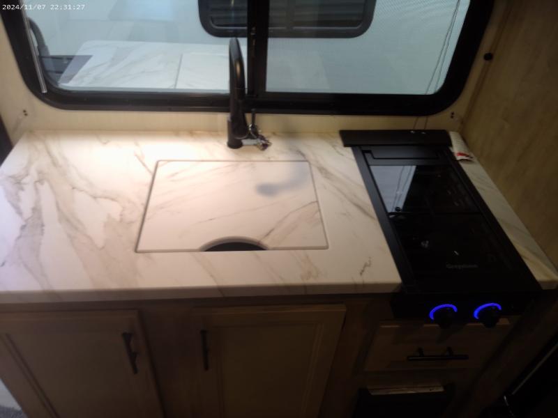 The whole family can sleep comfortably in this travel trailer! It has a set of bunk beds for the kids to sleep on, and you can sleep comfortably on the front queen bed with overhead cabinets and a shelf. There is even an exterior storage plus door that accesses the storage space under the bottom bunk. The chef will enjoy preparing their best home cooked meals either indoors with the high output cooktop or at the outside mini kitchen while staying protected by the 12' power awning!