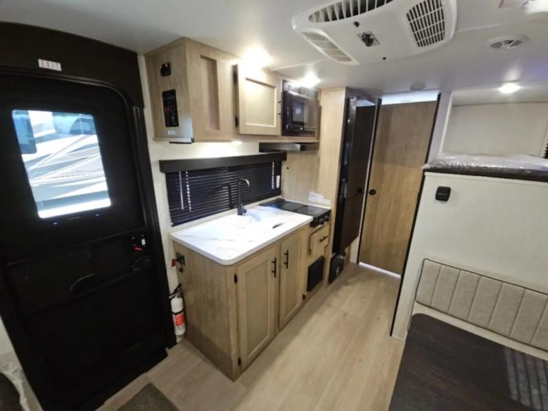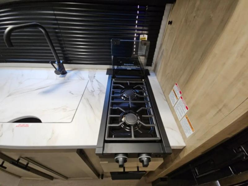 The whole family can sleep comfortably in this travel trailer! It has a set of bunk beds for the kids to sleep on, and you can sleep comfortably on the front queen bed with overhead cabinets and a shelf. There is even an exterior storage plus door that accesses the storage space under the bottom bunk. The chef will enjoy preparing their best home cooked meals either indoors with the high output cooktop or at the outside mini kitchen while staying protected by the 12' power awning!