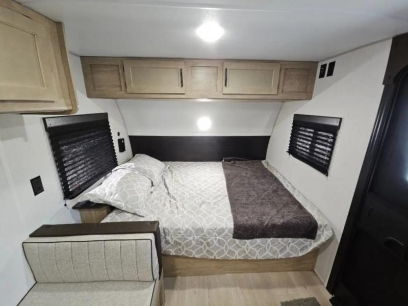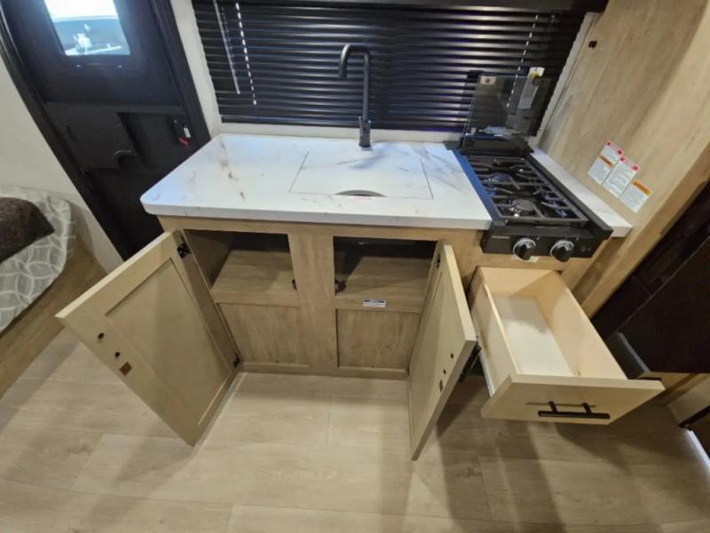 The whole family can sleep comfortably in this travel trailer! It has a set of bunk beds for the kids to sleep on, and you can sleep comfortably on the front queen bed with overhead cabinets and a shelf. There is even an exterior storage plus door that accesses the storage space under the bottom bunk. The chef will enjoy preparing their best home cooked meals either indoors with the high output cooktop or at the outside mini kitchen while staying protected by the 12' power awning!