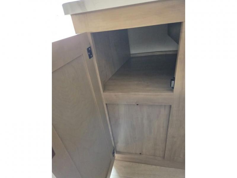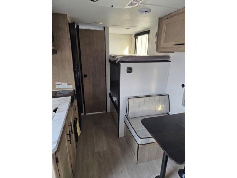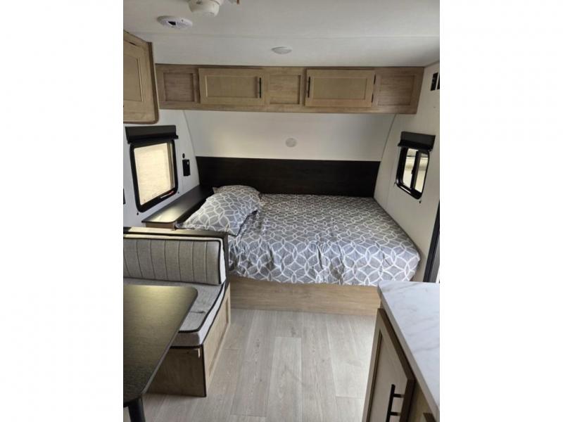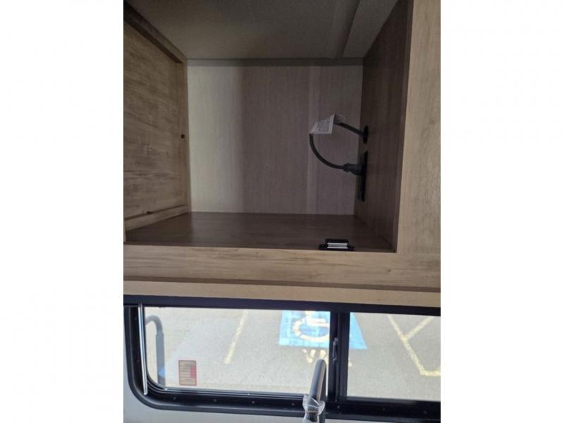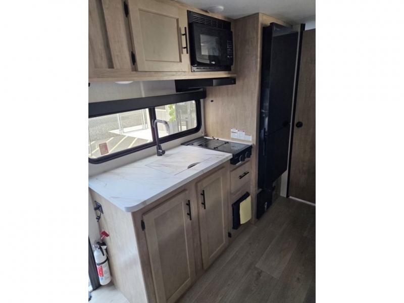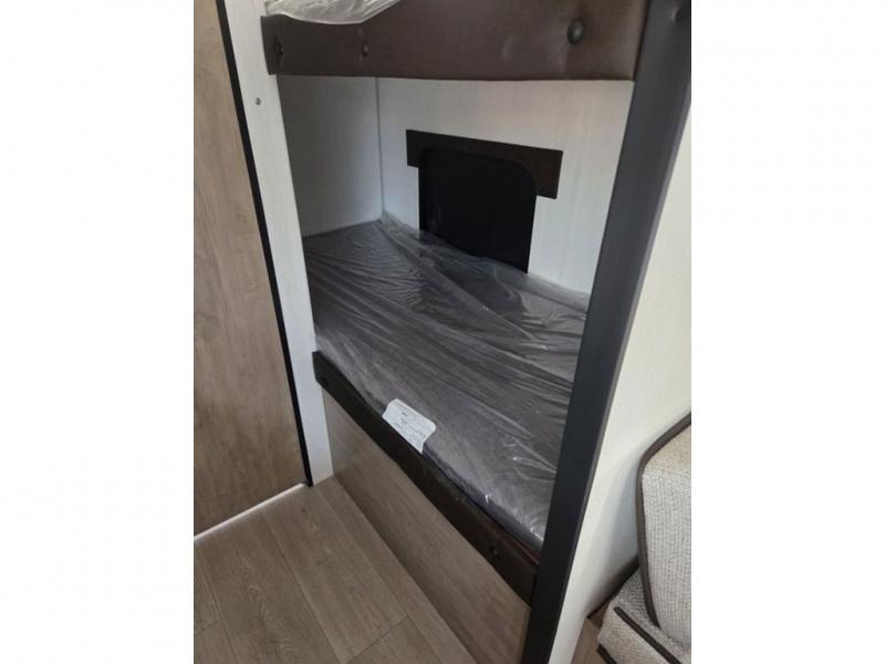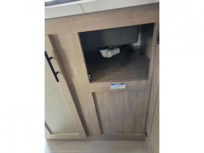 The whole family can sleep comfortably in this travel trailer! It has a set of bunk beds for the kids to sleep on, and you can sleep comfortably on the front queen bed with overhead cabinets and a shelf. There is even an exterior storage plus door that accesses the storage space under the bottom bunk. The chef will enjoy preparing their best home cooked meals either indoors with the high output cooktop or at the outside mini kitchen while staying protected by the 12' power awning!