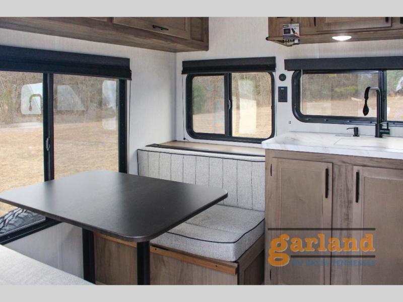 The whole family can sleep comfortably in this travel trailer! It has a set of bunk beds for the kids to sleep on, and you can sleep comfortably on the front queen bed with overhead cabinets and a shelf. The chef will enjoy preparing their best home cooked meals with the cooktop, and you can dine at the booth dinette. And the private bath onboard means you won't have to leave your camper in the middle of the night!