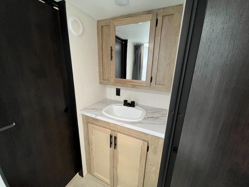 Convenient camping is found with this lightweight travel trailer! Once you arrive at your destination, put out the 15' power awning, then make lunch on the exterior mini kitchen. Inside, you can dine at the booth dinette, freshen up in the tub/shower, and sleep soundly on the queen bed in the master bedroom. And you're sure to find plenty of storage spaces both inside and outside, including a rear storage rack!