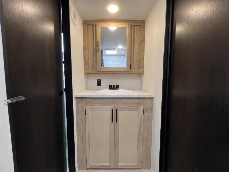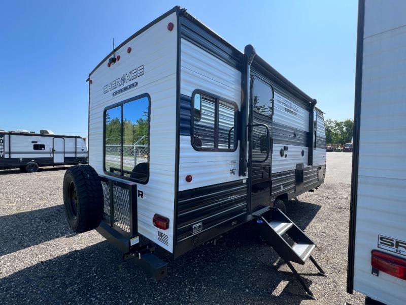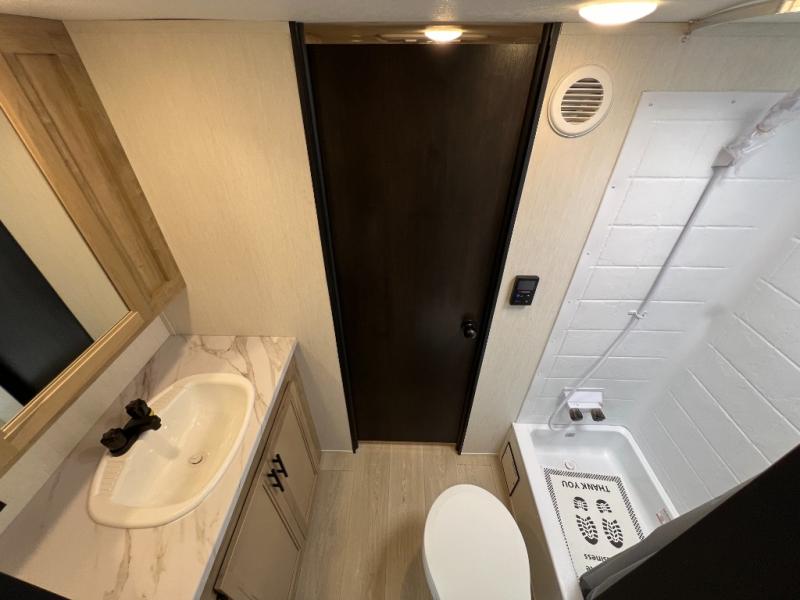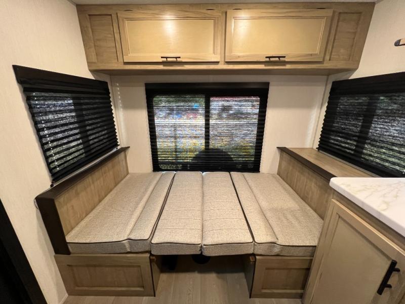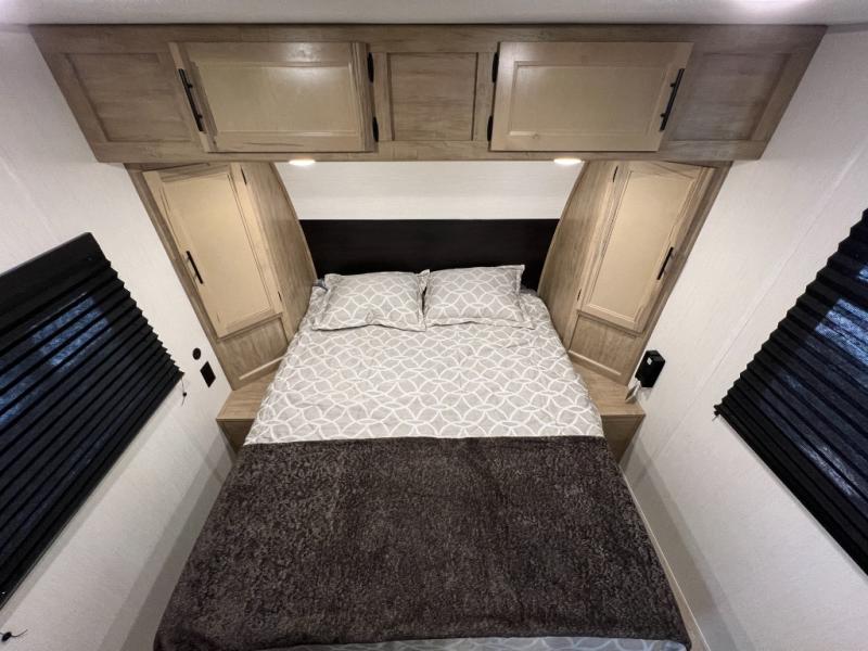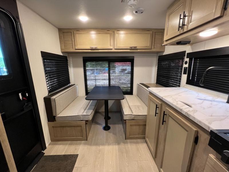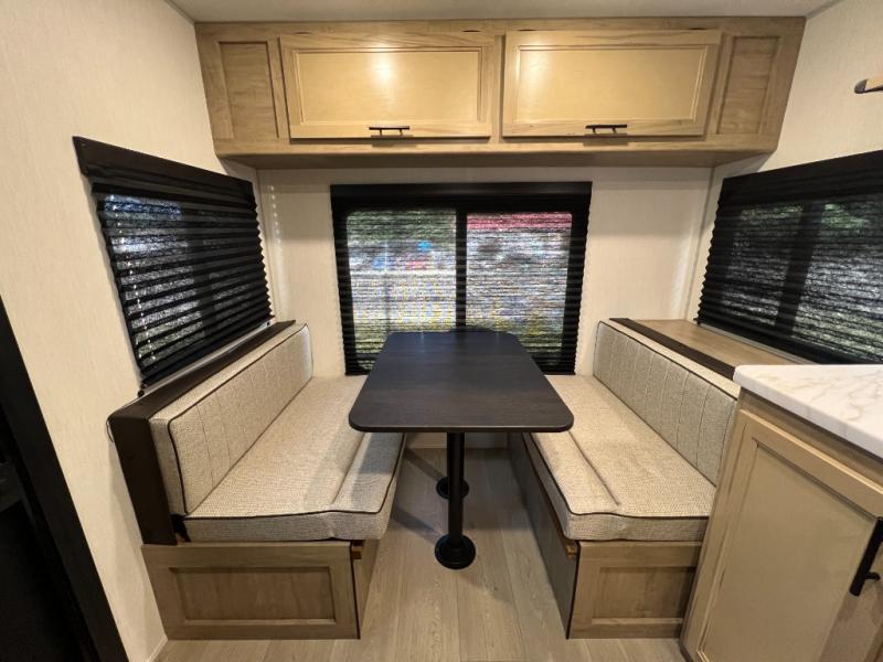 Convenient camping is found with this lightweight travel trailer! Once you arrive at your destination, put out the 15' power awning, then make lunch on the exterior mini kitchen. Inside, you can dine at the booth dinette, freshen up in the tub/shower, and sleep soundly on the queen bed in the master bedroom. And you're sure to find plenty of storage spaces both inside and outside, including a rear storage rack!