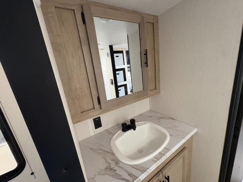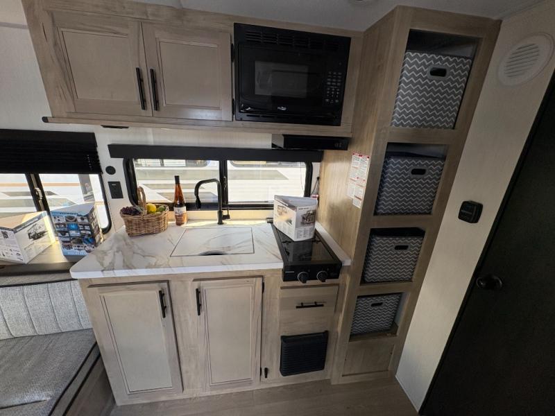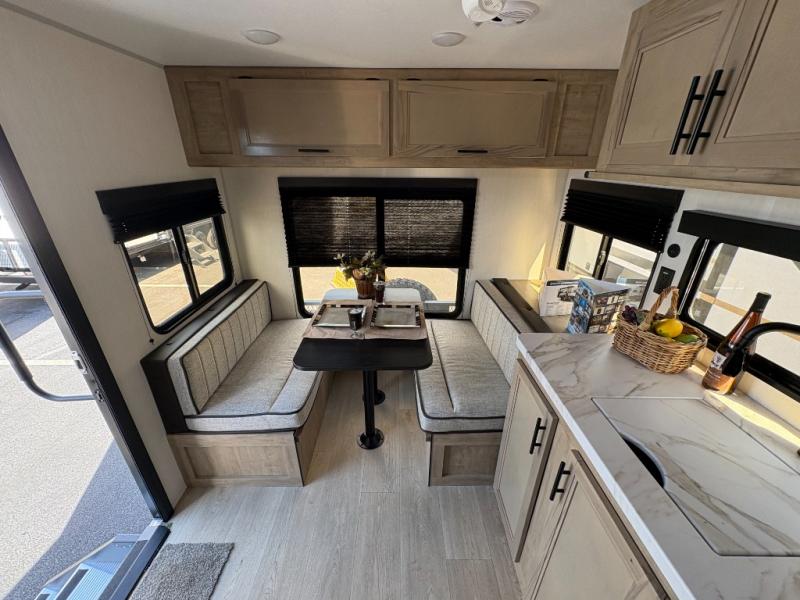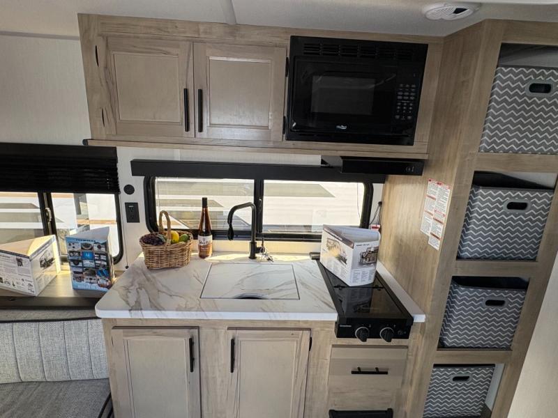 Convenient camping is found with this lightweight travel trailer! Once you arrive at your destination, put out the 15' power awning, then make lunch on the exterior mini kitchen. Inside, you can dine at the booth dinette, freshen up in the tub/shower, and sleep soundly on the queen bed in the master bedroom. And you're sure to find plenty of storage spaces both inside and outside, including a rear storage rack!