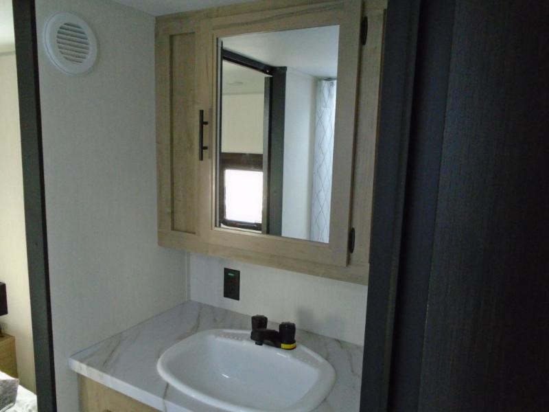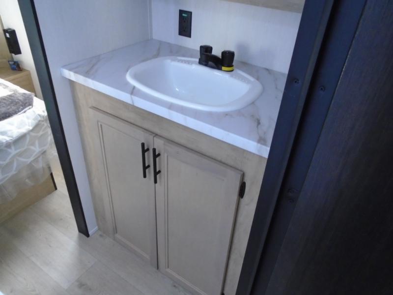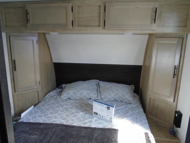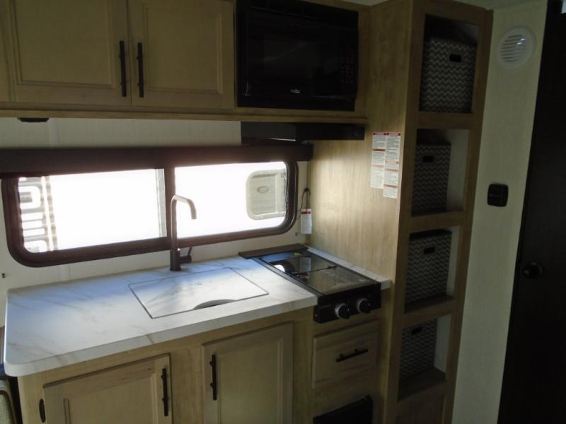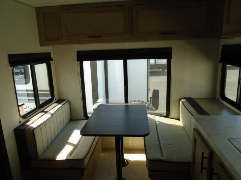 Convenient camping is found with this lightweight travel trailer! Once you arrive at your destination, put out the 15' power awning, then make lunch on the exterior mini kitchen. Inside, you can dine at the booth dinette, freshen up in the tub/shower, and sleep soundly on the queen bed in the master bedroom. And you're sure to find plenty of storage spaces both inside and outside, including a rear storage rack!