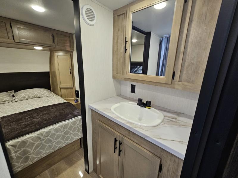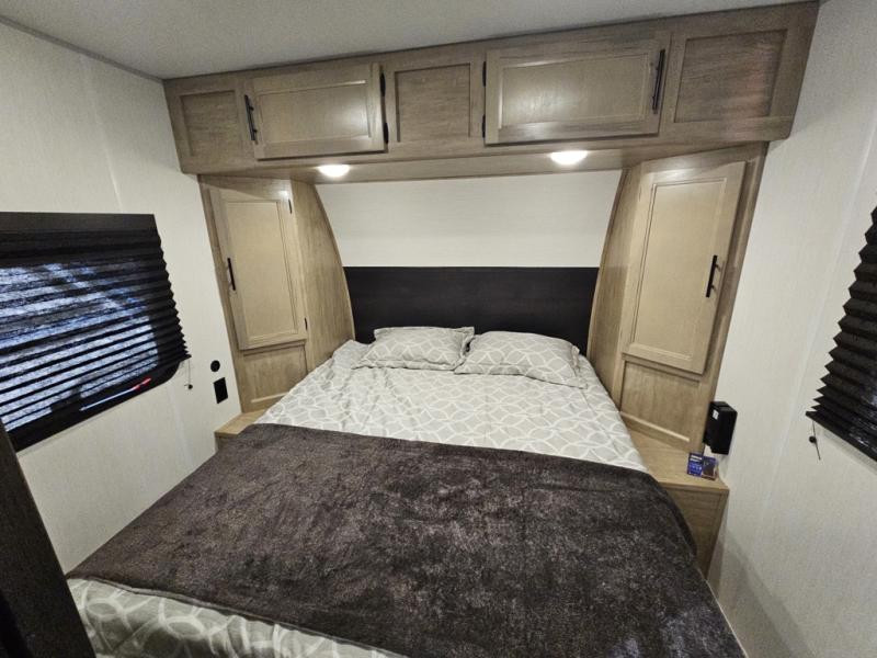 Convenient camping is found with this lightweight travel trailer! Once you arrive at your destination, put out the 15' power awning, then make lunch on the exterior mini kitchen. Inside, you can dine at the booth dinette, freshen up in the tub/shower, and sleep soundly on the queen bed in the master bedroom. And you're sure to find plenty of storage spaces both inside and outside.