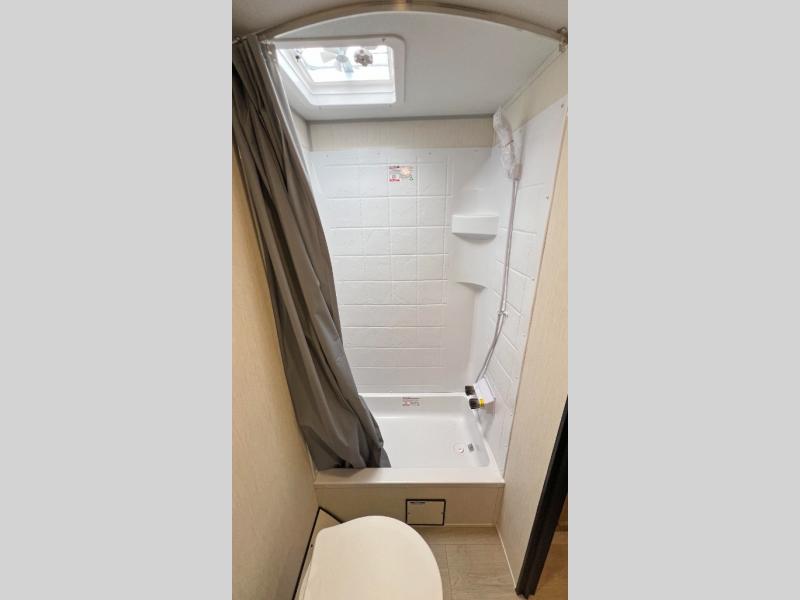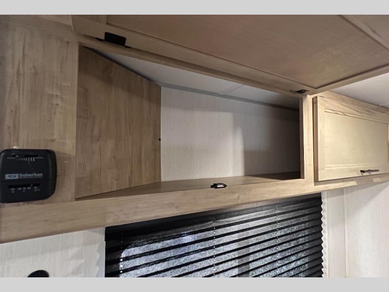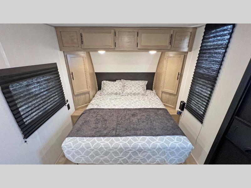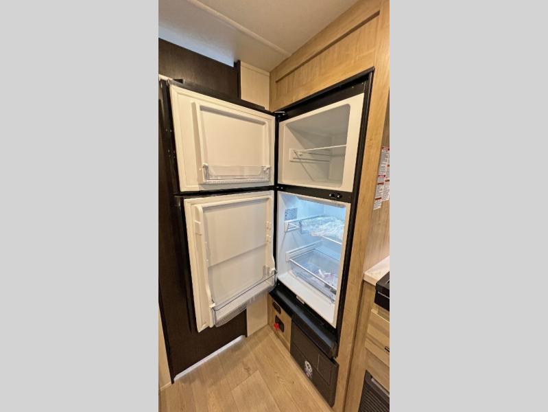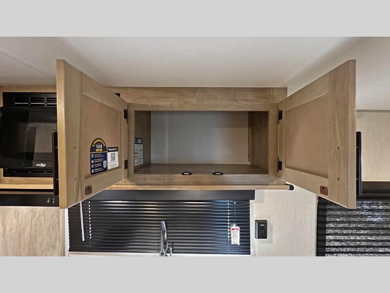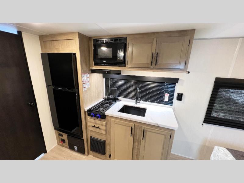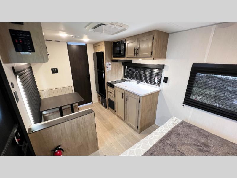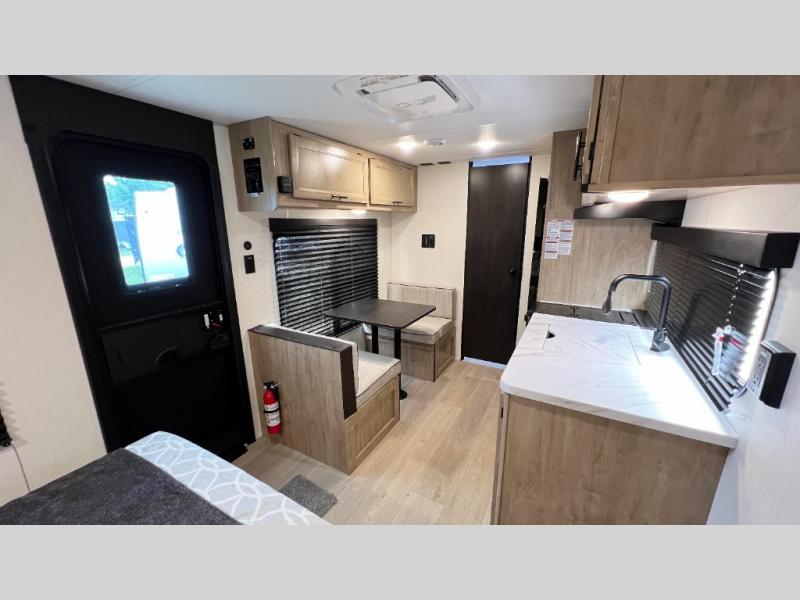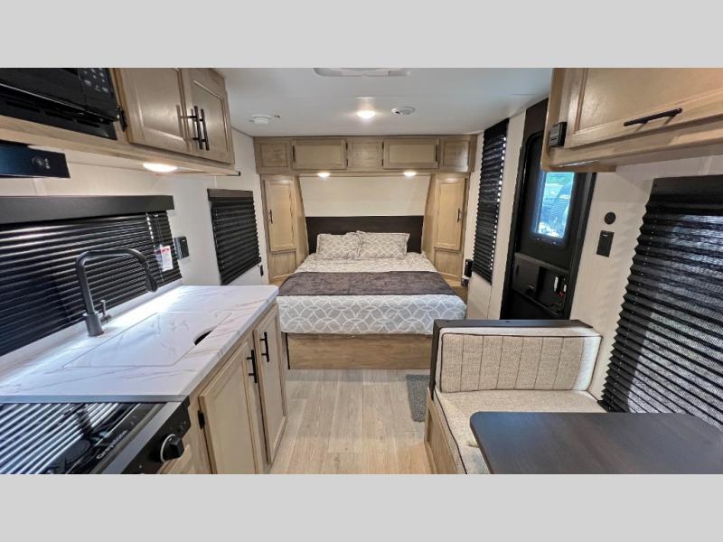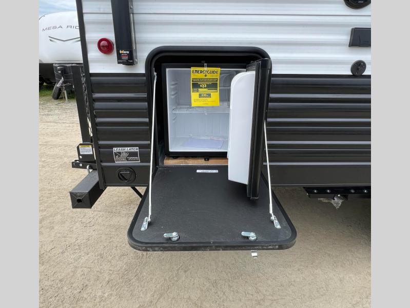 You will love camping in this travel trailer with a front queen bed. Freshen up each morning in the full rear bathroom with the tub/shower, a toilet, and sink. Fill your bellies with the perishables stored in the 12V high efficiency refrigerator and cook them on the high output cooktop then enjoy them at the booth dinette. You could even prepare a meal while breathing in some fresh air at the outside mini kitchen while staying protected by the 12' power awning. Easily store all of your outdoor gear in the outside storage area too!
