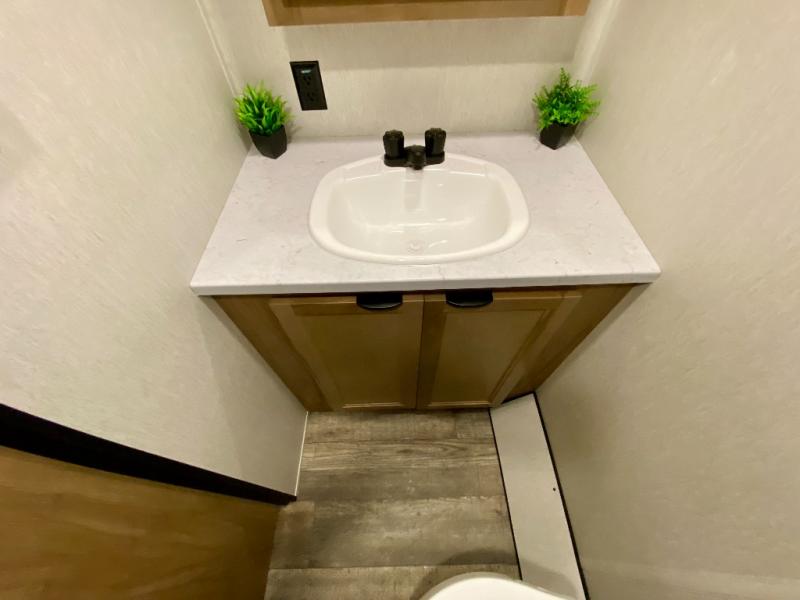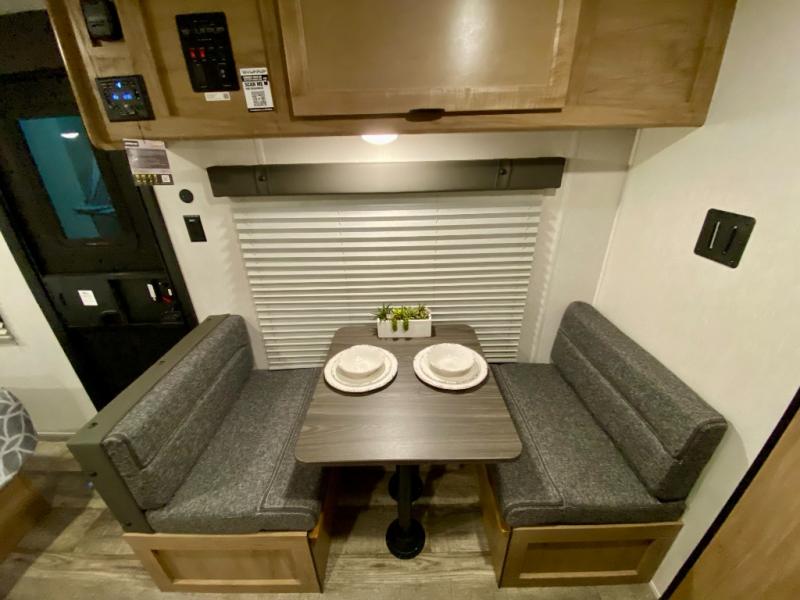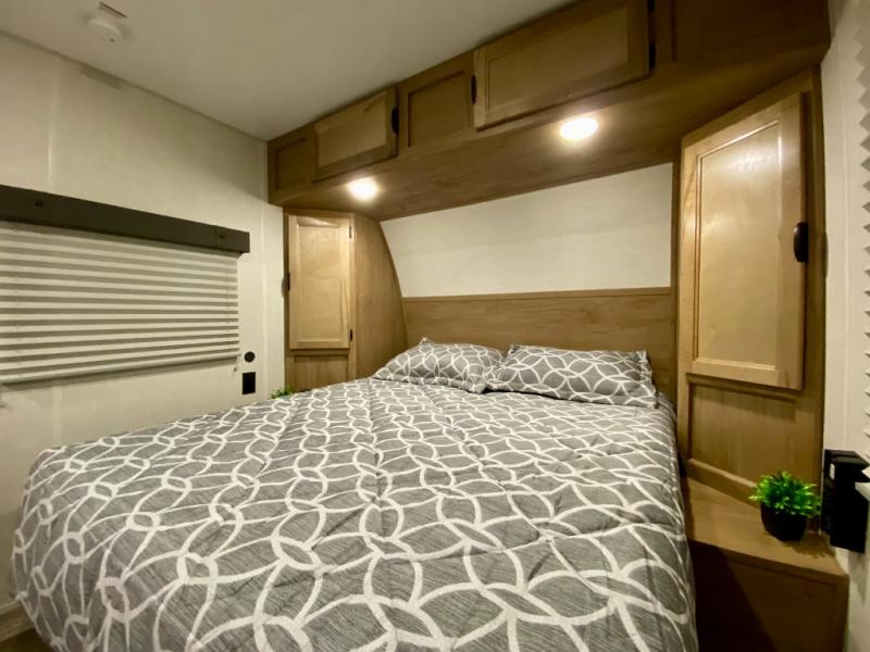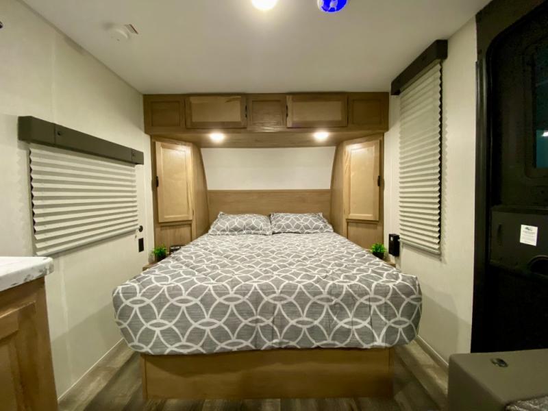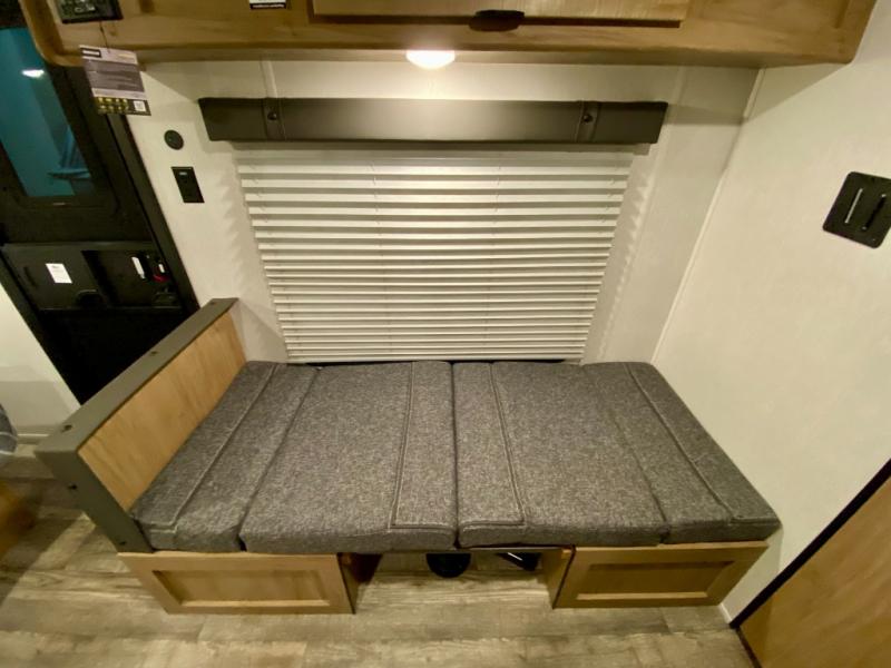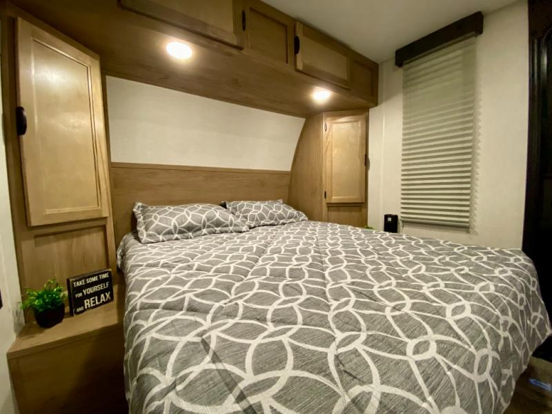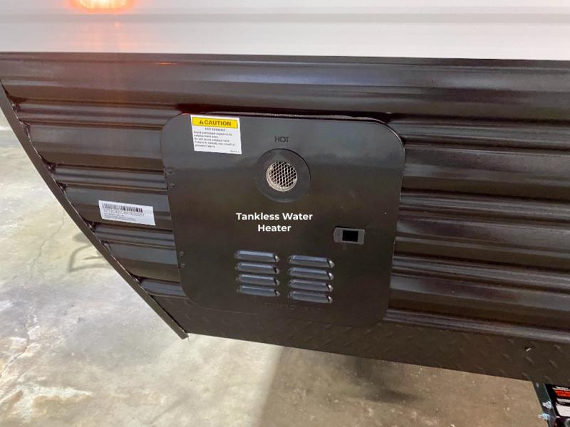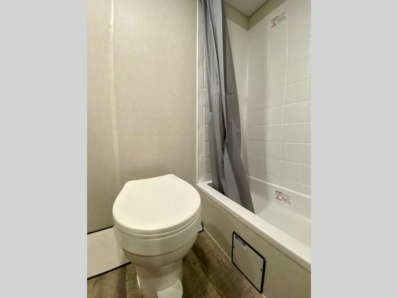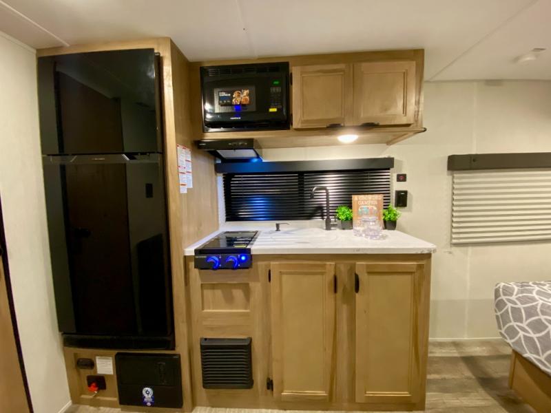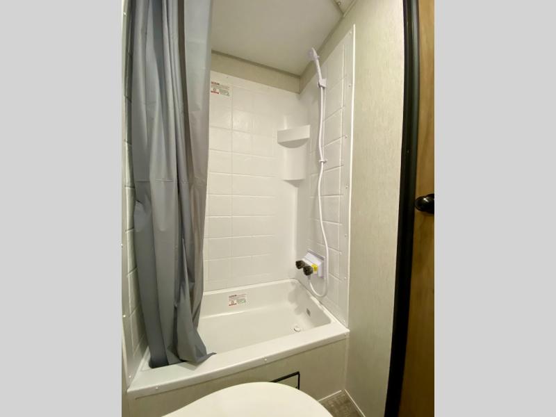 You will love camping in this travel trailer with a front queen bed. Freshen up each morning in the full rear bathroom with the tub/shower, a toilet, and sink. Fill your bellies with the perishables stored in the refrigerator and cook them on the cooktop then enjoy them at the booth dinette. You could even prepare a meal while breathing in some fresh air at the outside mini kitchen while staying protected by the 12' power awning. Easily store all of your outdoor gear in the outside storage area too!