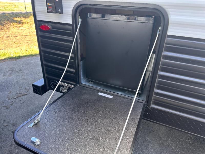 You will love camping in this travel trailer with a front queen bed. Freshen up each morning in the full rear bathroom with the tub/shower, a toilet, and sink. Fill your bellies with the perishables stored in the 12V high efficiency refrigerator and cook them on the high output cooktop then enjoy them at the booth dinette. You could even prepare a meal while breathing in some fresh air at the outside mini kitchen while staying protected by the 12' power awning. Easily store all of your outdoor gear in the outside storage area too!