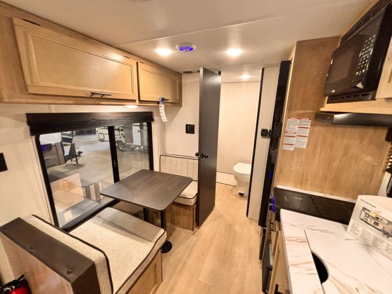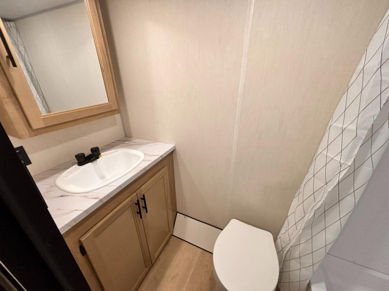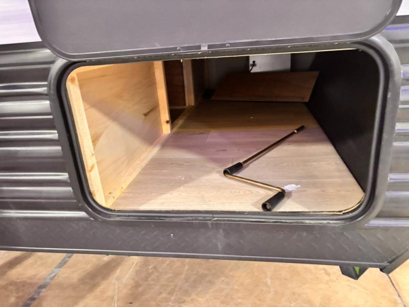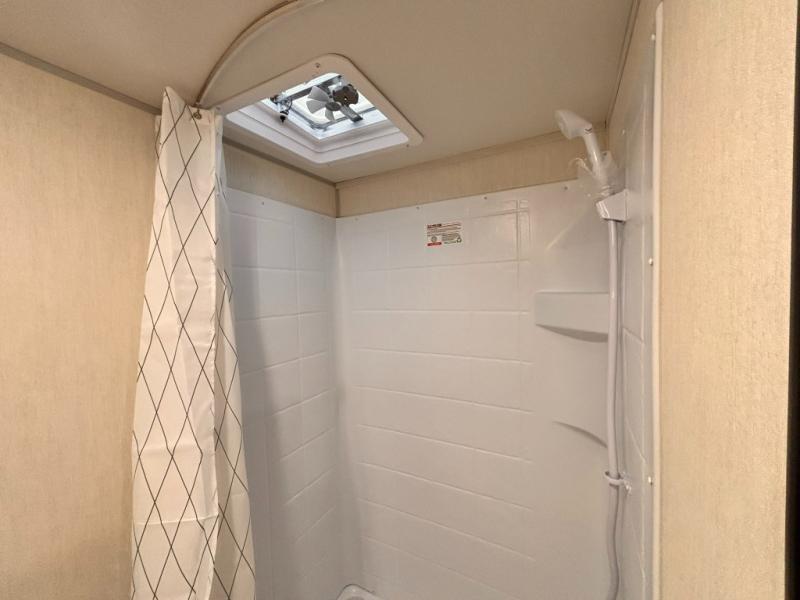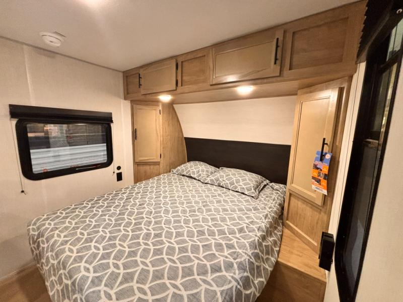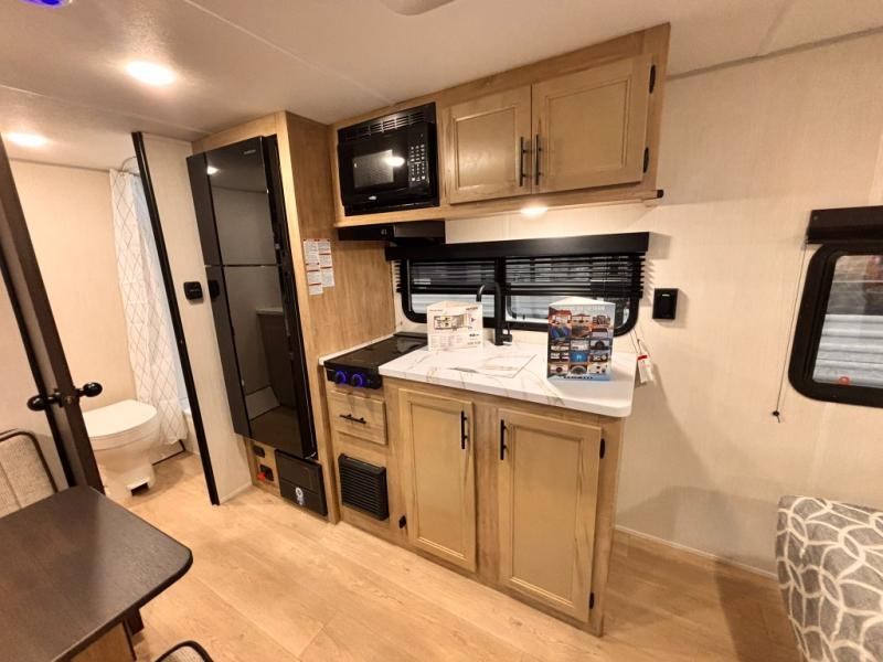 You will love camping in this travel trailer with a front queen bed. Freshen up each morning in the full rear bathroom with the tub/shower, a toilet, and sink. Fill your bellies with the perishables stored in the refrigerator and cook them on the cooktop then enjoy them at the booth dinette. You could even prepare a meal while breathing in some fresh air at the outside mini kitchen while staying protected by the 12' power awning. Easily store all of your outdoor gear in the outside storage area too!