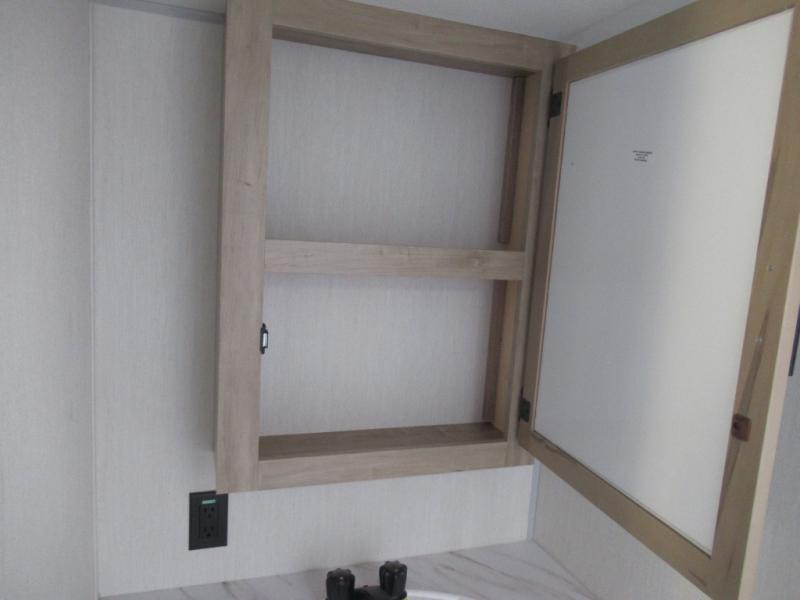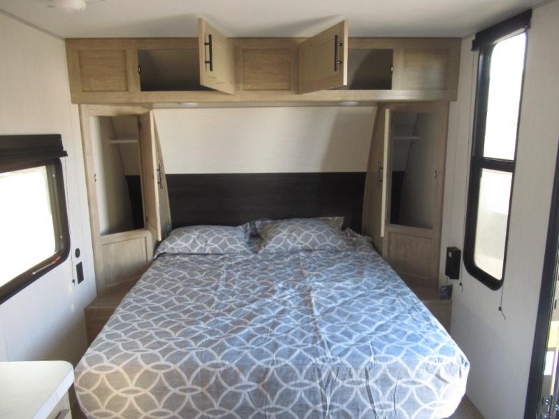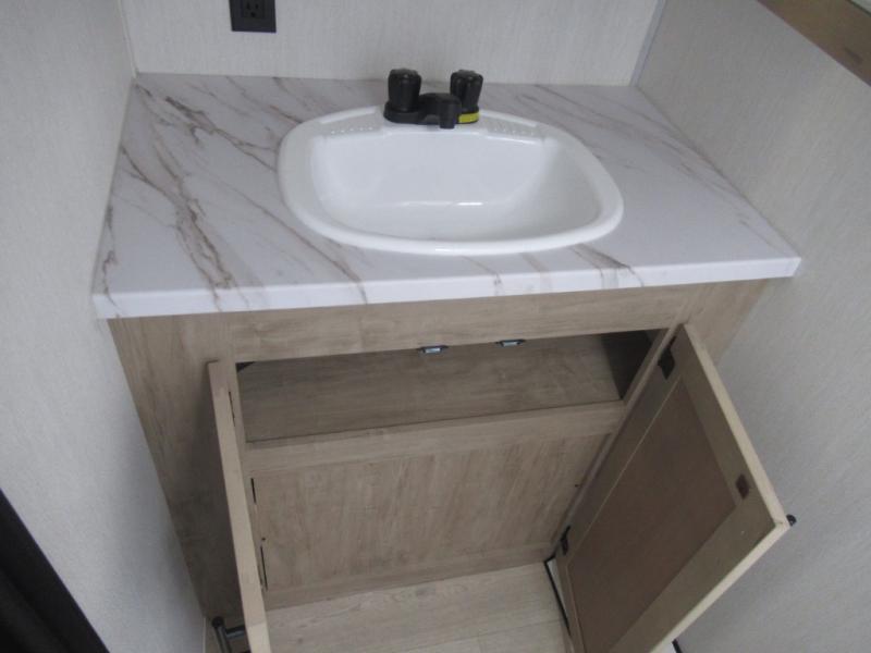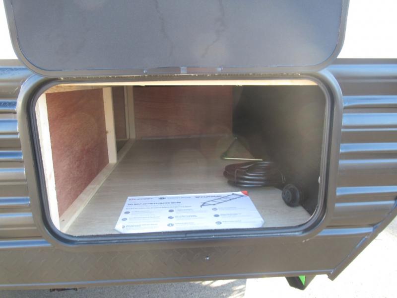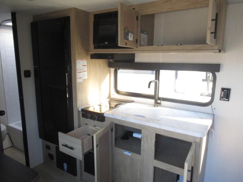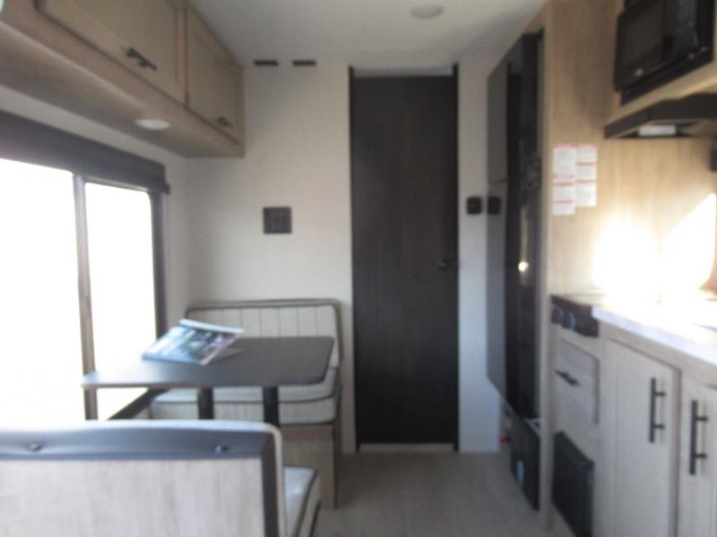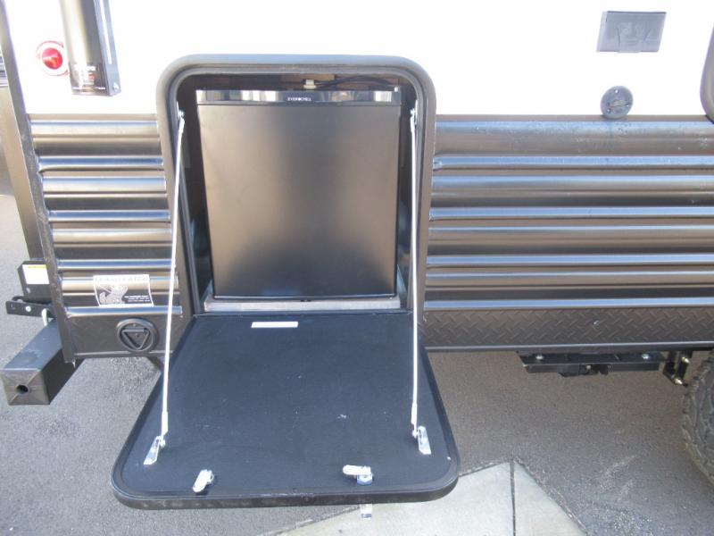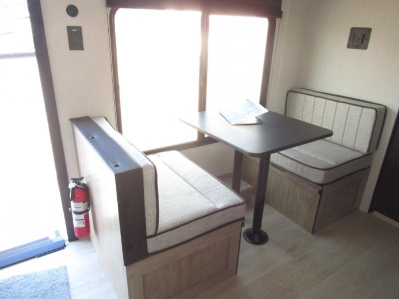 You will love camping in this travel trailer with a front queen bed. Freshen up each morning in the full rear bathroom with the tub/shower, a toilet, and sink. Fill your bellies with the perishables stored in the refrigerator and cook them on the cooktop then enjoy them at the booth dinette. You could even prepare a meal while breathing in some fresh air at the outside mini kitchen while staying protected by the 12' power awning. Easily store all of your outdoor gear in the outside storage area too!