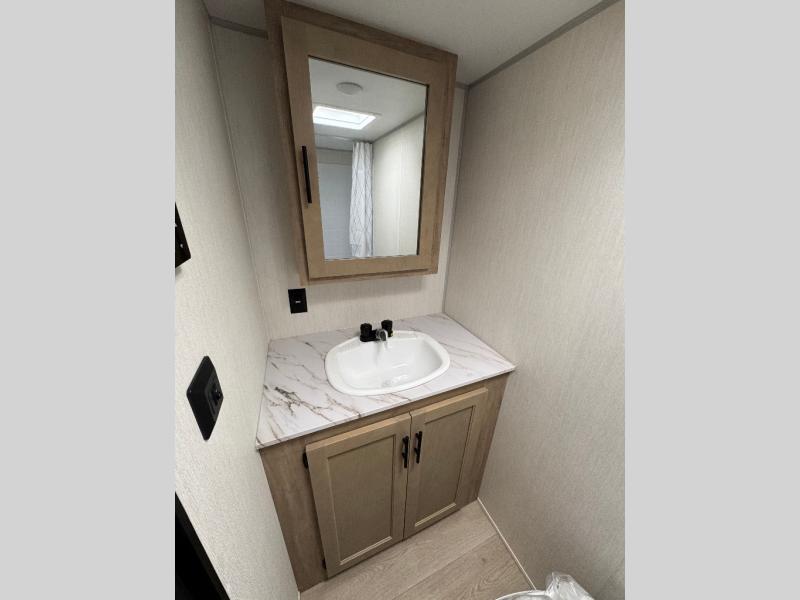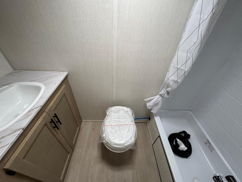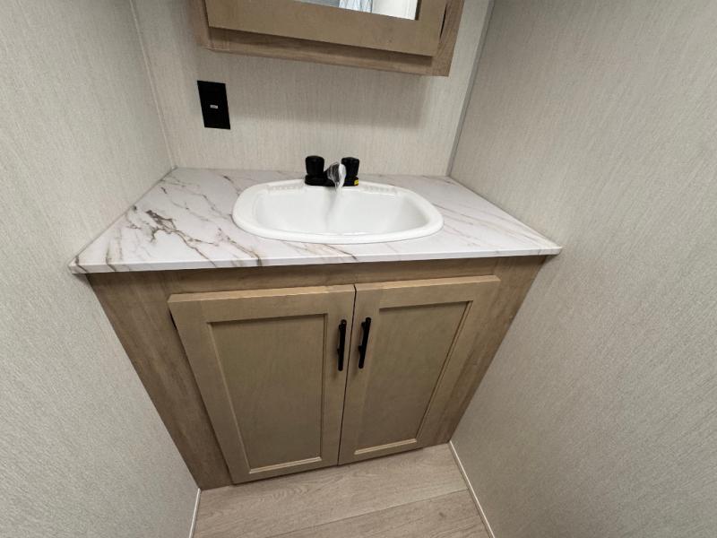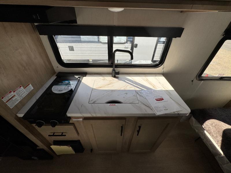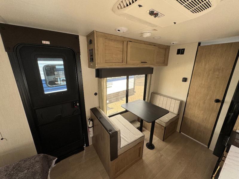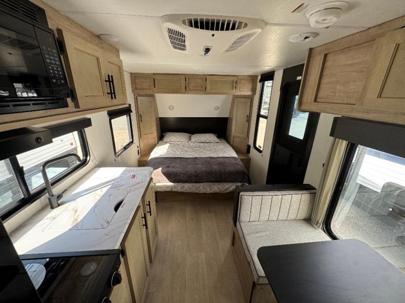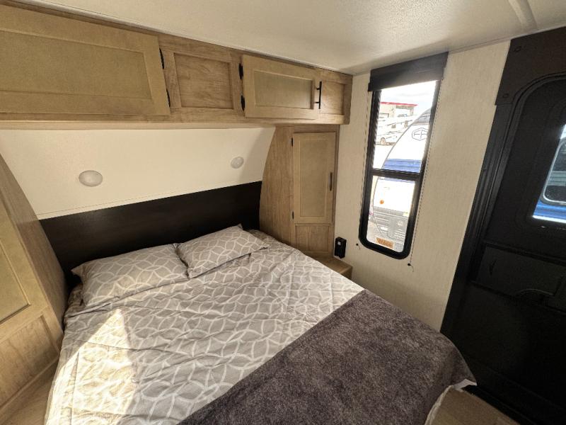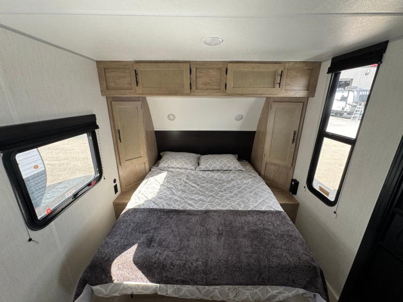You will love camping in this travel trailer with a front queen bed. Freshen up each morning in the full rear bathroom with the tub/shower, a toilet, and sink. Fill your bellies with the perishables stored in the refrigerator and cook them on the cooktop then enjoy them at the booth dinette. You could even prepare a meal while breathing in some fresh air at the outside mini kitchen while staying protected by the 12' power awning. Easily store all of your outdoor gear in the outside storage area too!