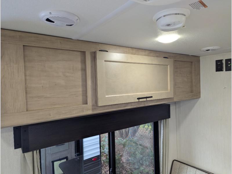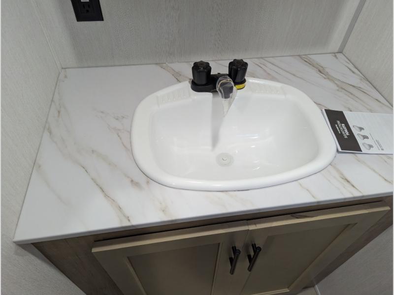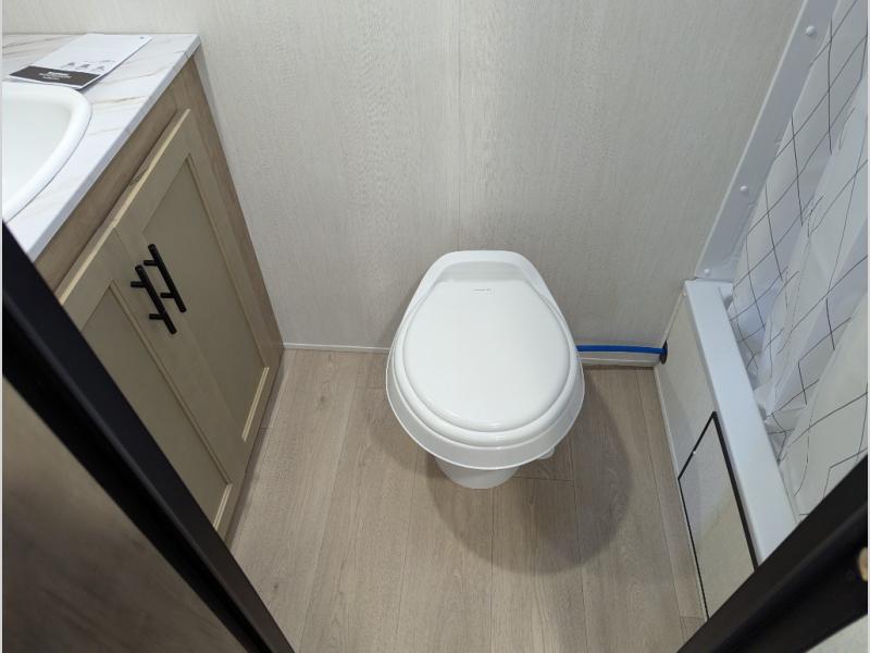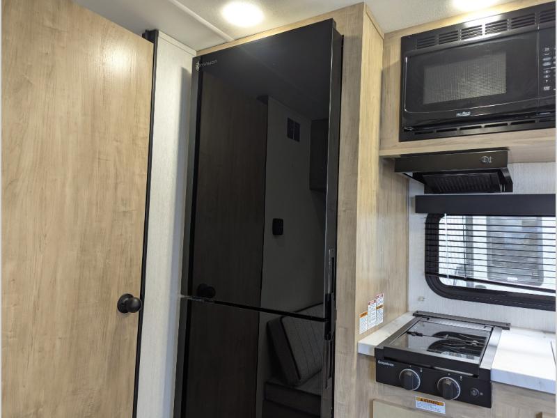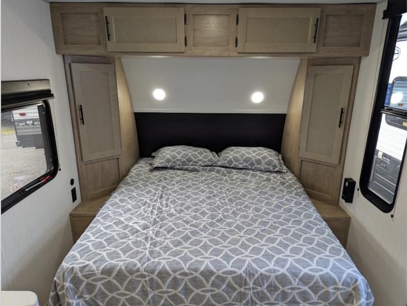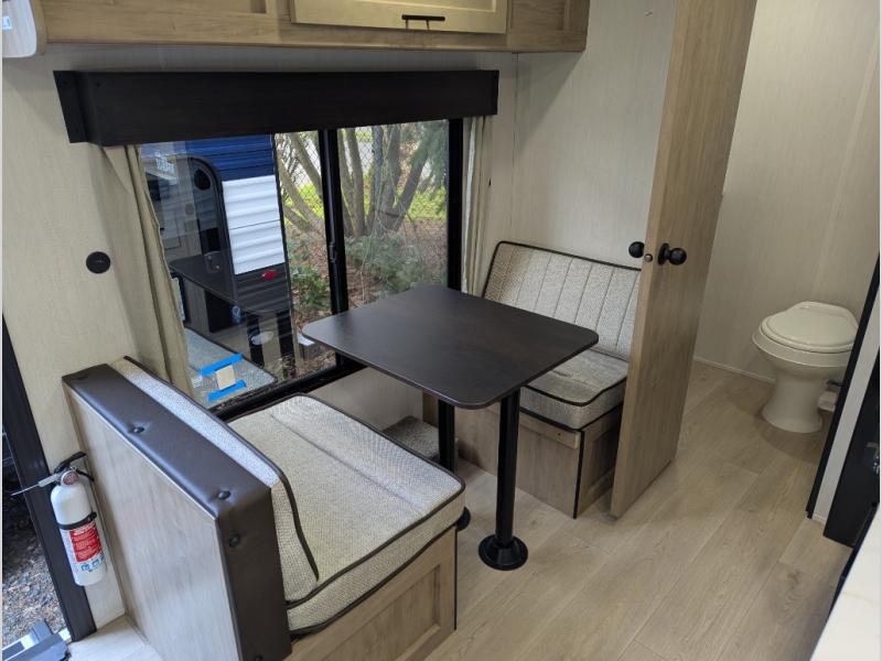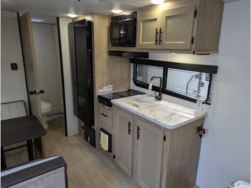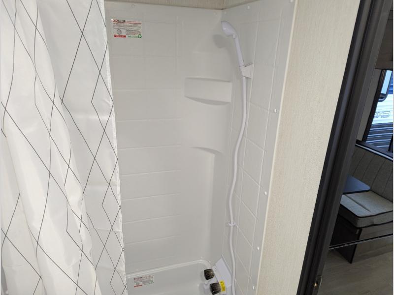 You will love camping in this travel trailer with a front queen bed. Freshen up each morning in the full rear bathroom with the tub/shower, a toilet, and sink. Fill your bellies with the perishables stored in the refrigerator and cook them on the cooktop then enjoy them at the booth dinette. You could even prepare a meal while breathing in some fresh air at the outside mini kitchen while staying protected by the 12' power awning. Easily store all of your outdoor gear in the outside storage area too!