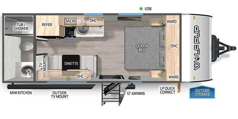 Light weight and easy to tow, Wolf Pup Trailers by Cherokee are fully self-contained with ample tank capacities and an abundance of storage space compared to other trailers in its class. Enjoy relaxing under the power awning with LED lights.