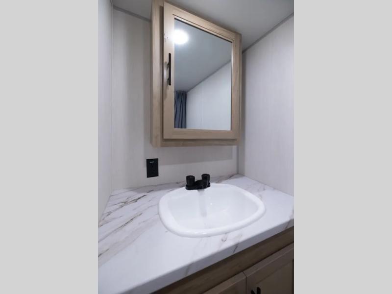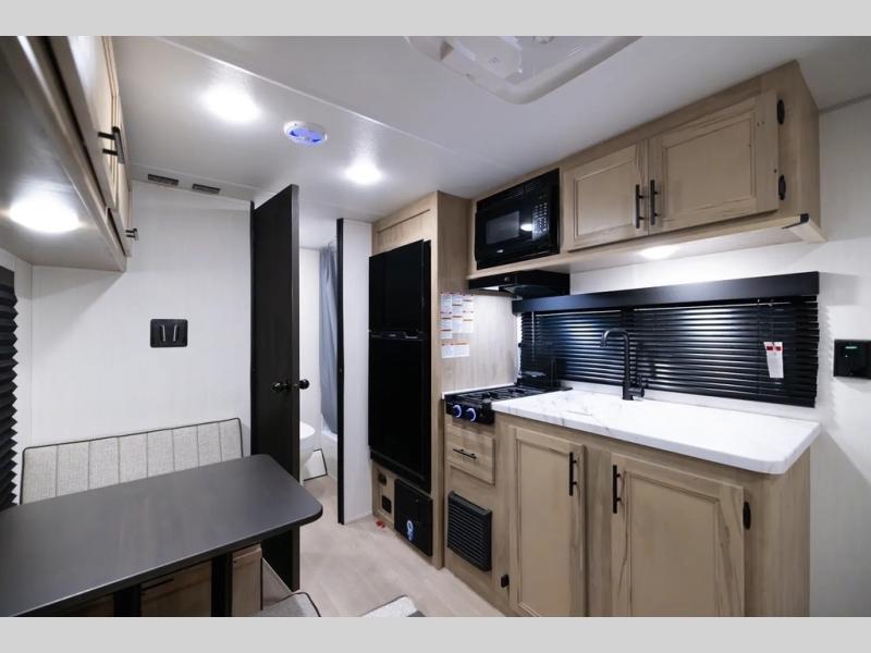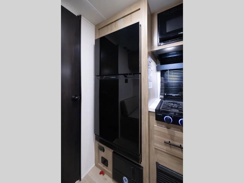 You will love camping in this travel trailer with a front queen bed. Freshen up each morning in the full rear bathroom with the tub/shower, a toilet, and sink. Fill your bellies with the perishables stored in the refrigerator and cook them on the cooktop then enjoy them at the booth dinette. You could even prepare a meal while breathing in some fresh air at the outside mini kitchen while staying protected by the 12' power awning. Easily store all of your outdoor gear in the outside storage area too!