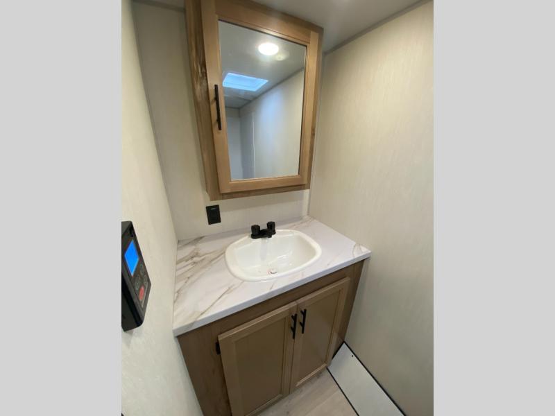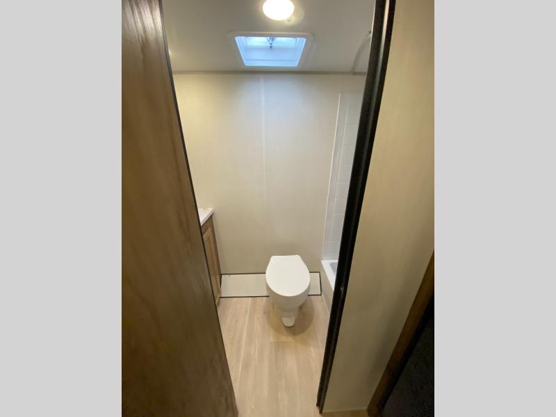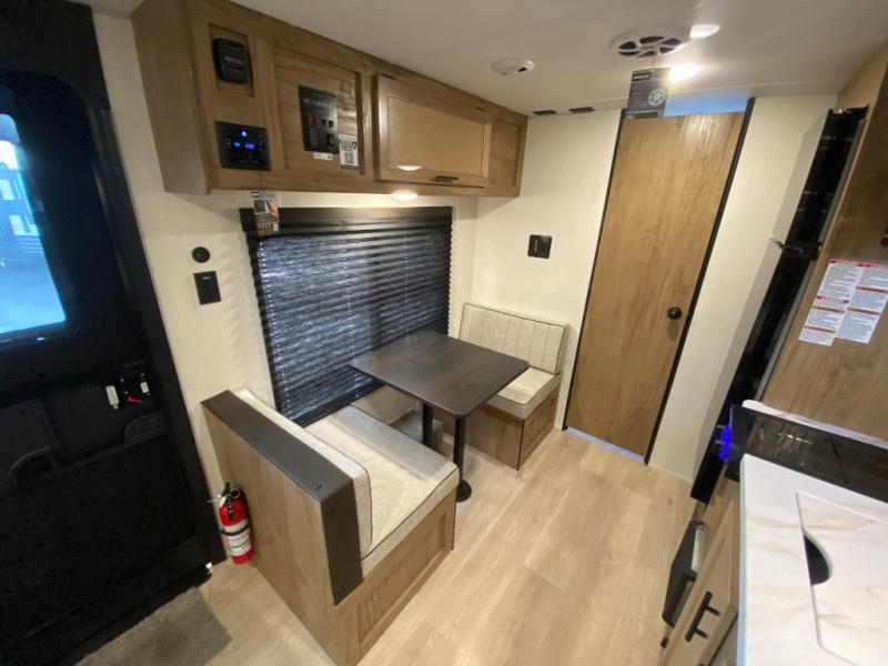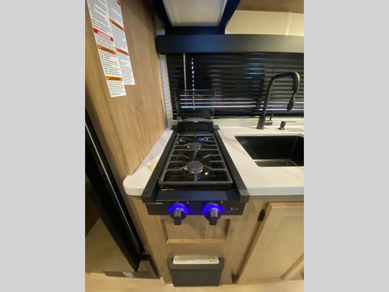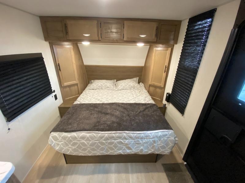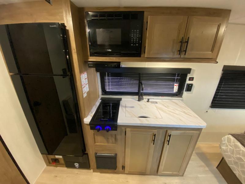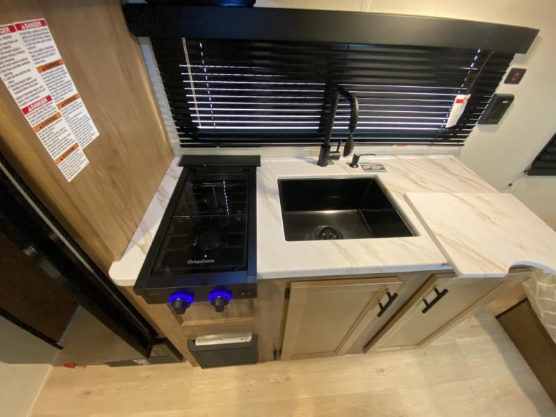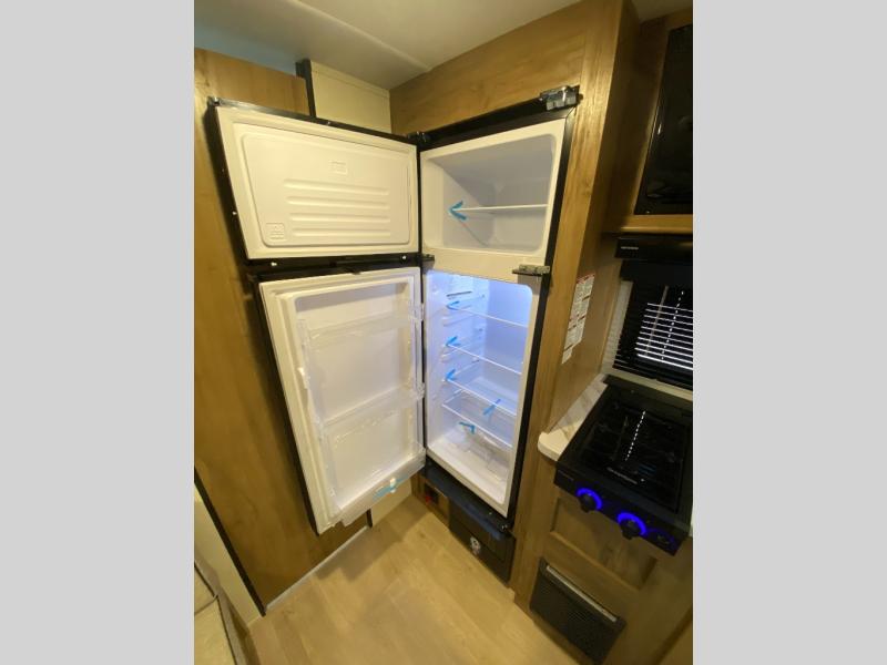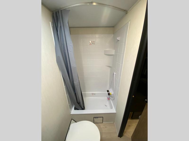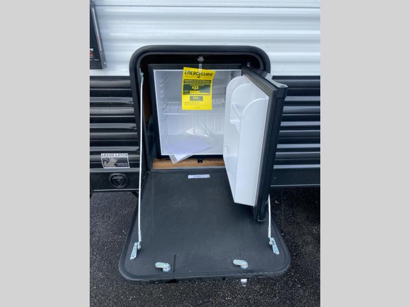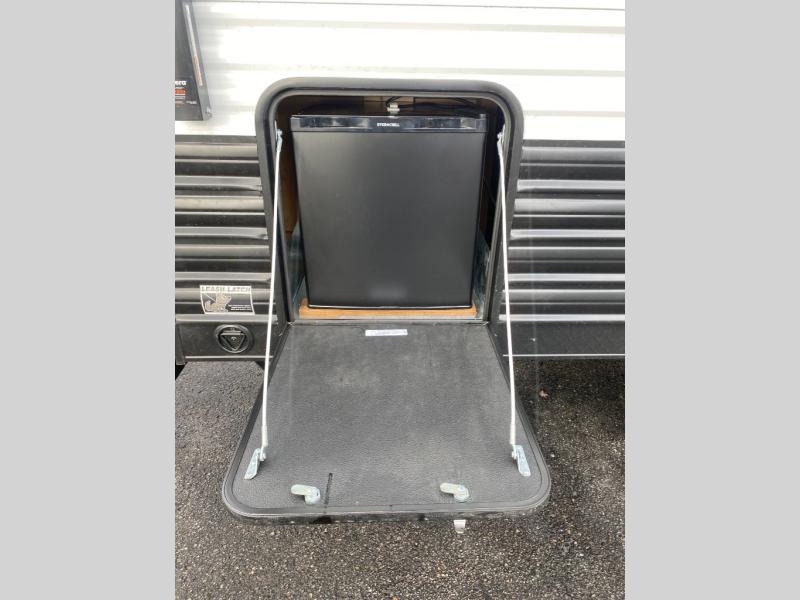 You will love camping in this travel trailer with a front queen bed. Freshen up each morning in the full rear bathroom with the tub/shower, a toilet, and sink. Fill your bellies with the perishables stored in the refrigerator and cook them on the cooktop then enjoy them at the booth dinette. You could even prepare a meal while breathing in some fresh air at the outside mini kitchen while staying protected by the 12' power awning. Easily store all of your outdoor gear in the outside storage area too!