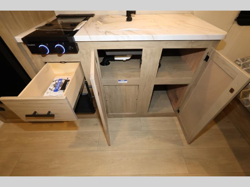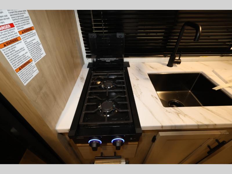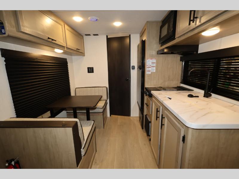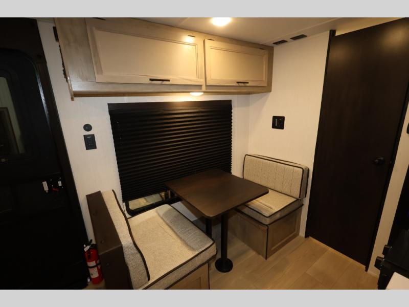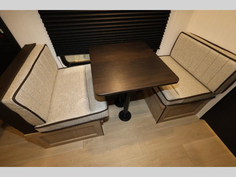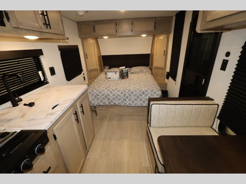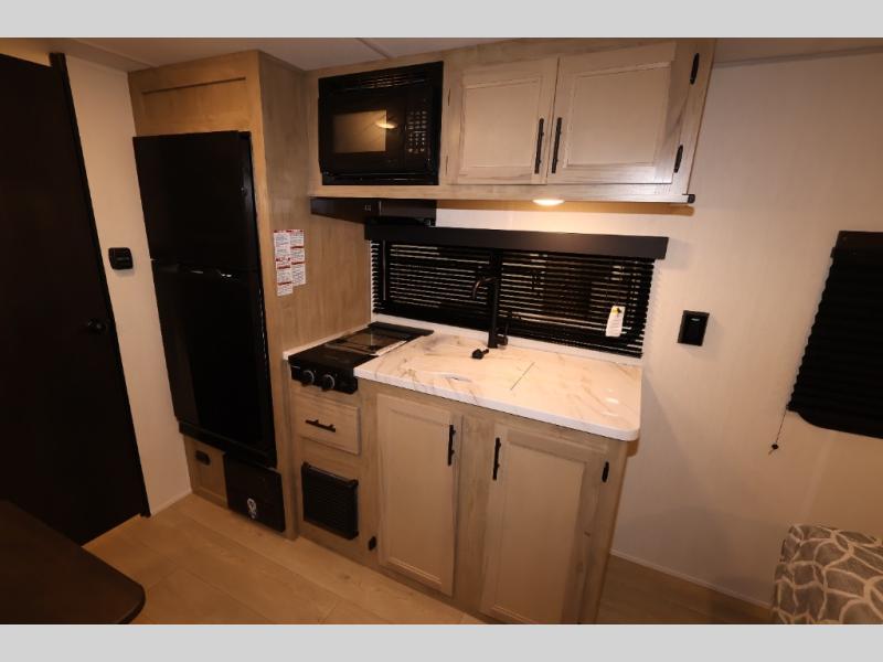 You will love camping in this travel trailer with a front queen bed. Freshen up each morning in the full rear bathroom with the tub/shower, a toilet, and sink. Fill your bellies with the perishables stored in the refrigerator and cook them on the cooktop then enjoy them at the booth dinette. You could even prepare a meal while breathing in some fresh air at the outside mini kitchen while staying protected by the 12' power awning. Easily store all of your outdoor gear in the outside storage area too!