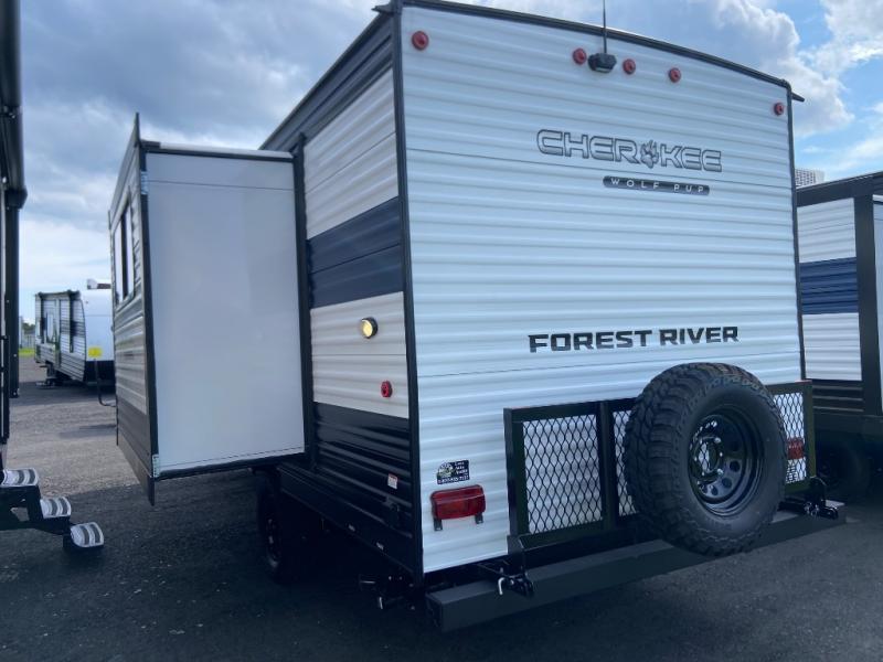 Each one of these Forest River Cherokee Wolf Pup travel trailers are lightweight and easy to tow! They are fully self contained with ample tank capacities, an abundance of storage space, and filled with at home amenities. The aerodynamic smooth radius front profile, the Power Gear frame technology, and the space saver rail design make them easier to maneuver. You will also appreciate the seamless roofing membrane with heat reflectivity to keep the sun from making your unit a hot box. The tongue and groove plywood flooring will hold up for years of fun and the USB charging stations help to keep your electronics at 100% while you're away. Come find the best model for you today!