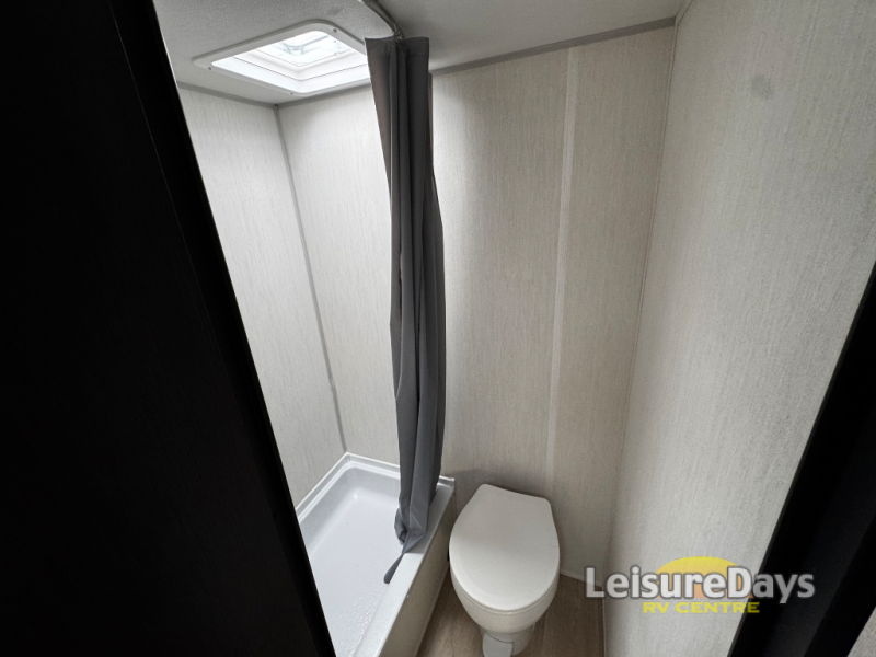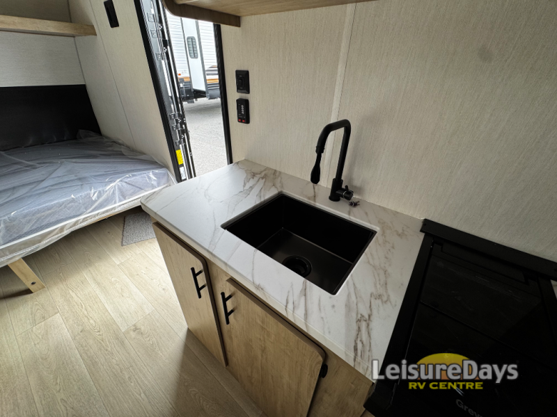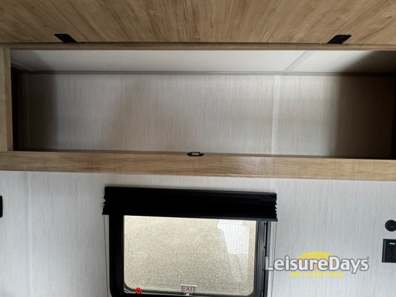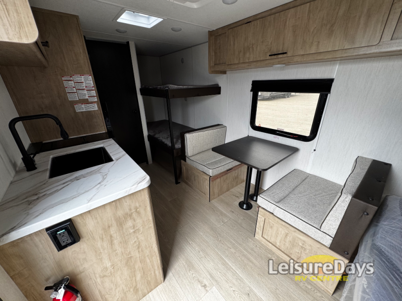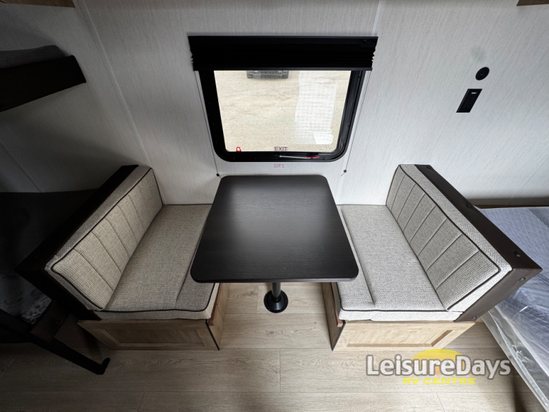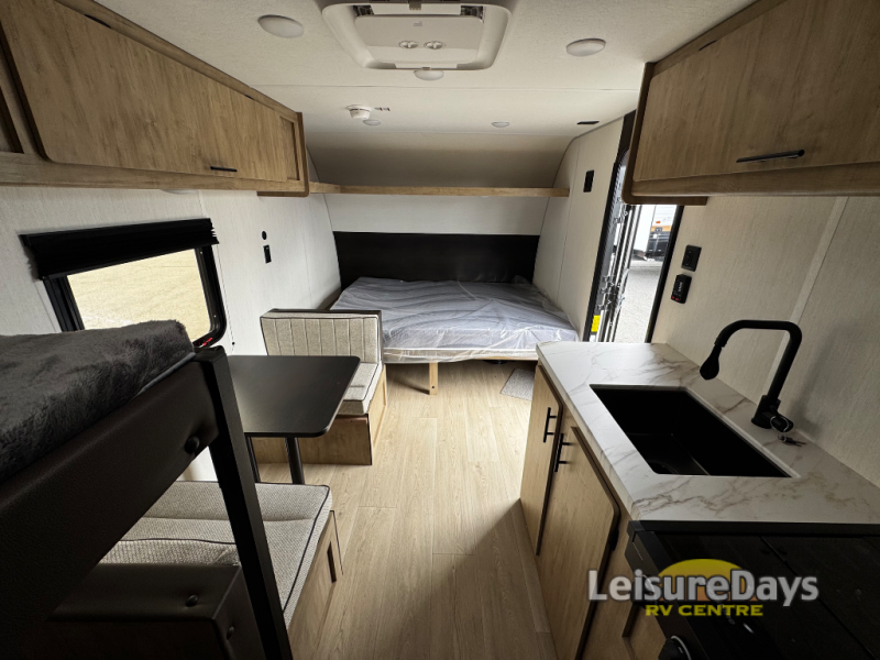 The whole family can sleep comfortably in this travel trailer! It has a set of bunk beds for the kids to sleep on, and you can sleep comfortably on the front queen bed with overhead cabinets and a shelf. The chef will enjoy preparing their best home cooked meals with the high output cooktop, and you can dine at the booth dinette. And the private bath onboard means you won't have to leave your camper in the middle of the night!