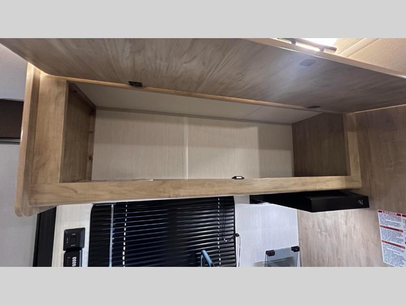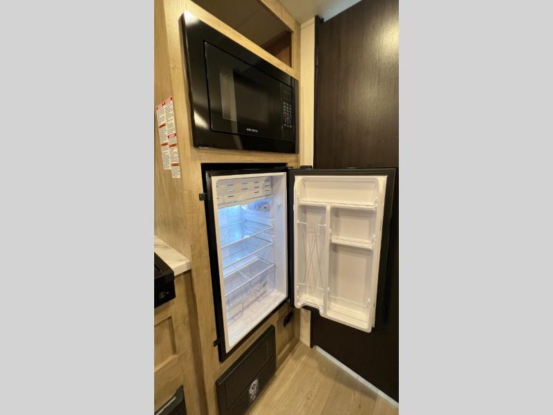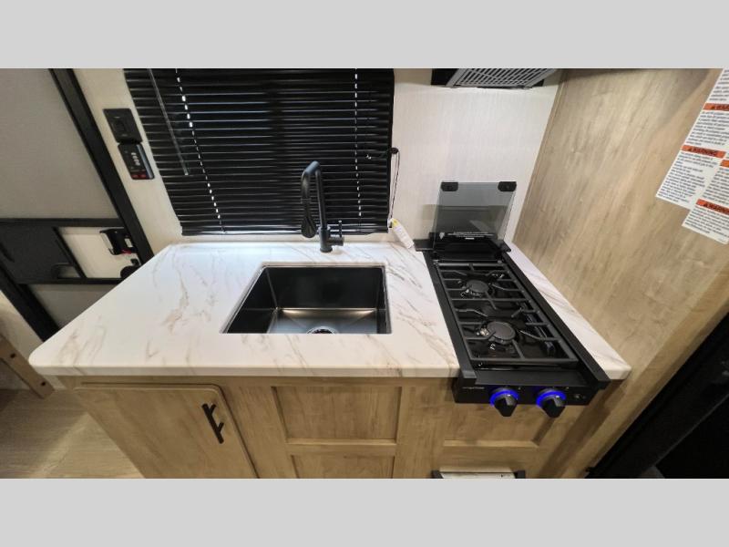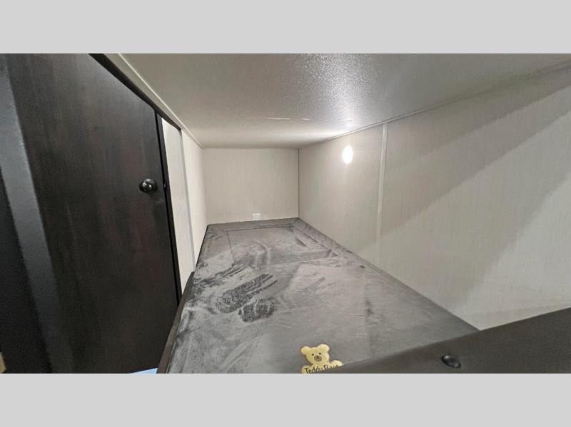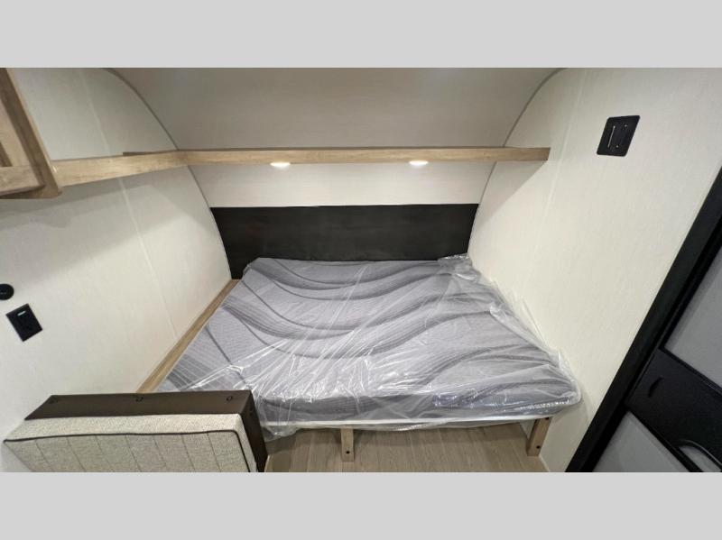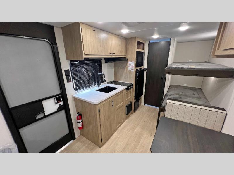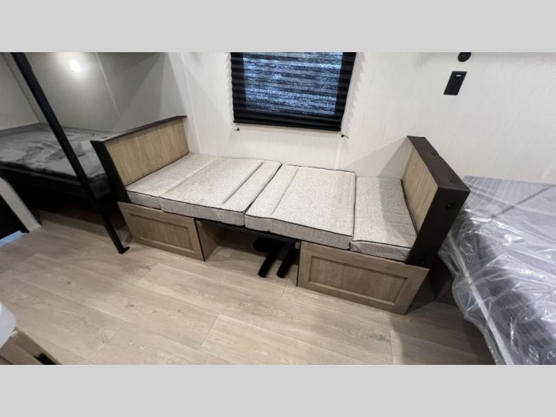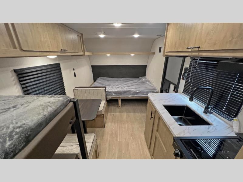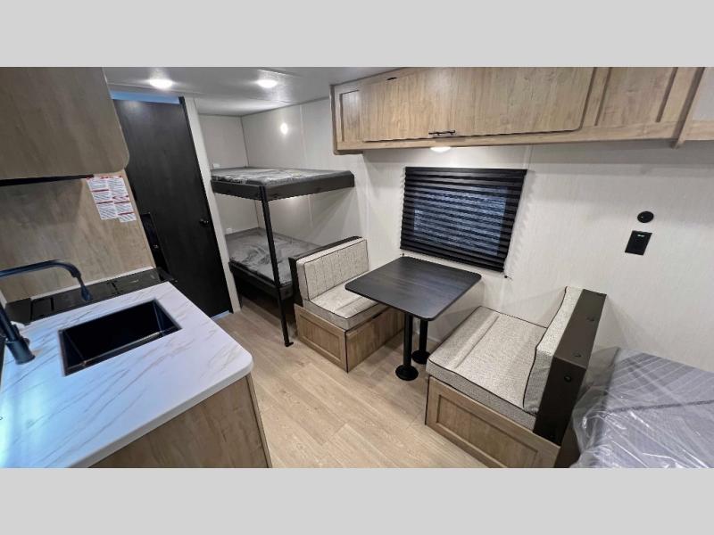 The whole family can sleep comfortably in this travel trailer! It has a set of bunk beds for the kids to sleep on, and you can sleep comfortably on the front queen bed with overhead cabinets and a shelf. The chef will enjoy preparing their best home cooked meals with the high output cooktop, and you can dine at the booth dinette. And the private bath onboard means you won't have to leave your camper in the middle of the night!
