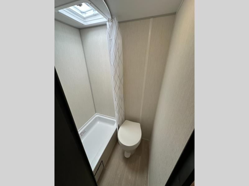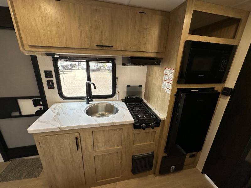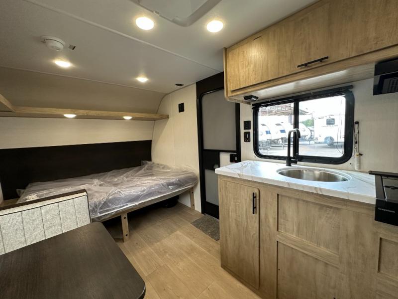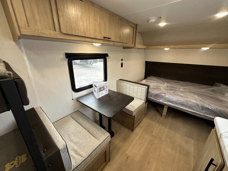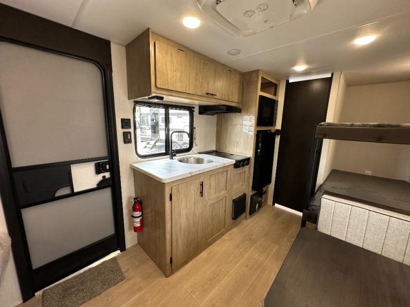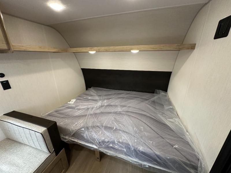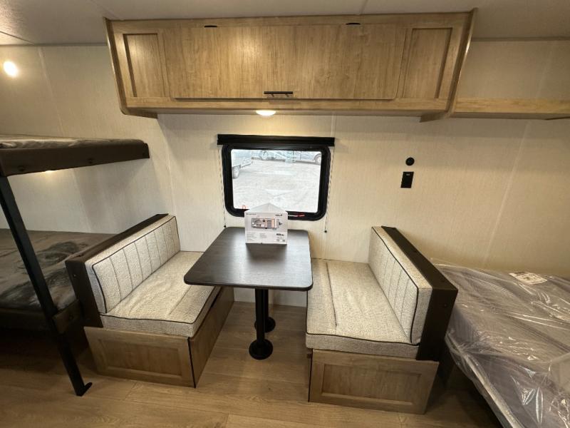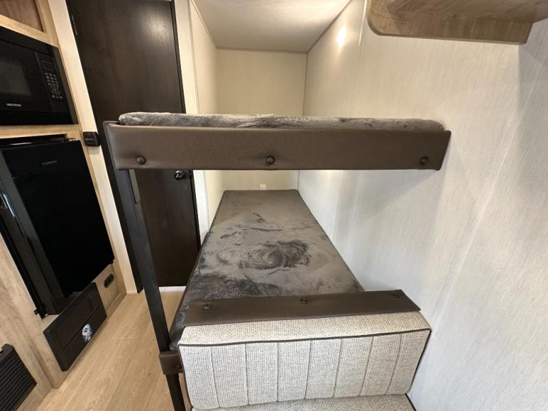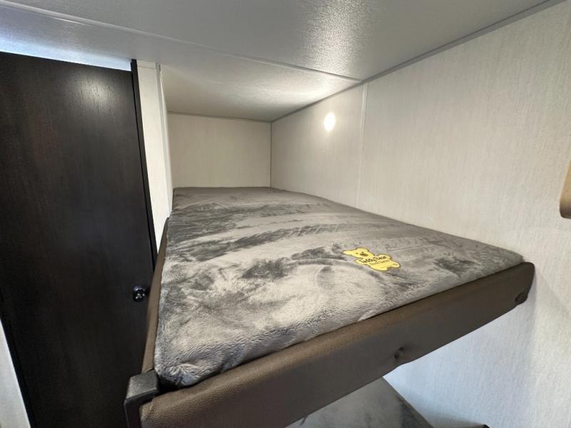 The whole family can sleep comfortably in this travel trailer! It has a set of bunk beds for the kids to sleep on, and you can sleep comfortably on the front queen bed with overhead cabinets and a shelf. The chef will enjoy preparing their best home cooked meals with the high output cooktop, and you can dine at the booth dinette. And the private bath onboard means you won't have to leave your camper in the middle of the night!