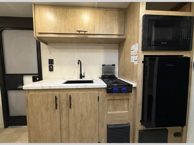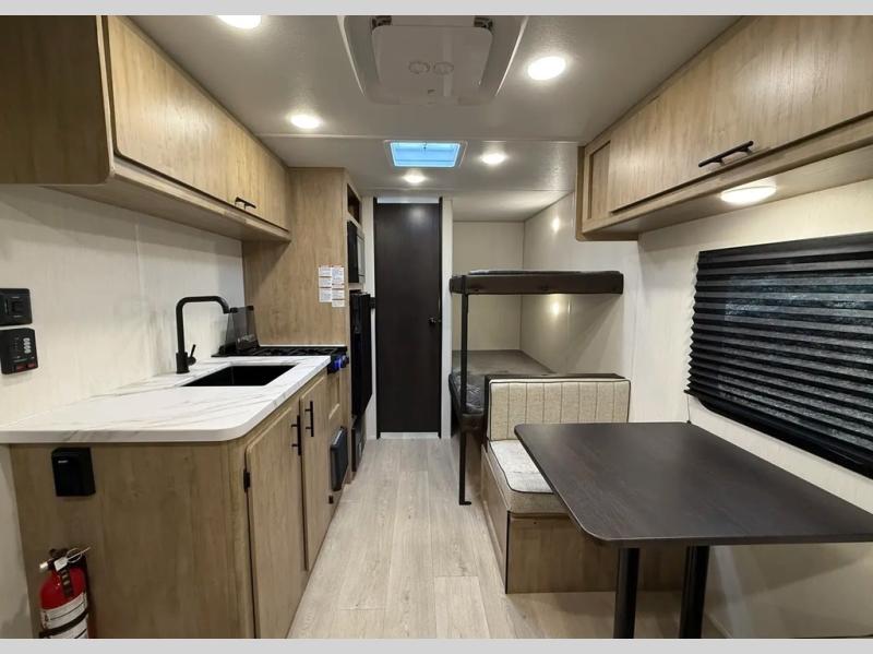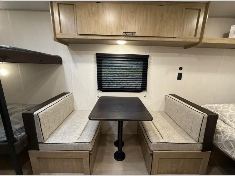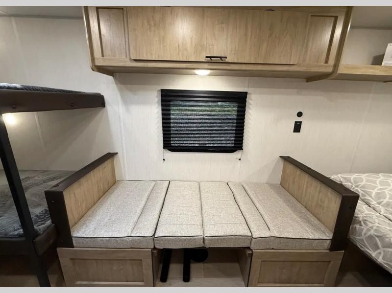 The whole family can sleep comfortably in this travel trailer! It has a set of bunk beds for the kids to sleep on, and you can sleep comfortably on the front queen bed with overhead cabinets and a shelf. The chef will enjoy preparing their best home cooked meals with the high output cooktop, and you can dine at the booth dinette. And the private bath onboard means you won't have to leave your camper in the middle of the night!