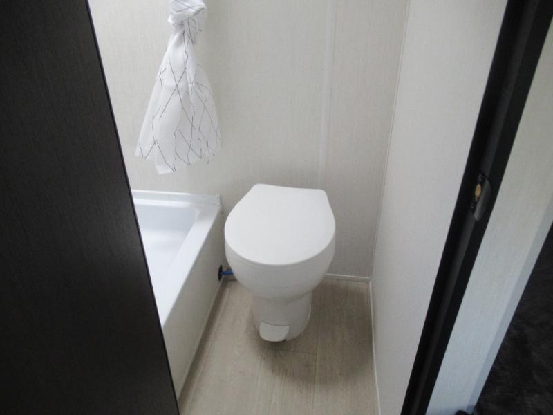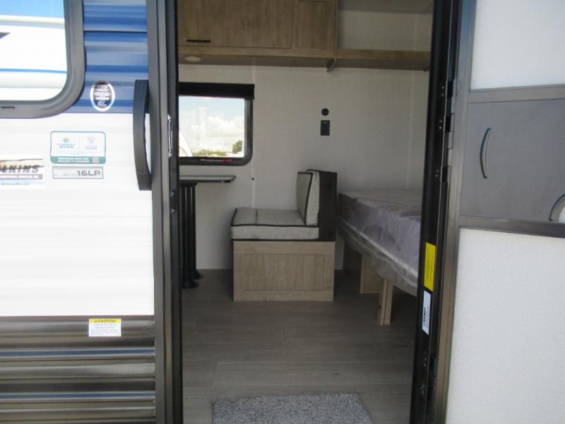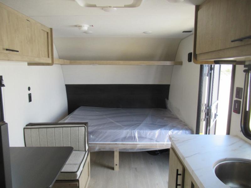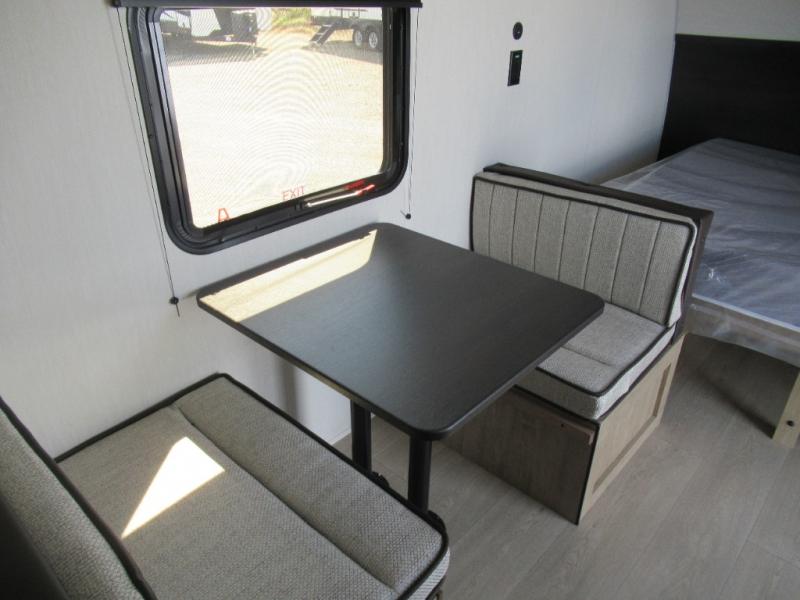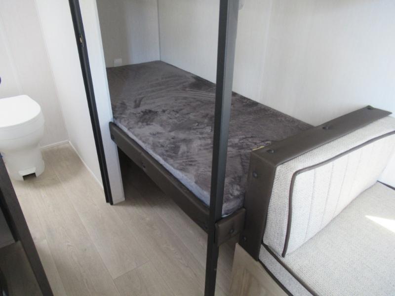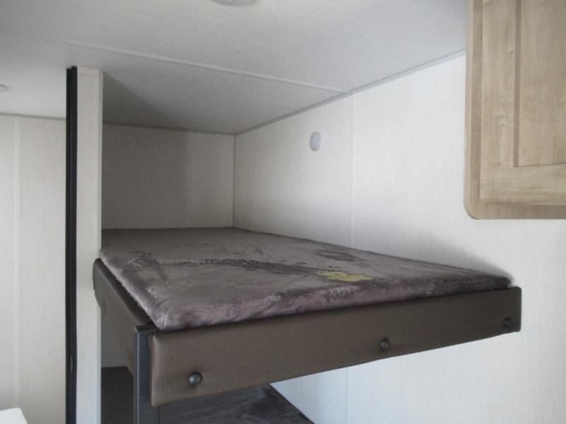 The whole family can sleep comfortably in this travel trailer! It has a set of bunk beds for the kids to sleep on, and you can sleep comfortably on the front queen bed with overhead cabinets and a shelf. The chef will enjoy preparing their best home cooked meals with the high output cooktop, and you can dine at the booth dinette. And the private bath onboard means you won't have to leave your camper in the middle of the night!