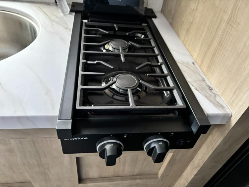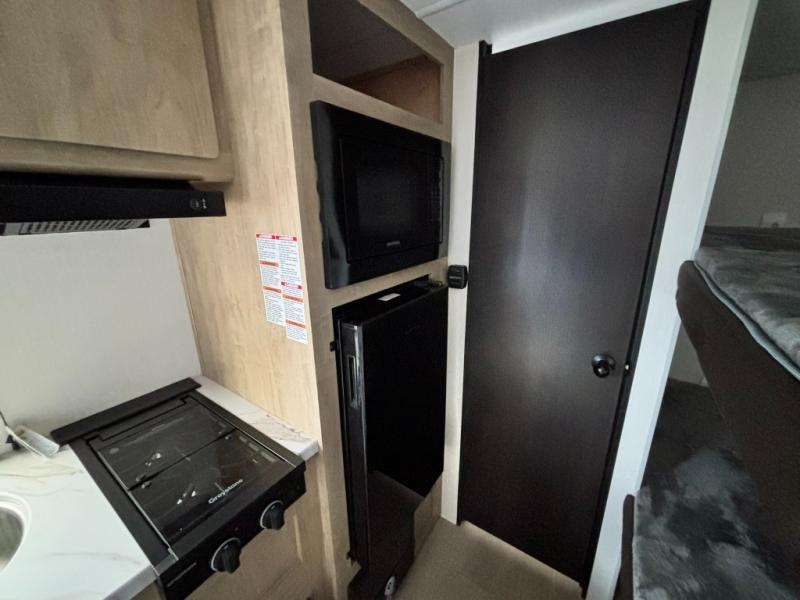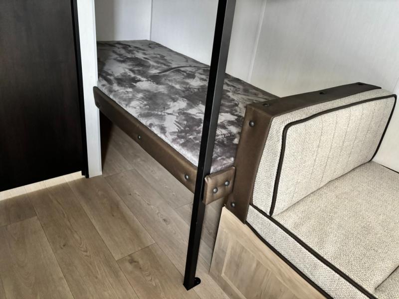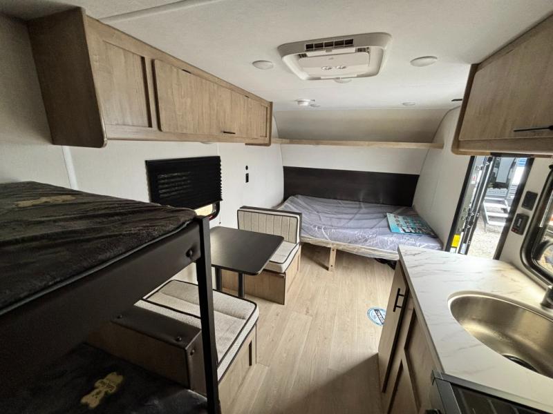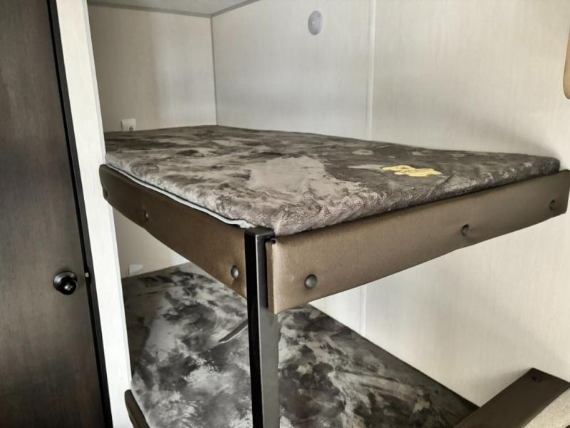 The whole family can sleep comfortably in this travel trailer! It has a set of bunk beds for the kids to sleep on, and you can sleep comfortably on the front queen bed with overhead cabinets and a shelf. The chef will enjoy preparing their best home cooked meals with the high output cooktop, and you can dine at the booth dinette. And the private bath onboard means you won't have to leave your camper in the middle of the night!