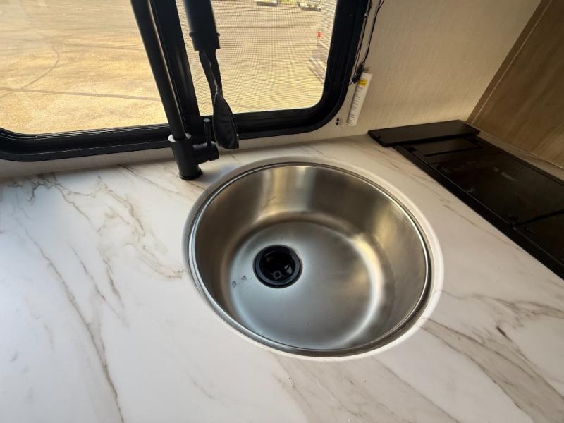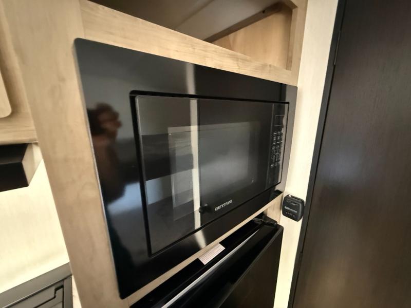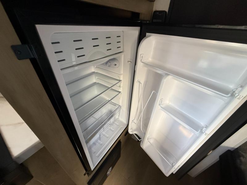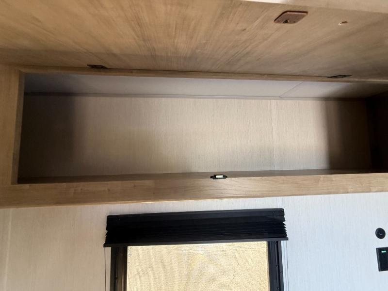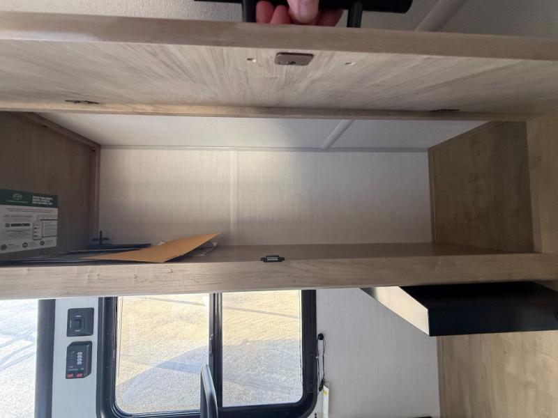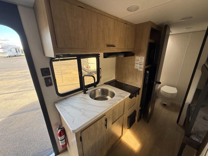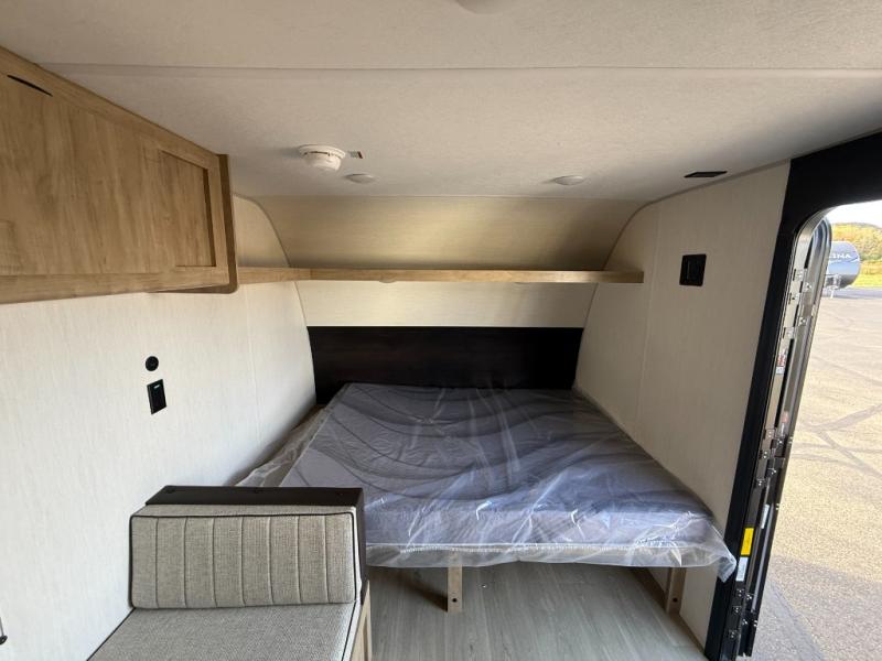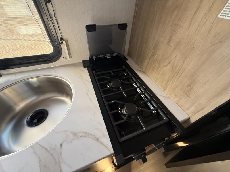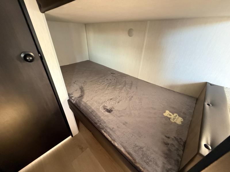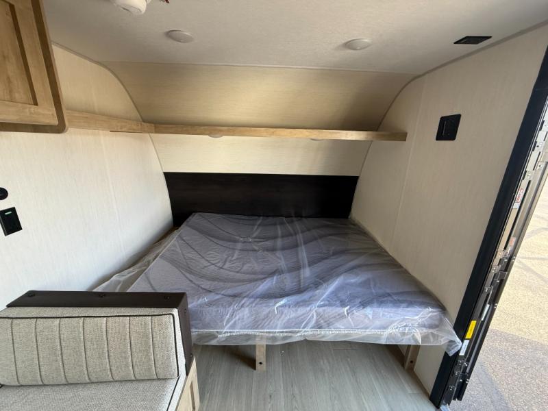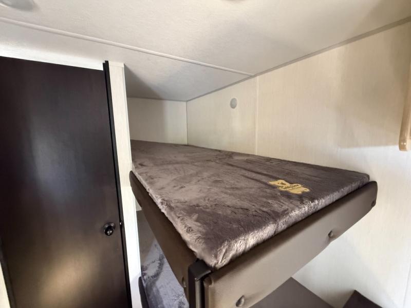 The whole family can sleep comfortably in this travel trailer! It has a set of bunk beds for the kids to sleep on, and you can sleep comfortably on the front queen bed with overhead cabinets and a shelf. The chef will enjoy preparing their best home cooked meals with the cooktop, and you can dine at the booth dinette. And the private bath onboard means you won't have to leave your camper in the middle of the night!
