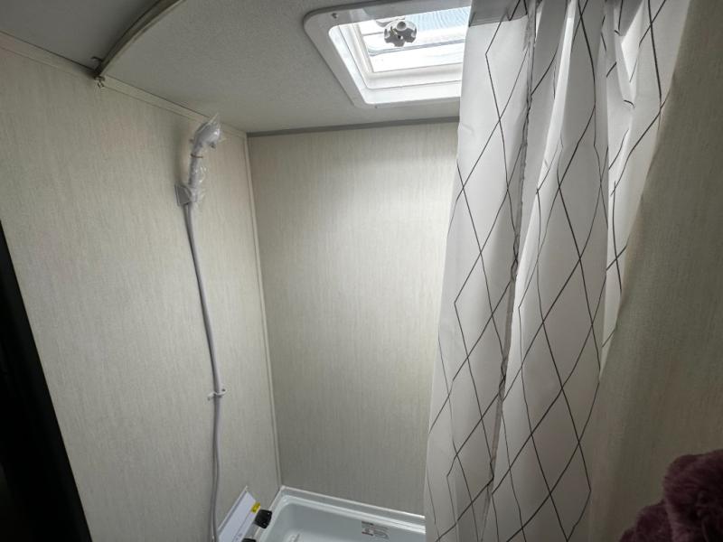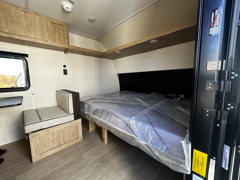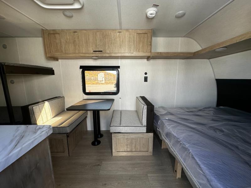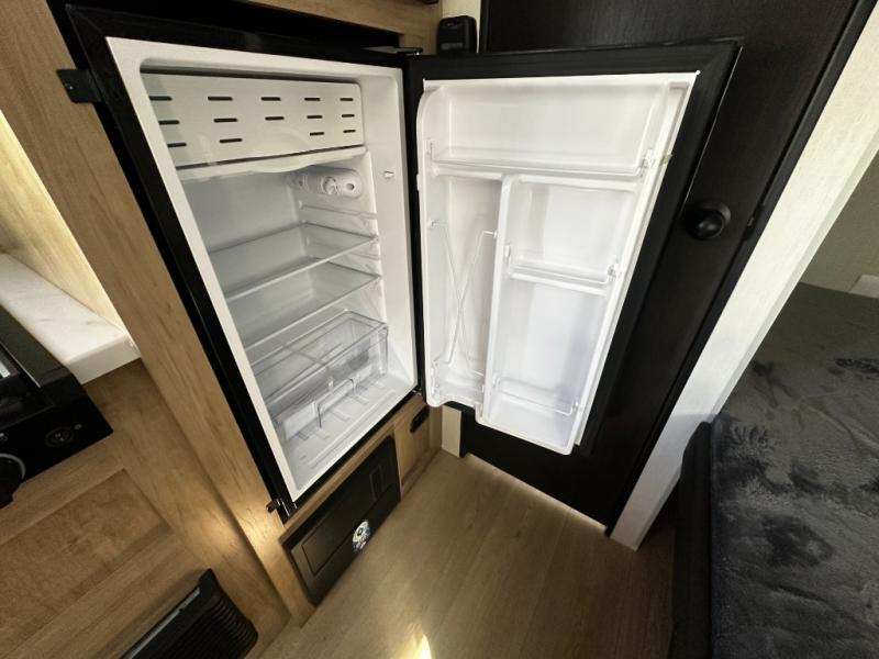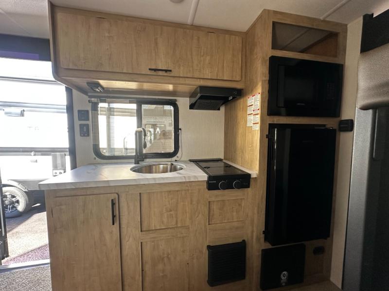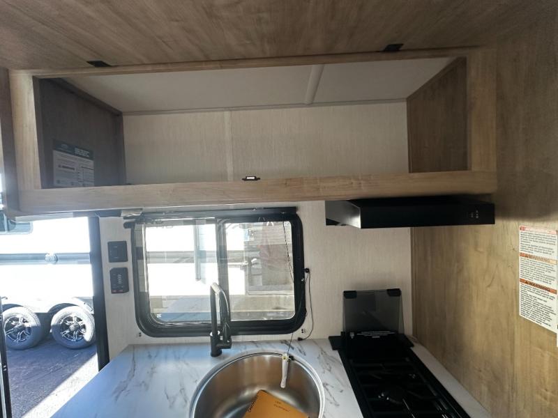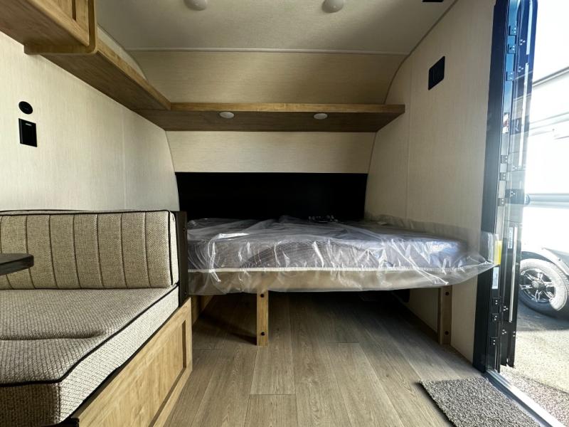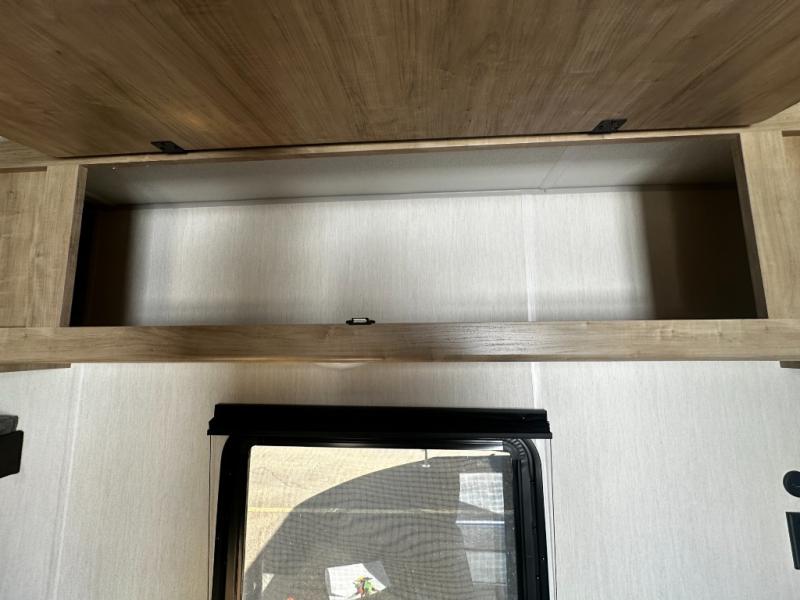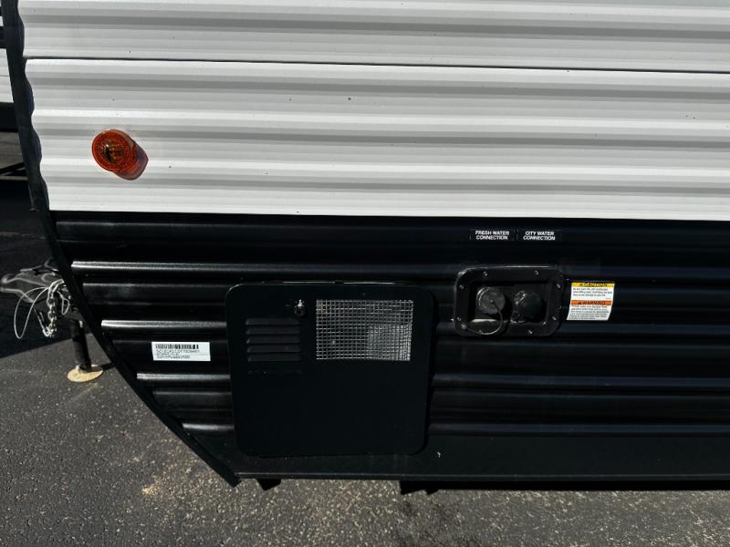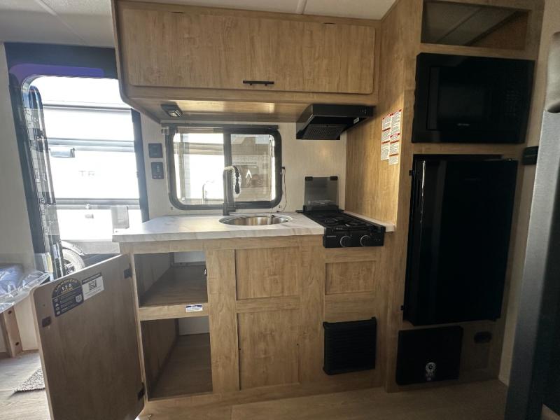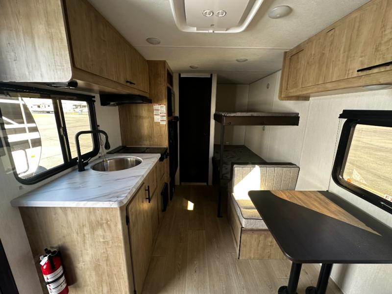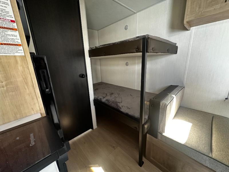 The whole family can sleep comfortably in this travel trailer! It has a set of bunk beds for the kids to sleep on, and you can sleep comfortably on the front queen bed with overhead cabinets and a shelf. The chef will enjoy preparing their best home cooked meals with the cooktop, and you can dine at the booth dinette. And the private bath onboard means you won't have to leave your camper in the middle of the night!