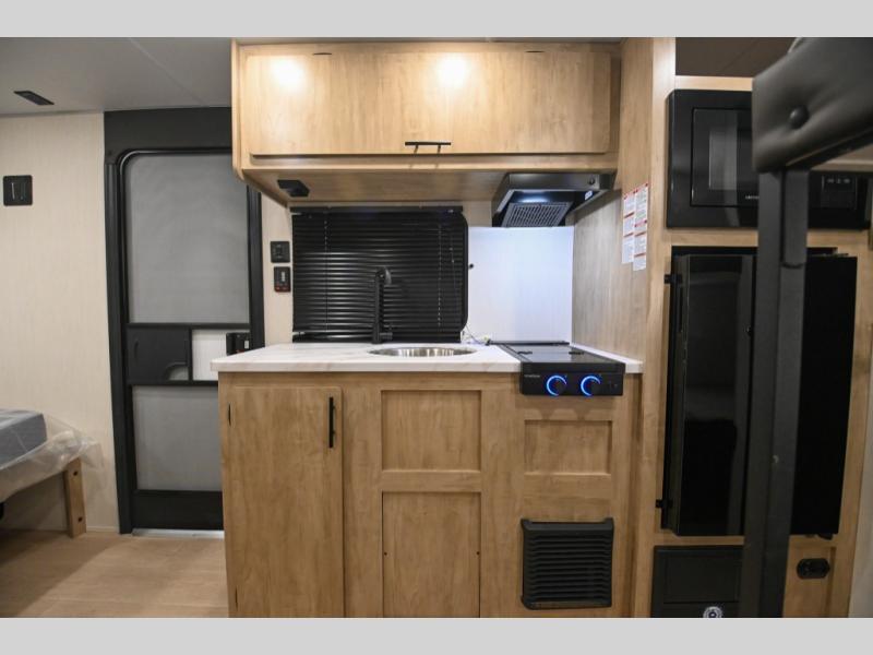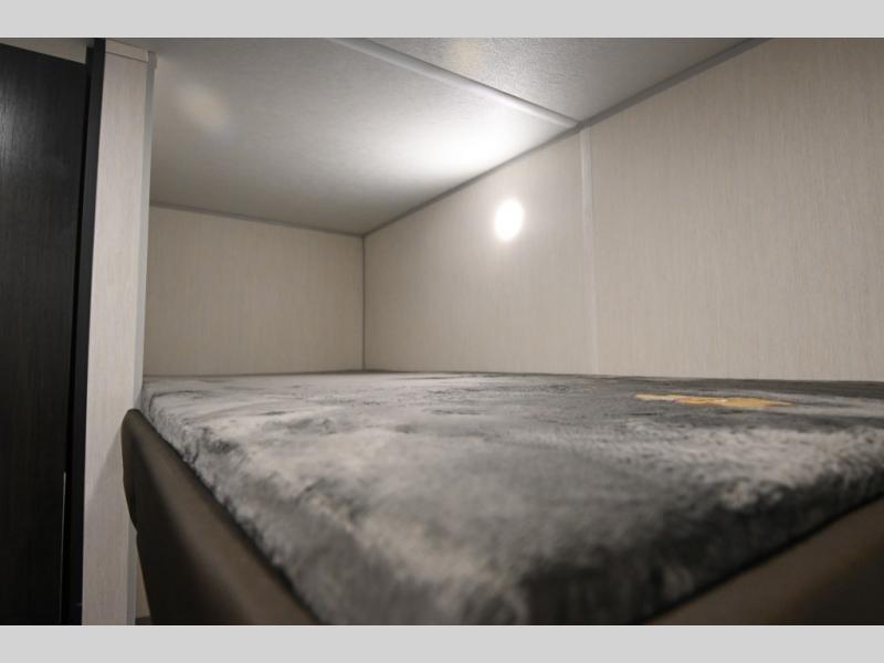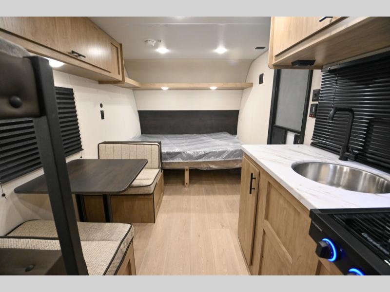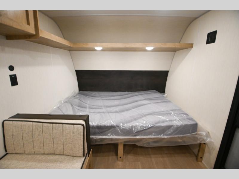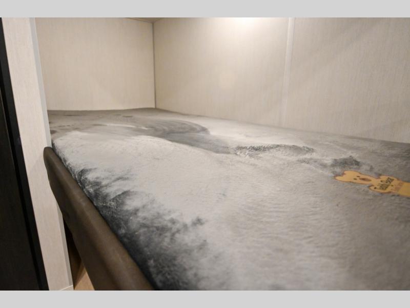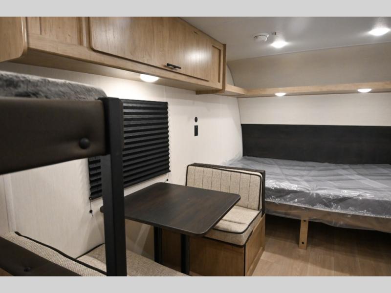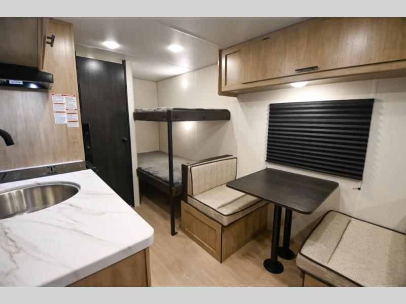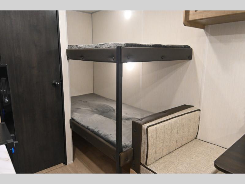 The whole family can sleep comfortably in this travel trailer! It has a set of bunk beds for the kids to sleep on, and you can sleep comfortably on the front queen bed with overhead cabinets and a shelf. The chef will enjoy preparing their best home cooked meals with the high output cooktop, and you can dine at the booth dinette. And the private bath onboard means you won't have to leave your camper in the middle of the night!