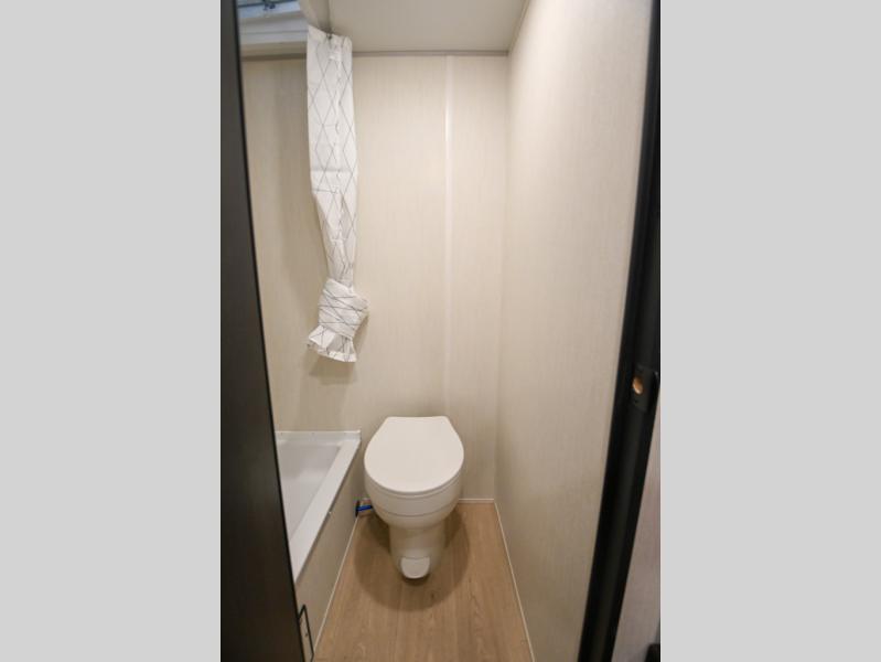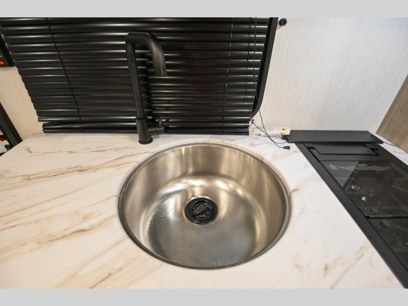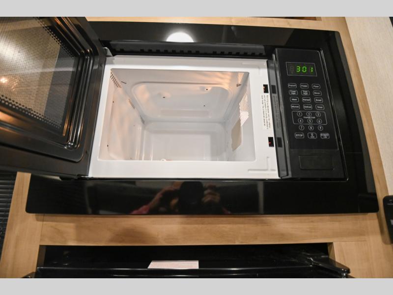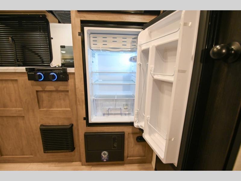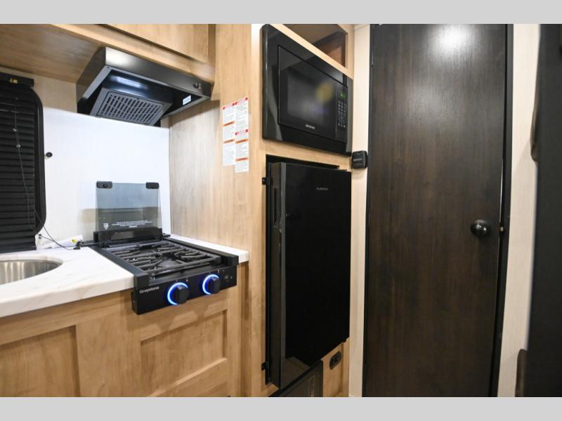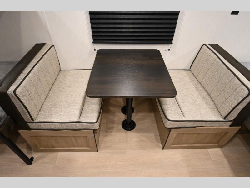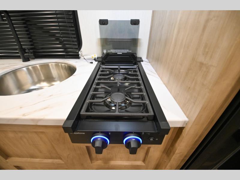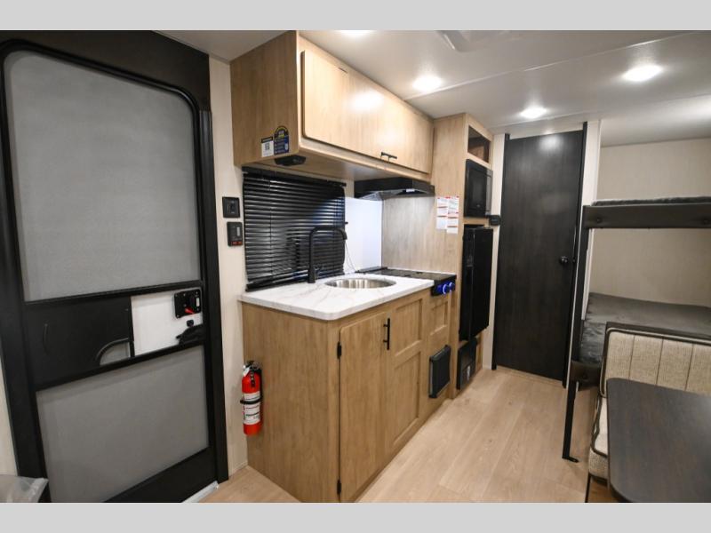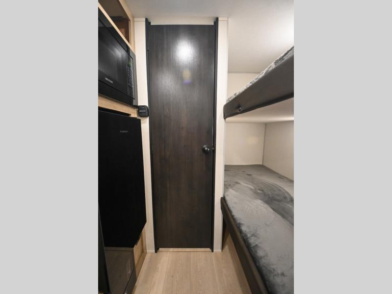 The whole family can sleep comfortably in this travel trailer! It has a set of bunk beds for the kids to sleep on, and you can sleep comfortably on the front queen bed with overhead cabinets and a shelf. The chef will enjoy preparing their best home cooked meals with the high output cooktop, and you can dine at the booth dinette. And the private bath onboard means you won't have to leave your camper in the middle of the night!