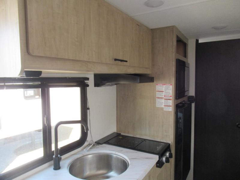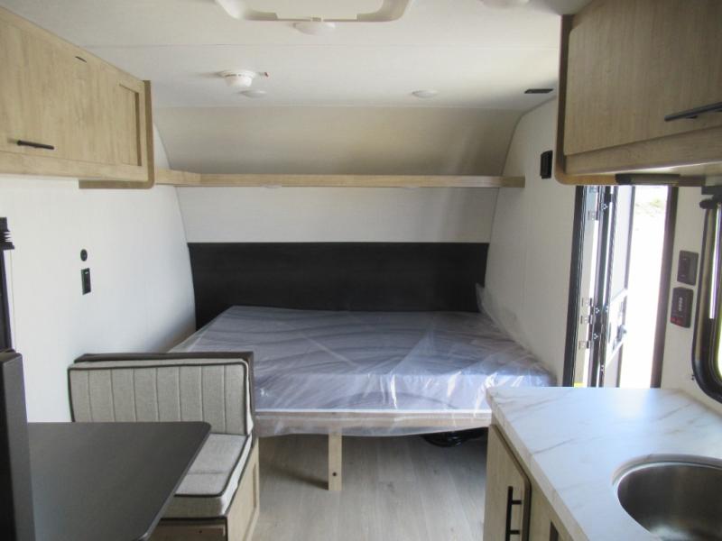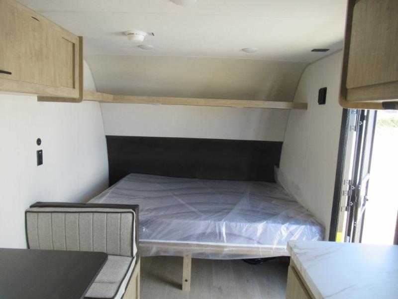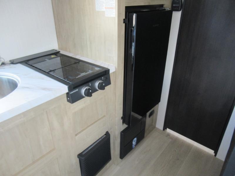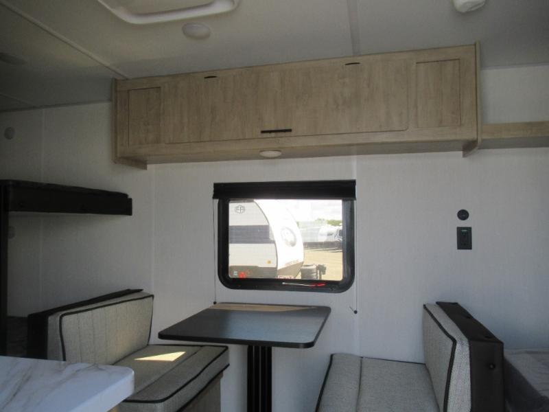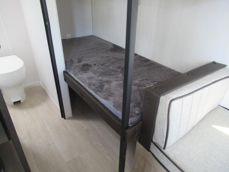 The whole family can sleep comfortably in this travel trailer! It has a set of bunk beds for the kids to sleep on, and you can sleep comfortably on the front queen bed with overhead cabinets and a shelf. The chef will enjoy preparing their best home cooked meals with the cooktop, and you can dine at the booth dinette. And the private bath onboard means you won't have to leave your camper in the middle of the night!