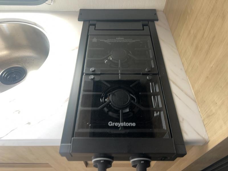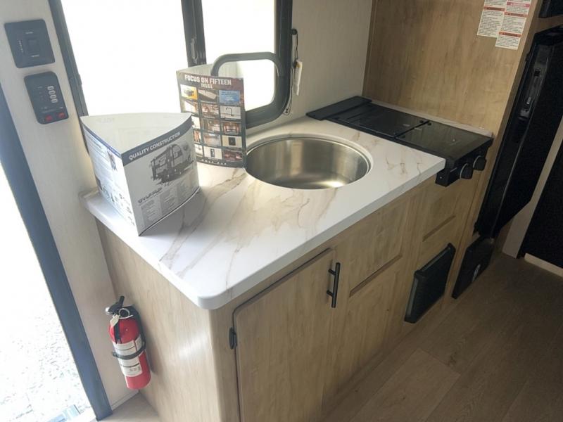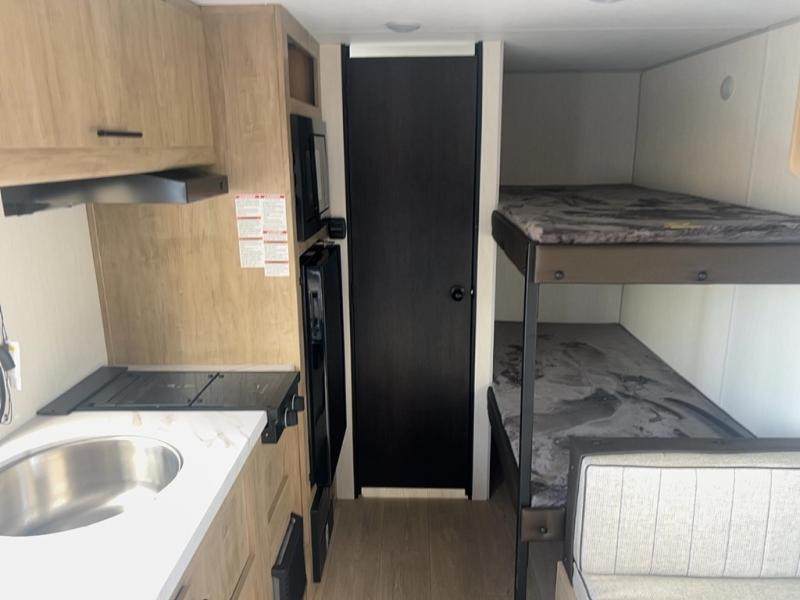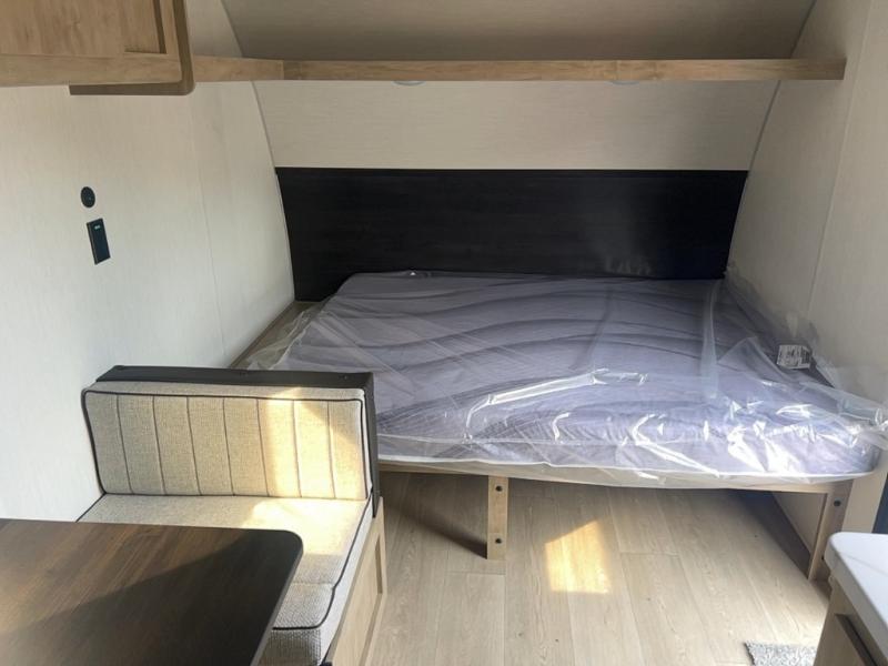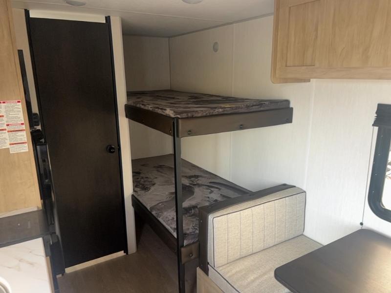 The whole family can sleep comfortably in this travel trailer! It has a set of bunk beds for the kids to sleep on, and you can sleep comfortably on the front queen bed with overhead cabinets and a shelf. The chef will enjoy preparing their best home cooked meals with the high output cooktop, and you can dine at the booth dinette. And the private bath onboard means you won't have to leave your camper in the middle of the night!