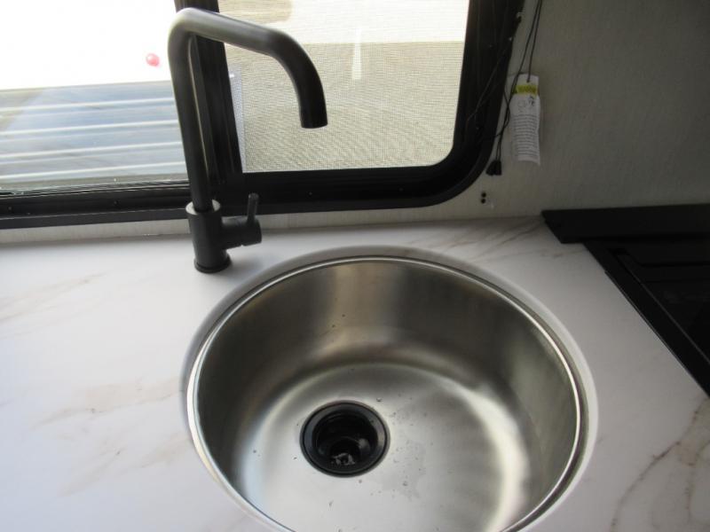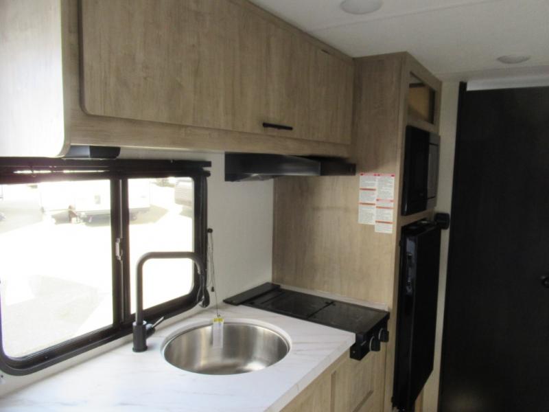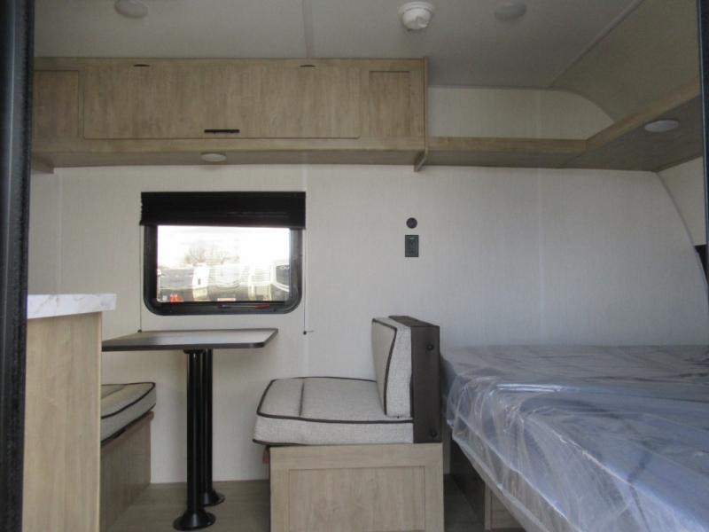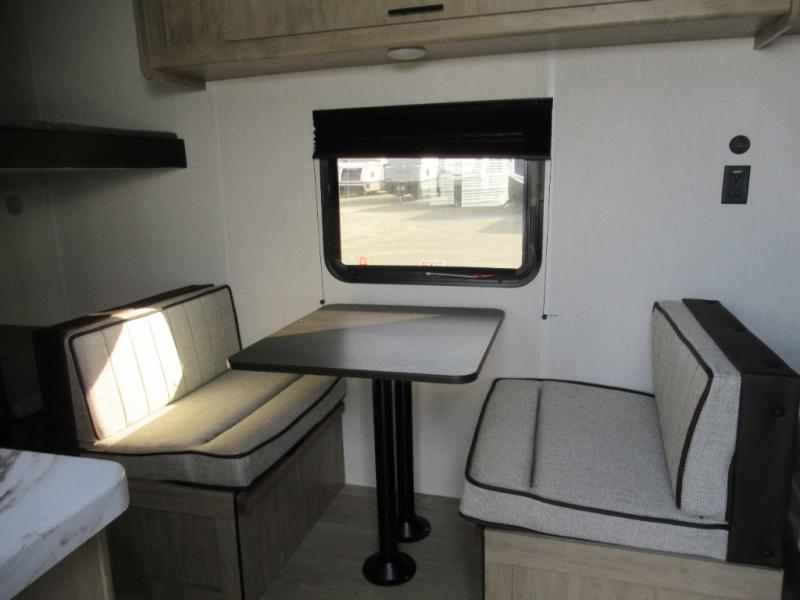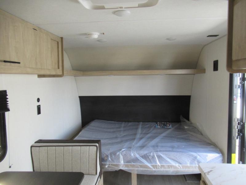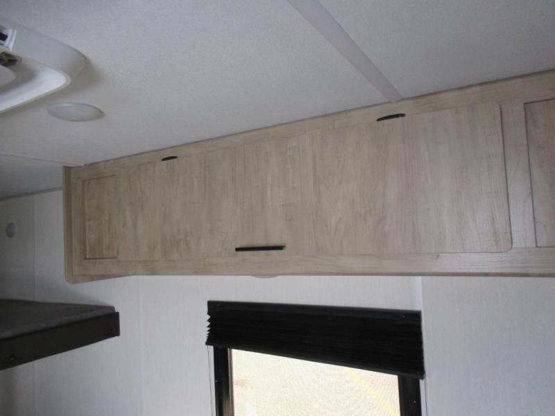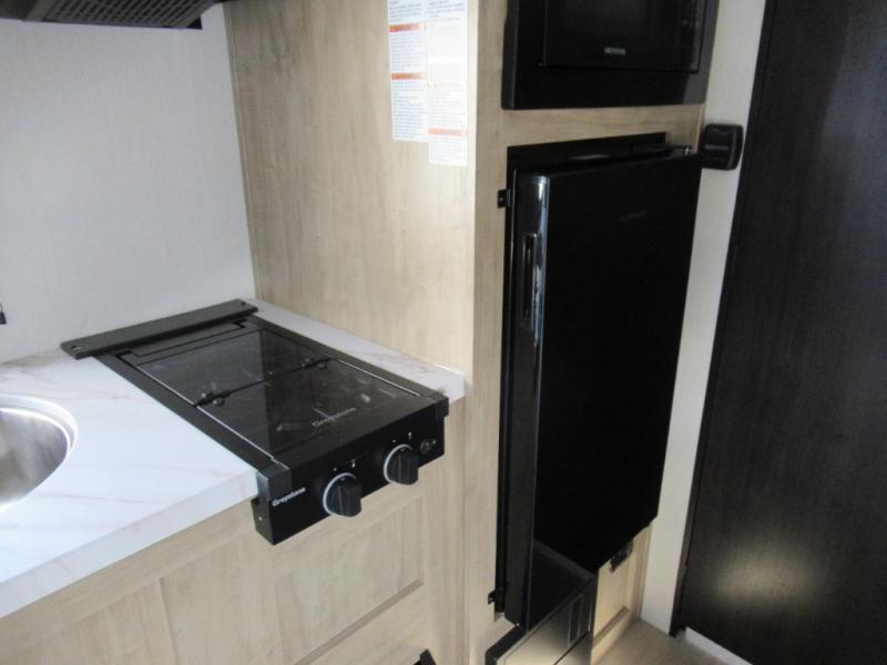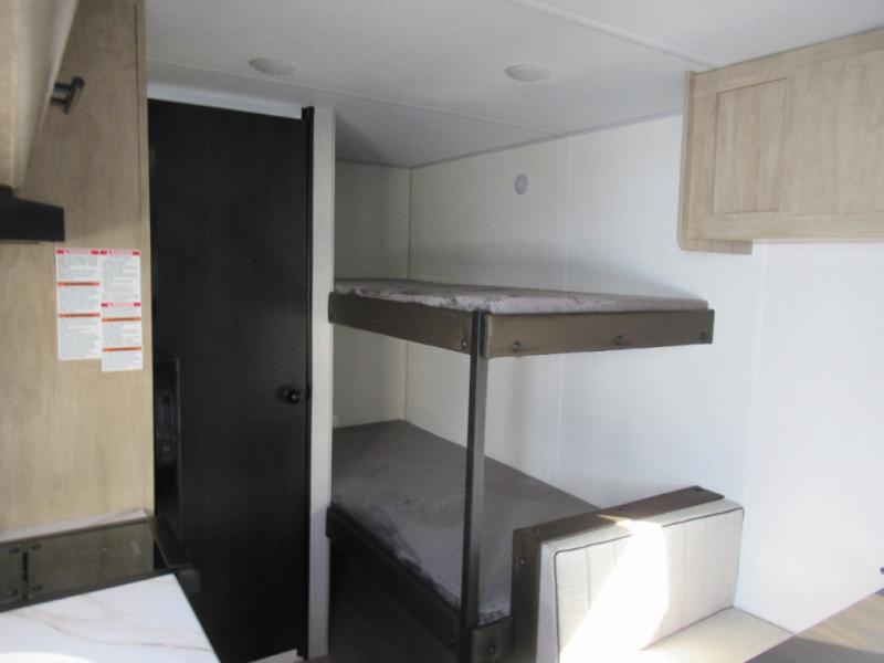 The whole family can sleep comfortably in this travel trailer! It has a set of bunk beds for the kids to sleep on, and you can sleep comfortably on the front queen bed with overhead cabinets and a shelf. The chef will enjoy preparing their best home cooked meals with the cooktop, and you can dine at the booth dinette. And the private bath onboard means you won't have to leave your camper in the middle of the night!