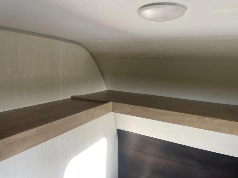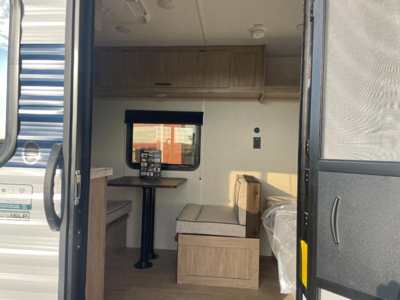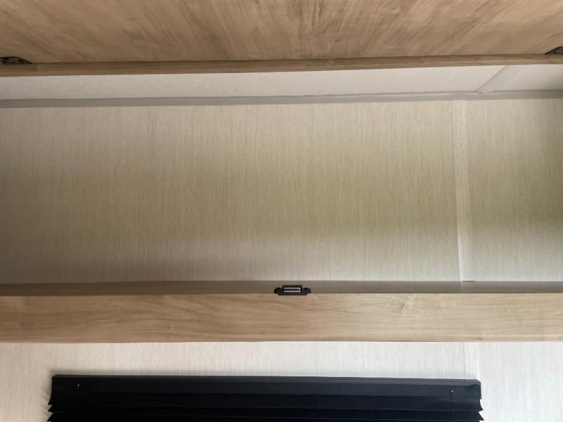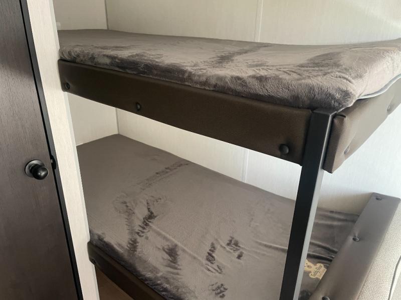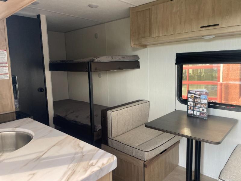 The whole family can sleep comfortably in this travel trailer! It has a set of bunk beds for the kids to sleep on, and you can sleep comfortably on the front queen bed with overhead cabinets and a shelf. The chef will enjoy preparing their best home cooked meals with the cooktop, and you can dine at the booth dinette. And the private bath onboard means you won't have to leave your camper in the middle of the night!