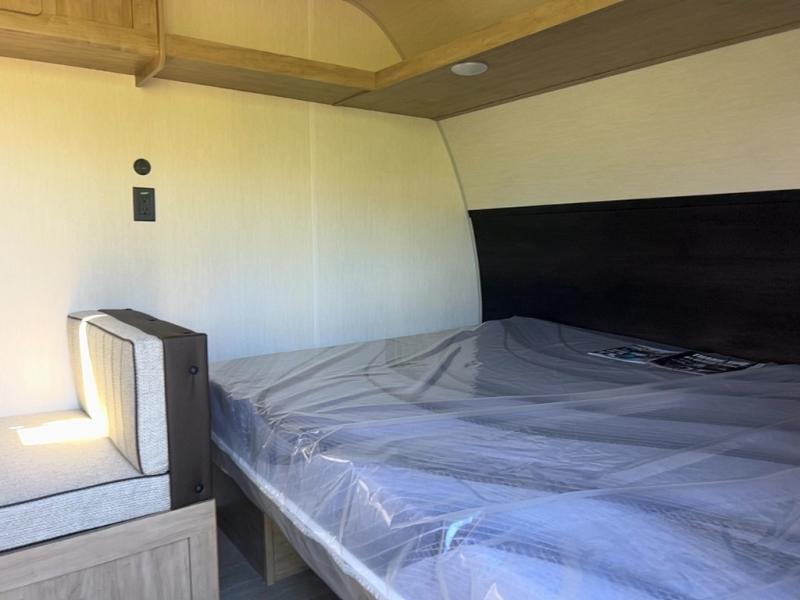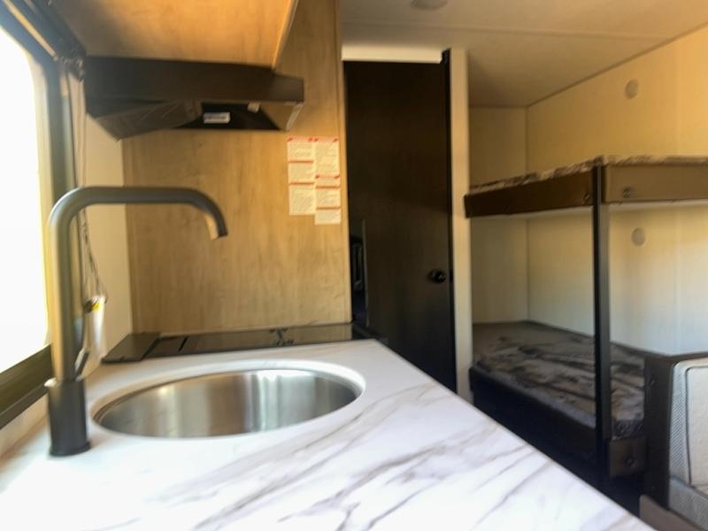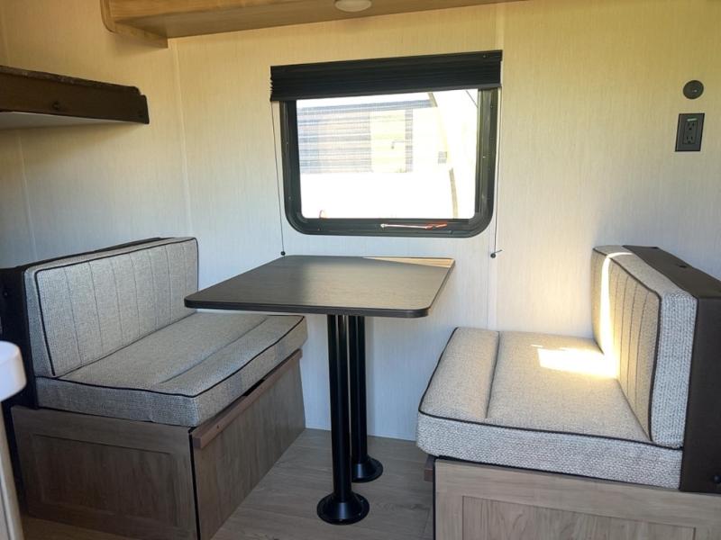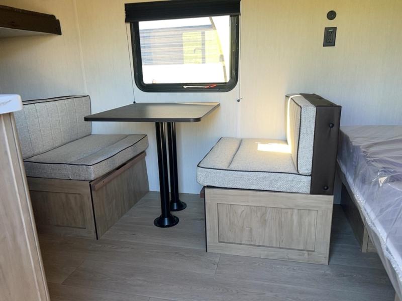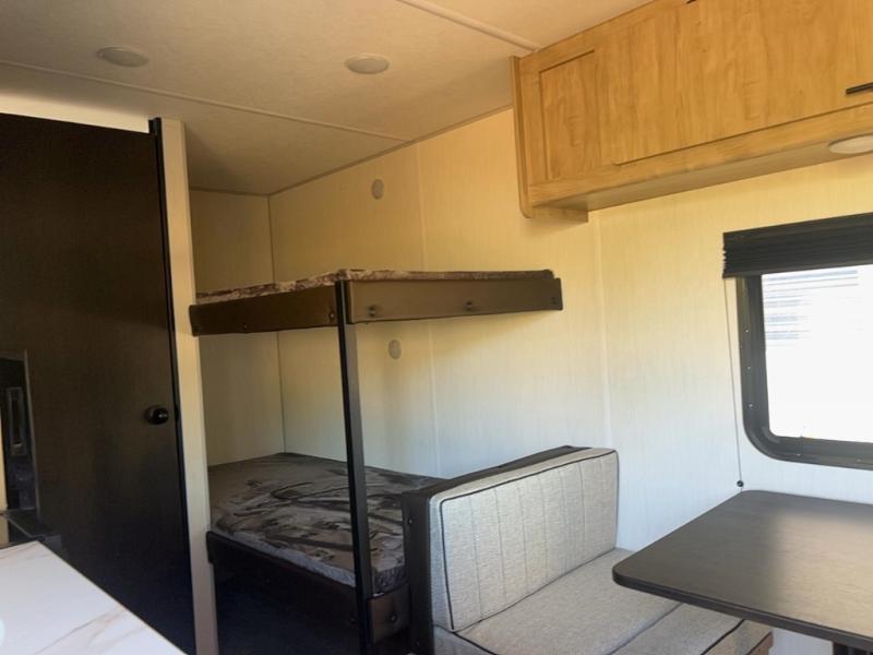 The whole family can sleep comfortably in this travel trailer! It has a set of bunk beds for the kids to sleep on, and you can sleep comfortably on the front queen bed with overhead cabinets and a shelf. The chef will enjoy preparing their best home cooked meals with the cooktop, and you can dine at the booth dinette. And the private bath onboard means you won't have to leave your camper in the middle of the night!