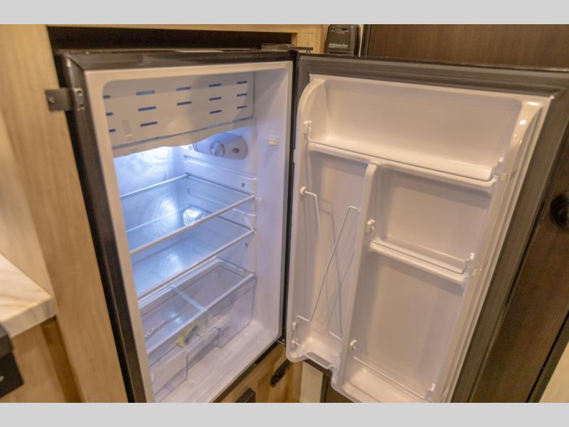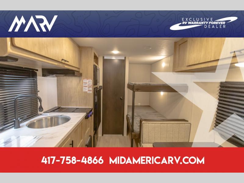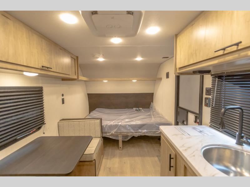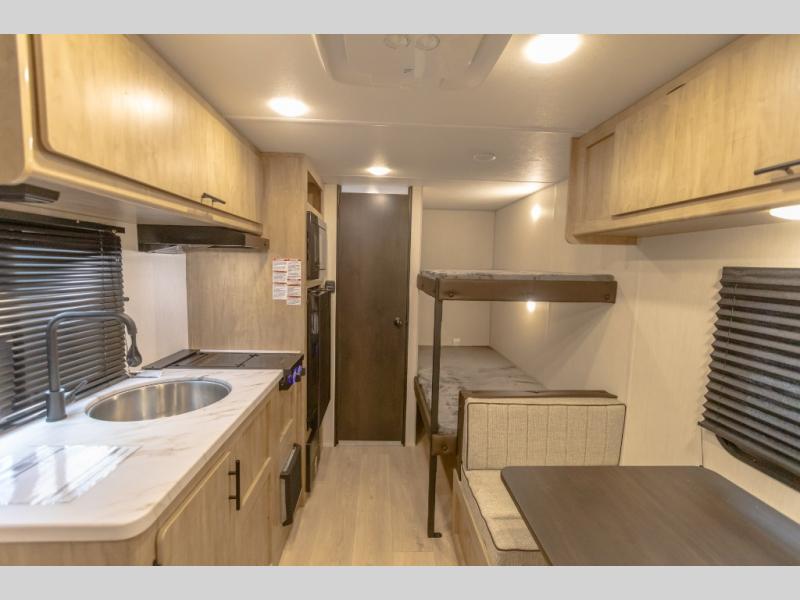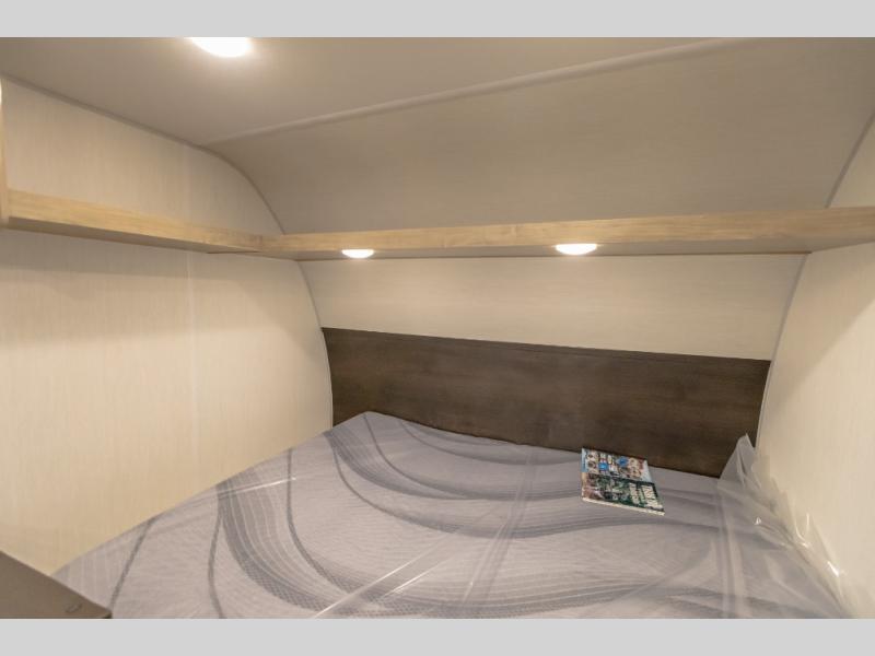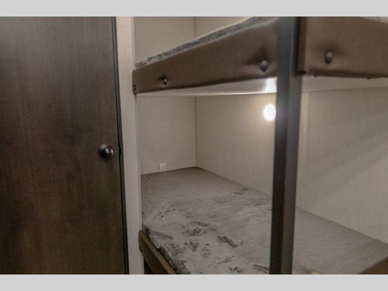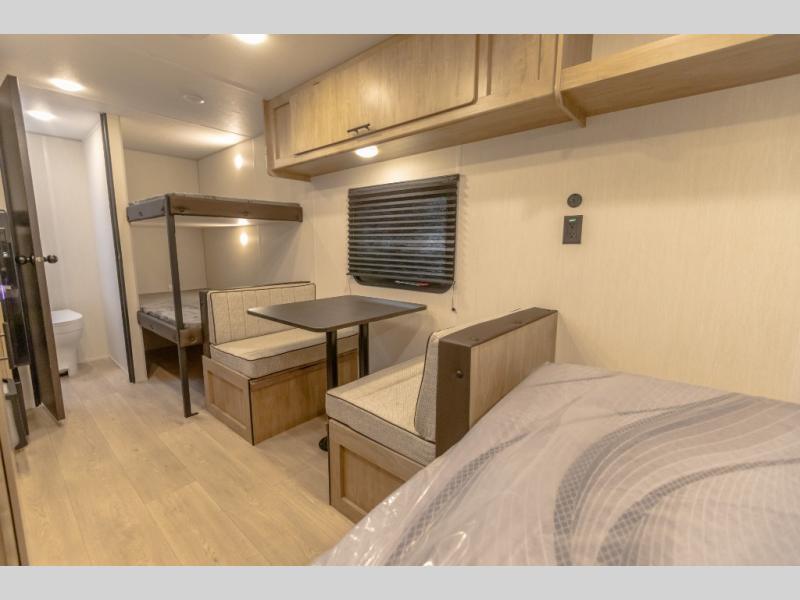 The whole family can sleep comfortably in this travel trailer! It has a set of bunk beds for the kids to sleep on, and you can sleep comfortably on the front queen bed with overhead cabinets and a shelf. The chef will enjoy preparing their best home cooked meals with the cooktop, and you can dine at the booth dinette. And the private bath onboard means you won't have to leave your camper in the middle of the night!